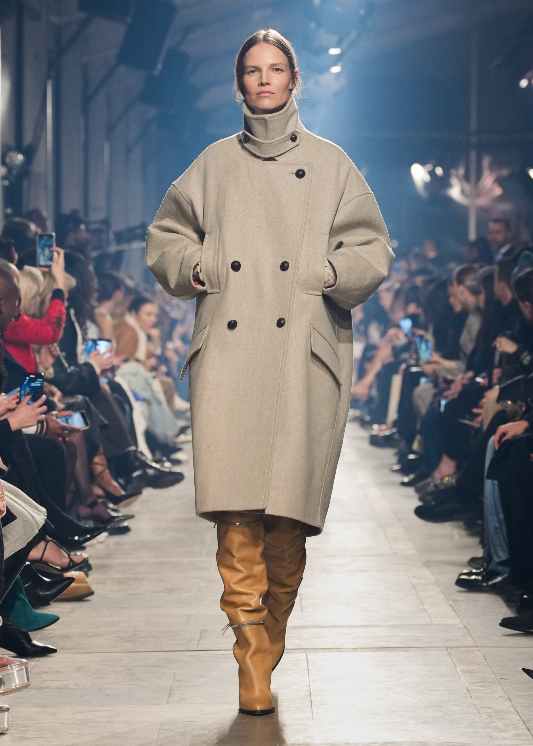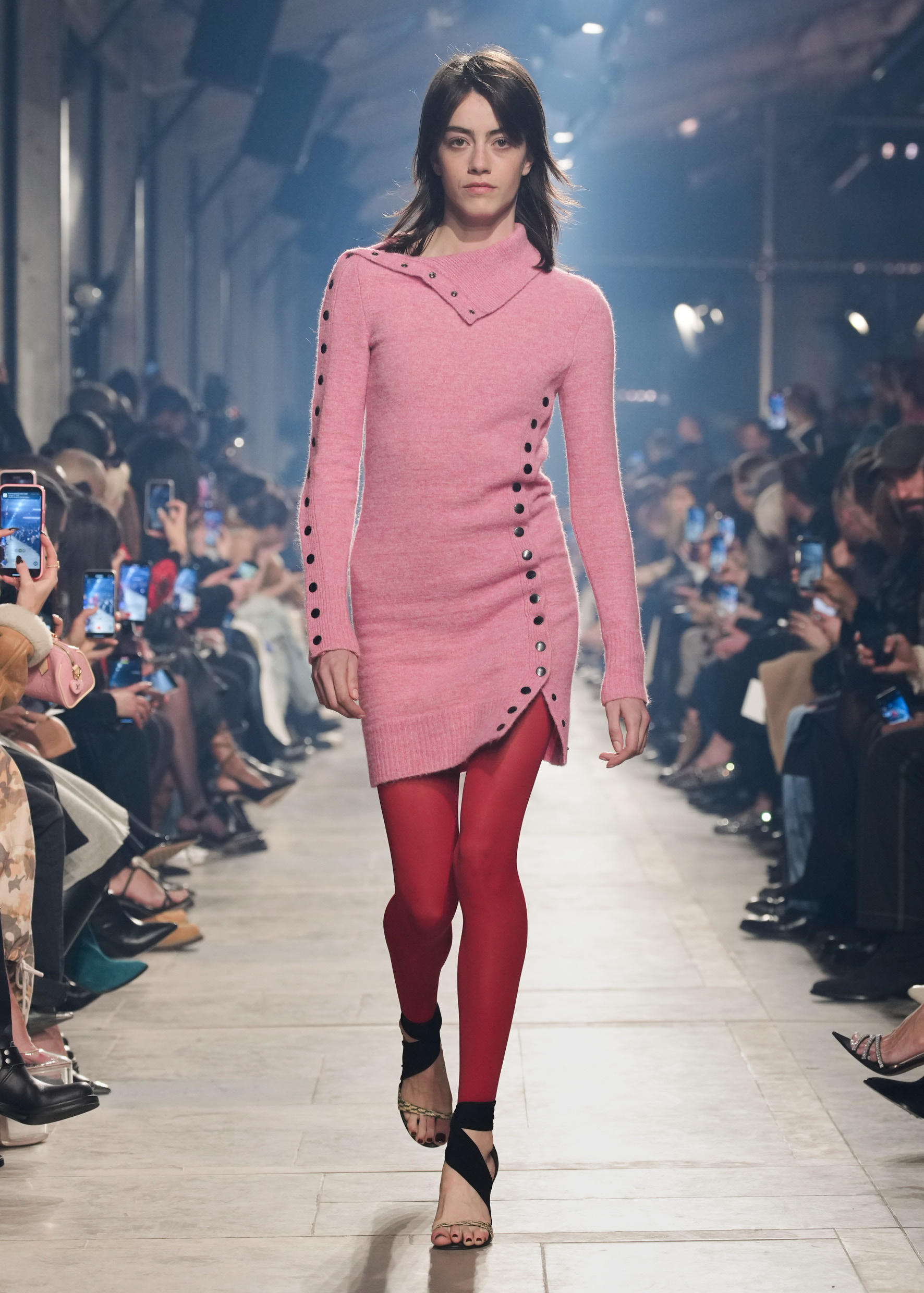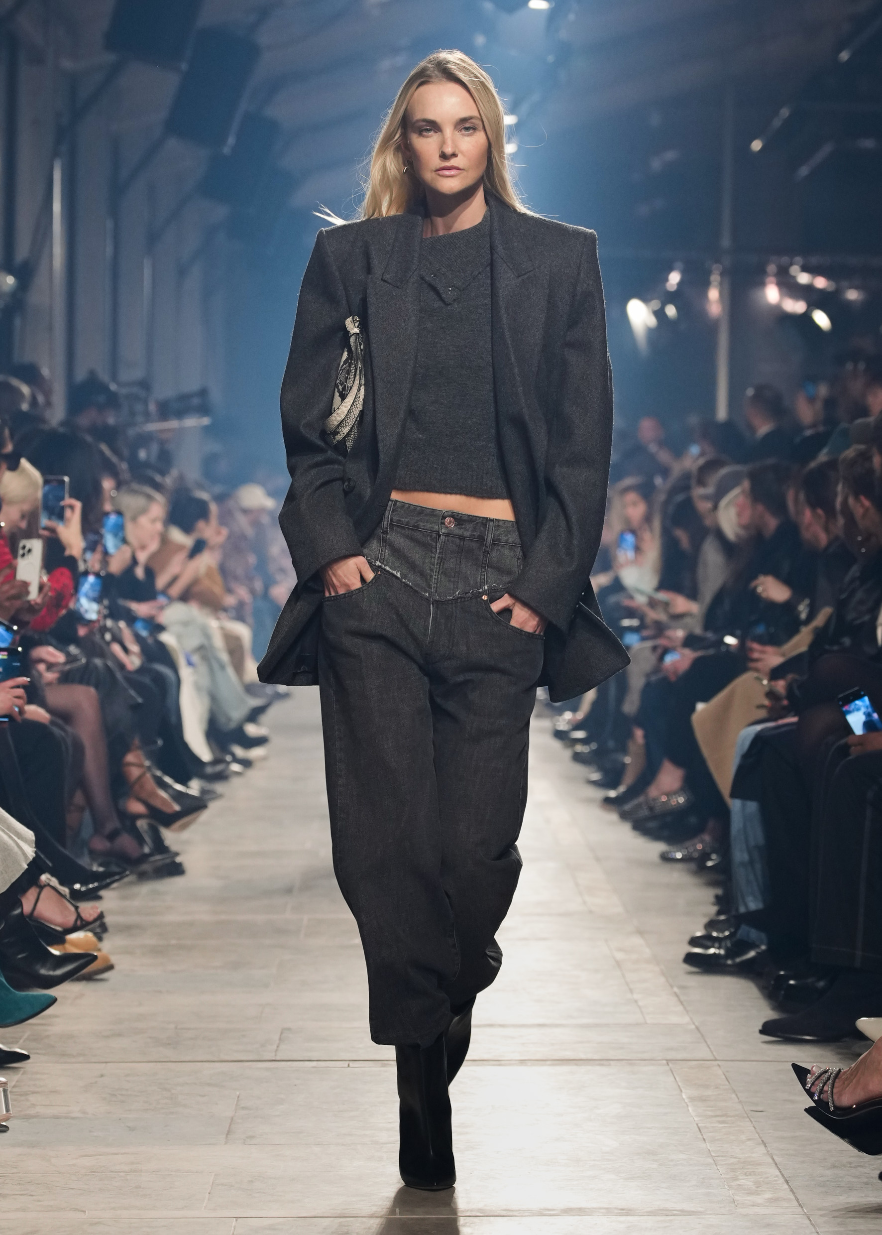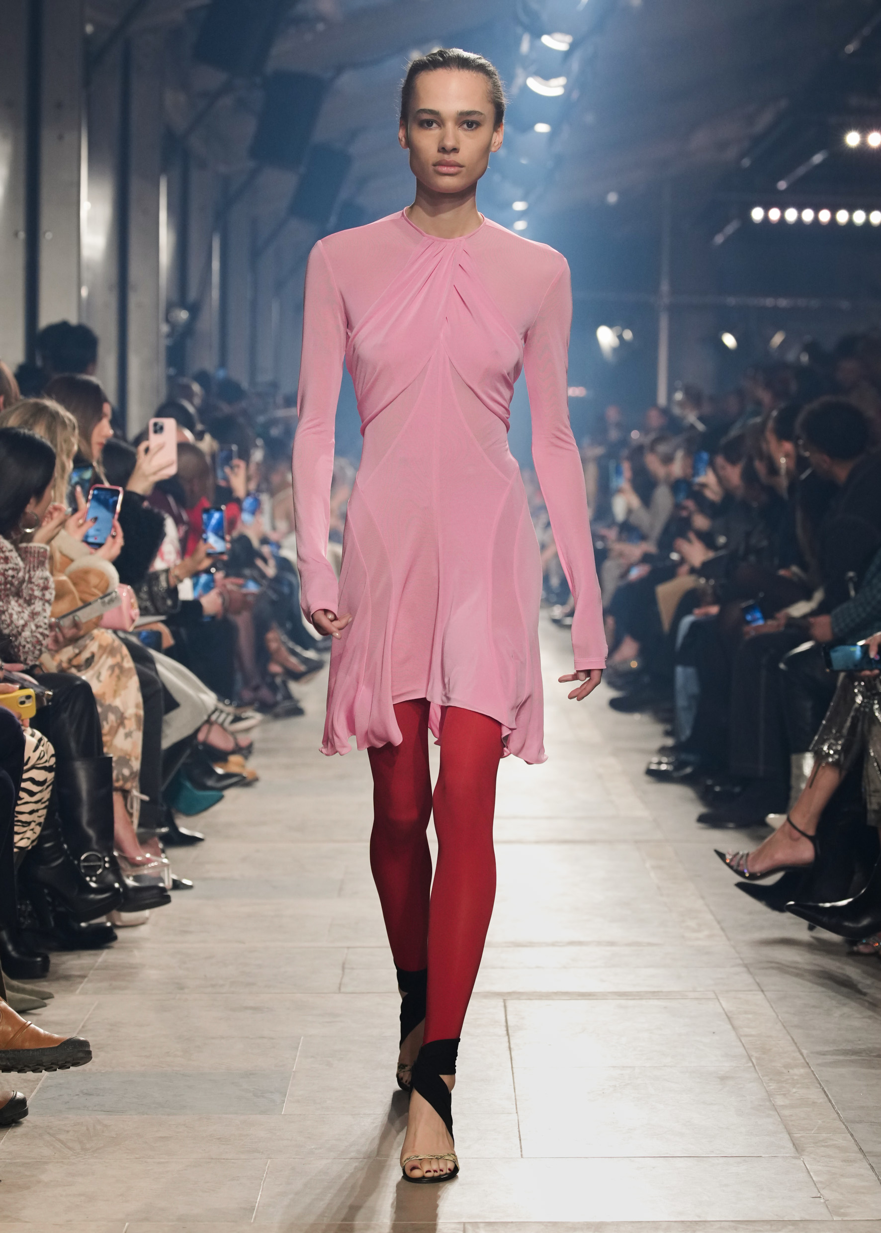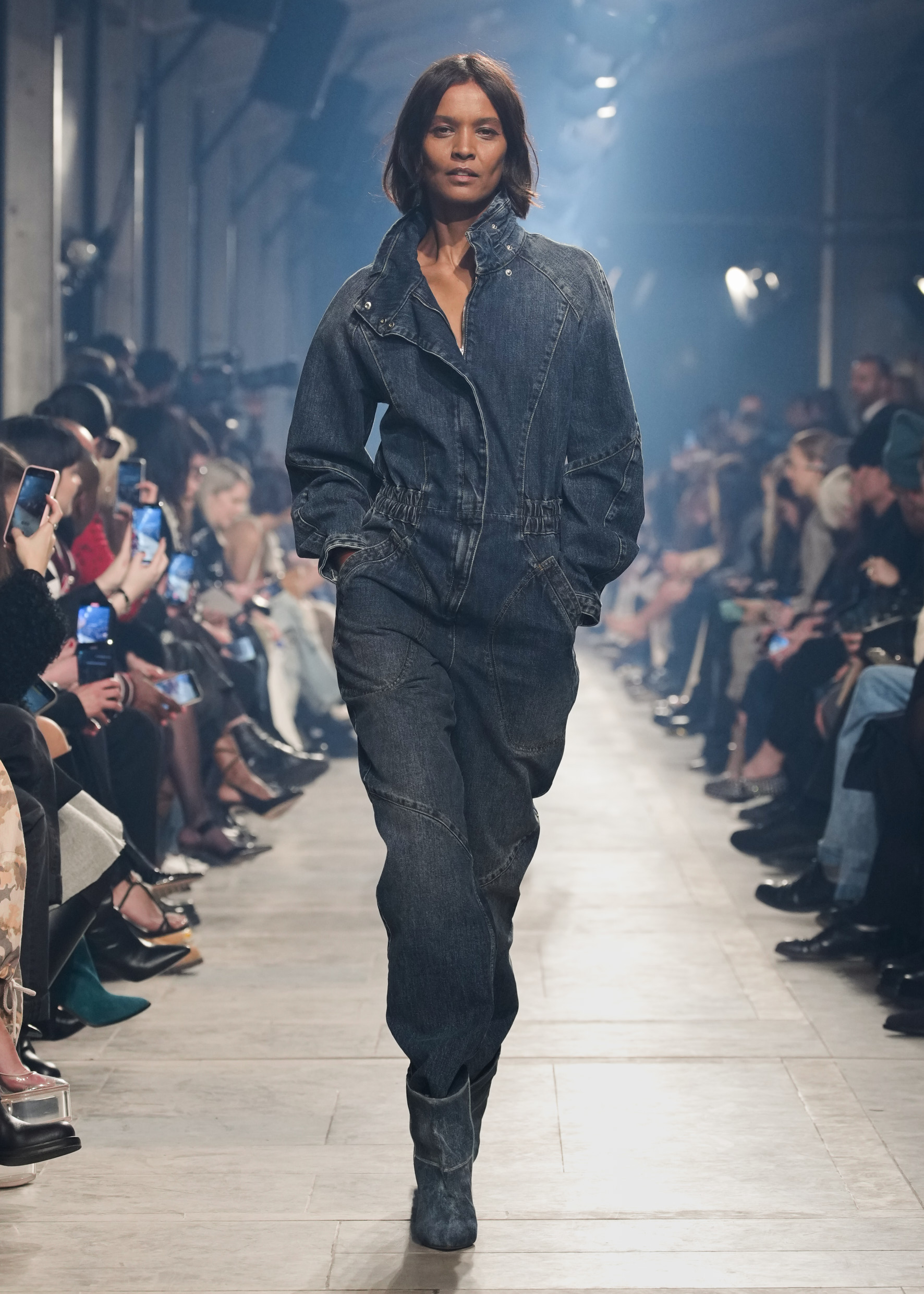Les découpes graphiques de la flou créent de nouveaux décolletés tandis que les jeux de transparence révèlent subtilement des parties du corps. Ces tissus souples et féminins contrastent avec des tricots épais en câble, des denims teints, de la laine et des shearlings chauds.