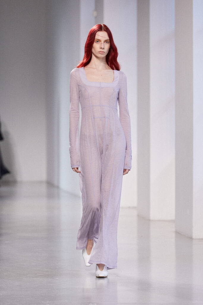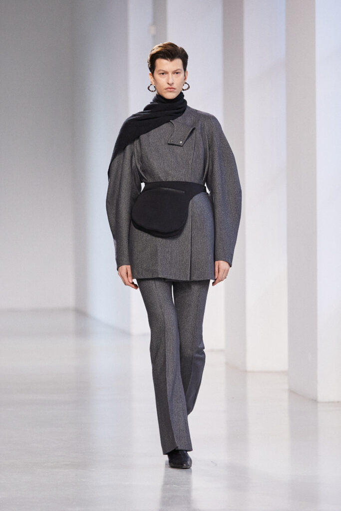 Les boucles d’oreilles et les bracelets sont en bambou, ajoutant une touche artisanale à la collection. Les chaussures continuent cette saison avec des talons fins et des bottes, ainsi qu’une collaboration avec Hakimono Sekizuka.