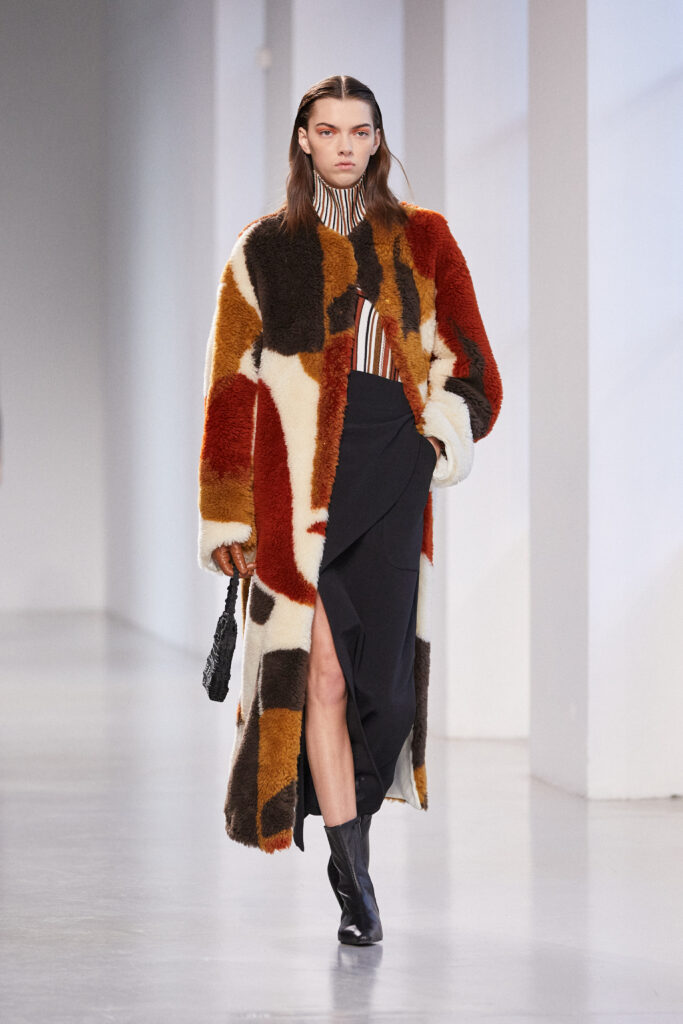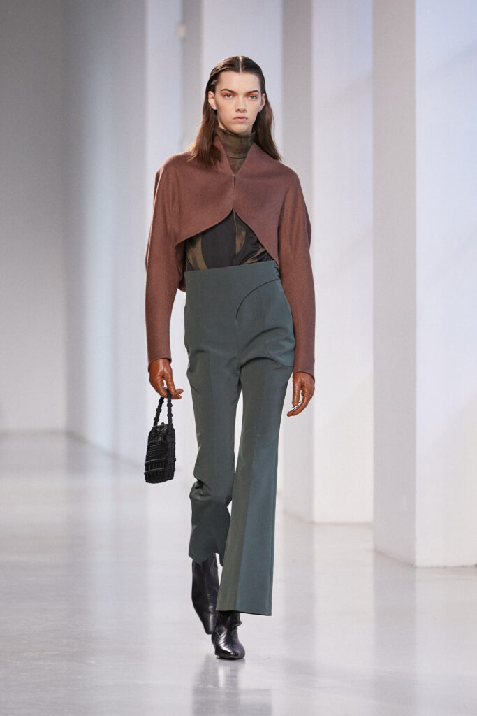 Maintenant l’équilibre de la collection avec audace sont les manteaux, boléros et tricots découpés de manière complexe réversibles en soie et cachemire, qui incarnent la courbe signature de la marque qui embrasse le corps féminin, en fusionnant magnifiquement les meilleurs matériaux avec une coupe gracieuse et une fabrication de motifs superbe.