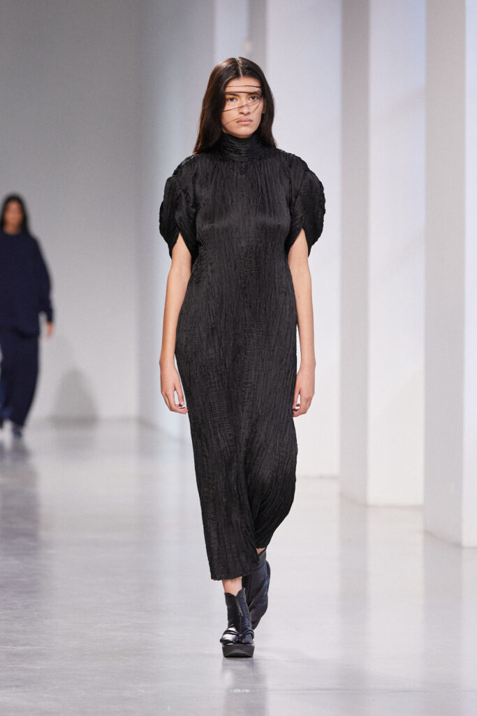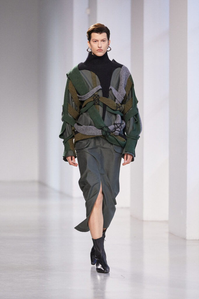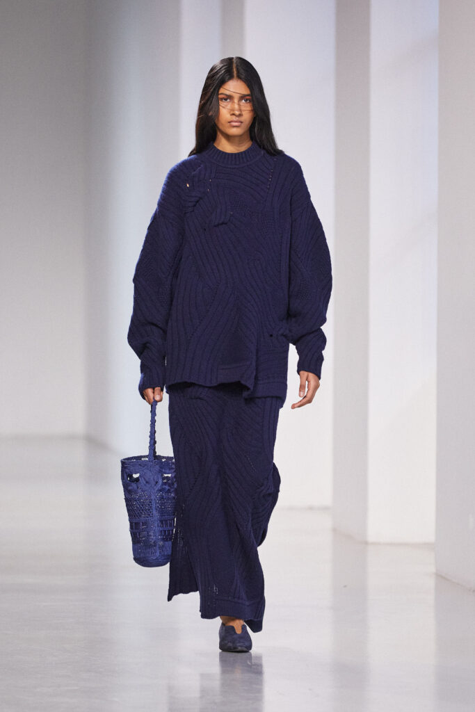 La collection Automne-Hiver 2023 de Mame Kurogouchi s’inspire de la corbeille japonaise et de la culture qui l’entoure, popularisée au Japon au début du XXe siècle. La créatrice Maiko Kurogouchi se plonge dans ces paniers magnifiquement complexes et dans l’héritage culturel et social riche qu’ils incarnent, tout en explorant le monde spirituel de nombreux artistes qui les ont créés, comprenant la force pure et la beauté épurée de ces paniers.