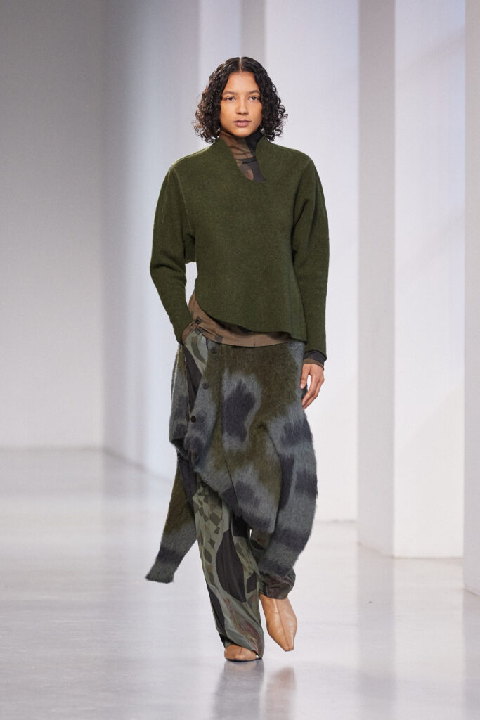 Les tricots en laine d’alpaga, teints avec la méthode « origami dyeing », sont ludiques et graphiques, et apportent un rythme léger à la collection comme les lignes d’un panier en bambou généreux. Les robes sont une incarnation délicate mais forte de la structure du panier, recréée en superposant et en entrelaçant de manière complexe les rayures en jersey Raschel et la dentelle torchon. Le motif de tissage audacieux sur les hauts et les jupes est le résultat de l’application de la technique du plissage avec du papier à motifs. Les innombrables lignes sur ces pièces, comme une averse de pluie battant contre les feuilles de bambou, donnent une profondeur subtile au tissu.