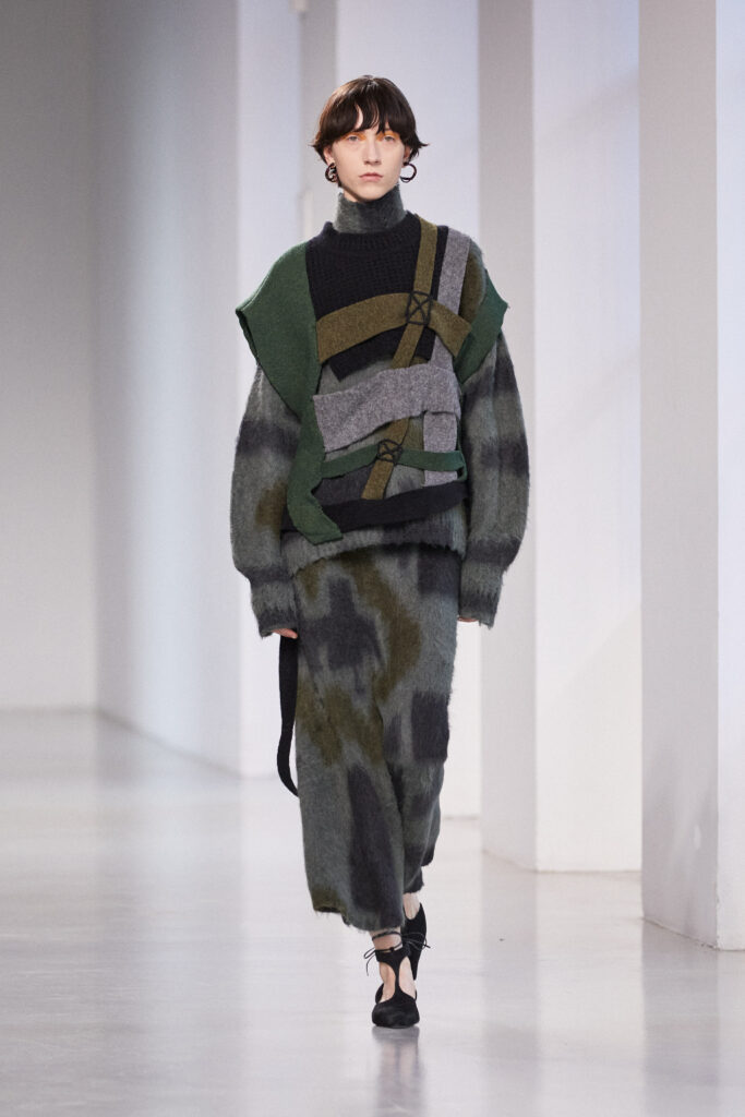 Kurogouchi capture l’image principale de la saison à partir de l’intersection des nombreuses lignes qui apparaissent à travers les petits espaces du tressage des paniers, des danses d’ombres et de la légèreté du bambou. Les éléments visuels sont ensuite traduits en graphiques et exprimés avec des manteaux et des gilets en laine volumineux tricotés en fil d’argent.
