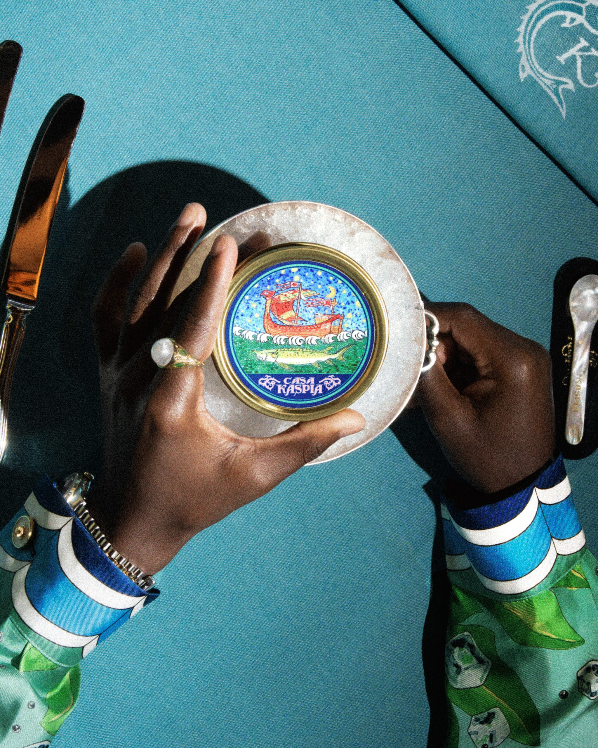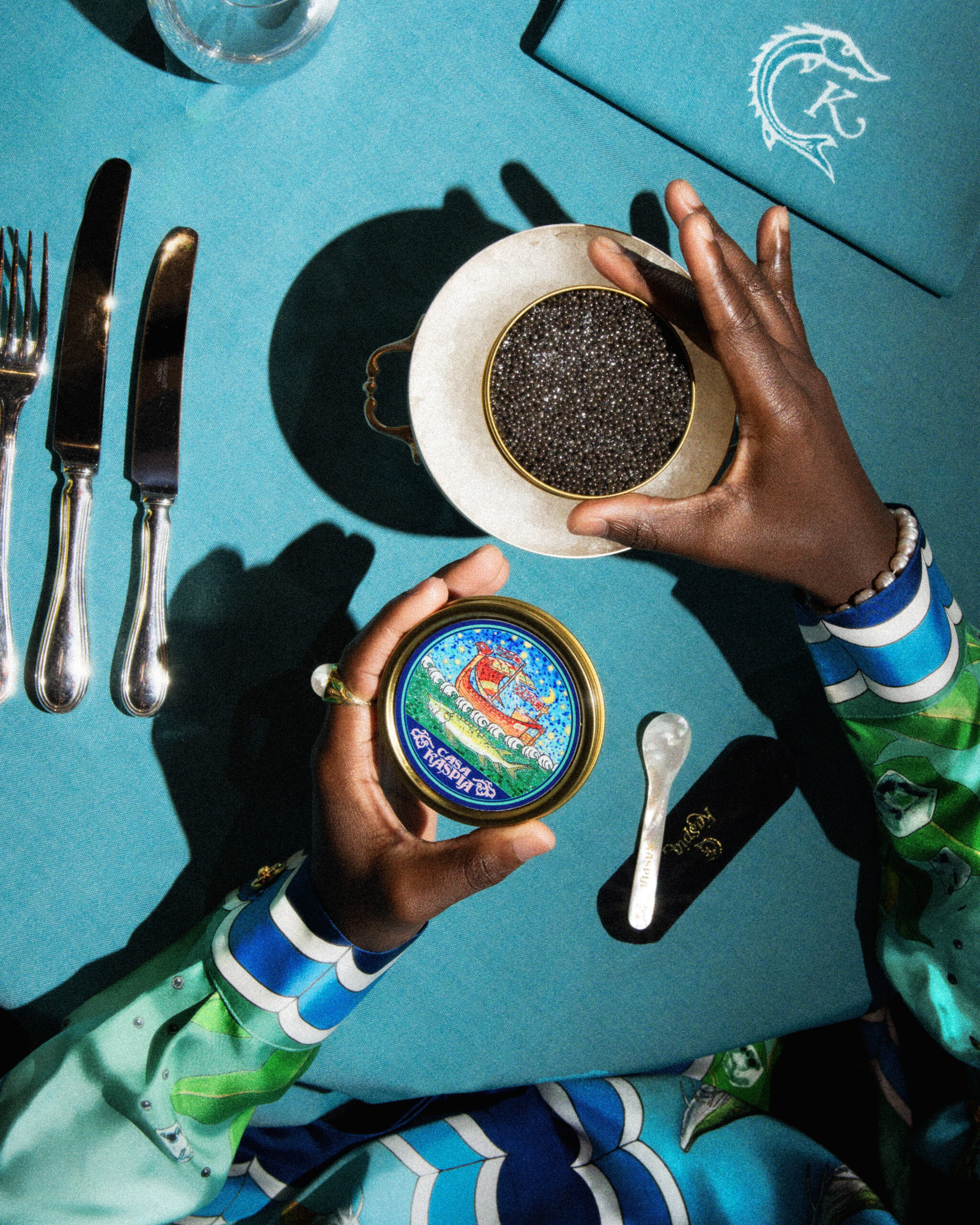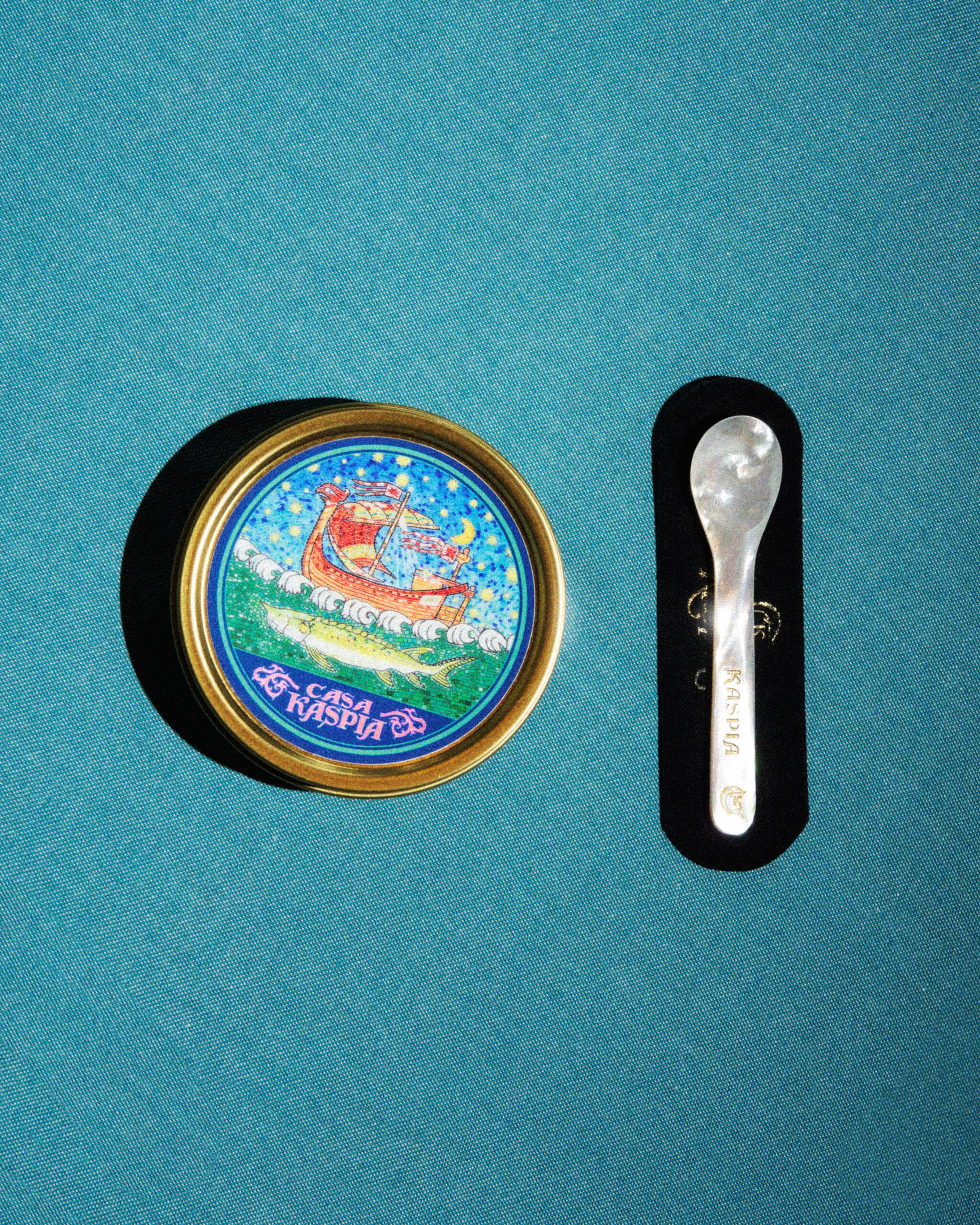 Cette collaboration est une interprétation élégante des éléments culinaires de base, la cuillère en nacre – accompagnée d’une pochette brodée – sera un objet de collection convoité, tandis que la boîte de caviar Impérial Baeri est la pièce ludique de résistance des œuvres collaboratives du duo, chacune présentant le nouveau langage de conception formé par Casa Kaspia.