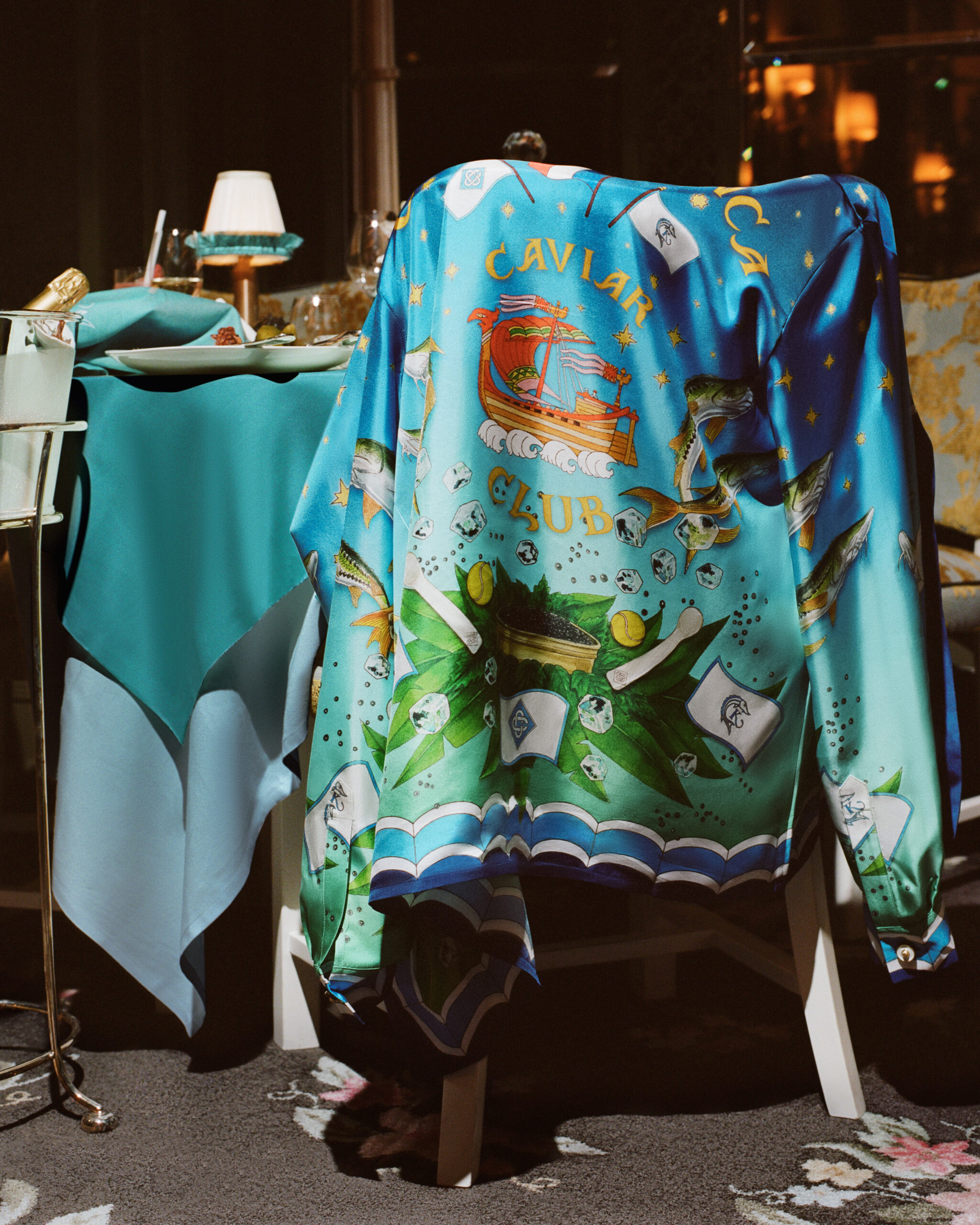 L’élément central de cette collaboration est la convivialité ludique. Les chemises en soie emblématiques de Casablanca présentent des imprimés complexes de visages peints à la main, inspirés de l’iconographie, des mosaïques et de la marque historique des flagship stores de Caviar Kaspia à Paris, Dubaï, Sao Paulo, St. Tropez, Los Angeles, Londres et New York, un hommage est rendu à leurs valeurs communes d’élégance parisienne.