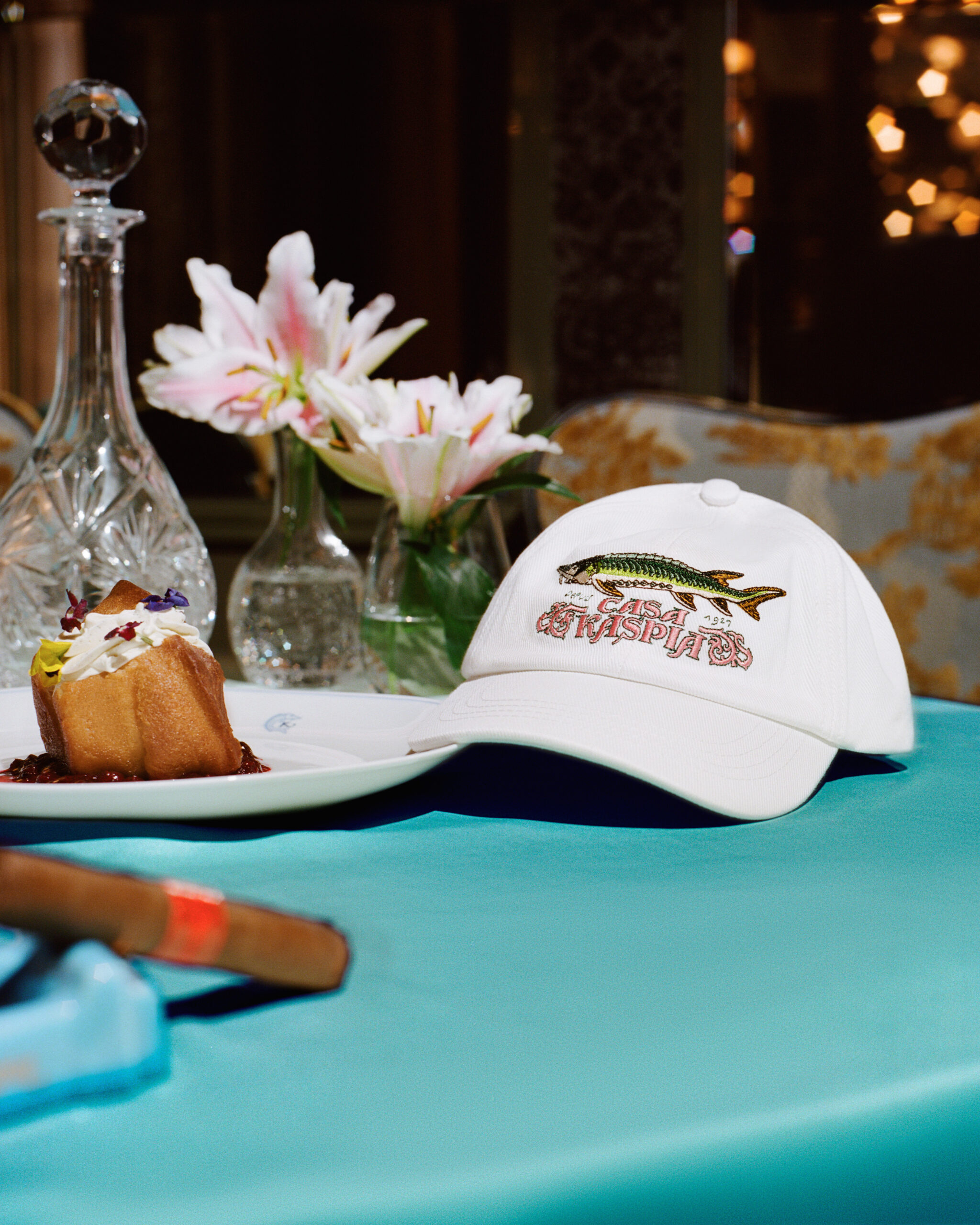 Les pièces pour l’après-sport sont réalisées en jersey doux, arborant un logo unique de Casa Kaspia. Conçus exclusivement pour ce projet, les sweats décontractés sont complétés par une casquette de baseball Casa Kaspia, brodée avec le même élégant double branding.