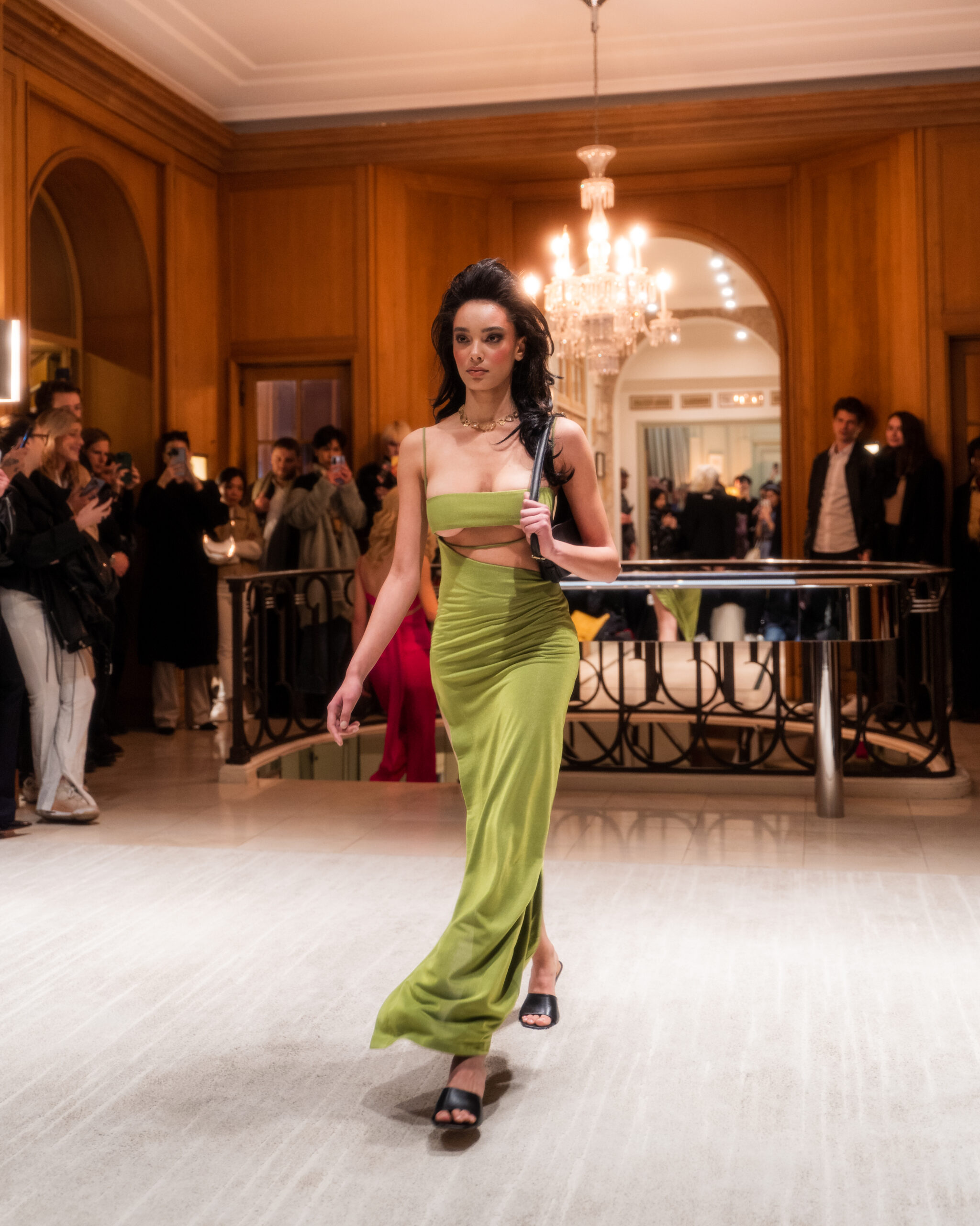 Pour accessoiriser la collection, la créatrice a collaboré avec la maroquinière Nadia Chellaoui pour créer trois sacs oversize ainsi qu’avec la marque Zila Russi pour les chaussures. Partenaire de l’événement, le joaillier Mellerio a prêté 4 prestigieux colliers de haute joaillerie pour sublimer certains looks (1, 3, 11, 19).