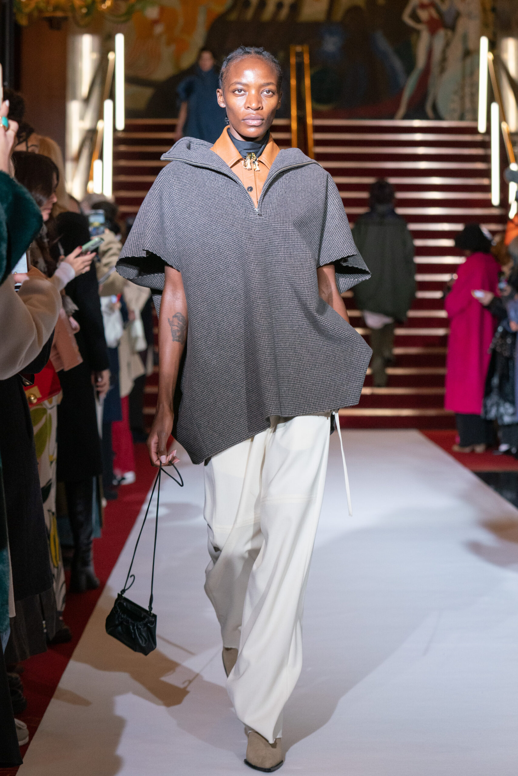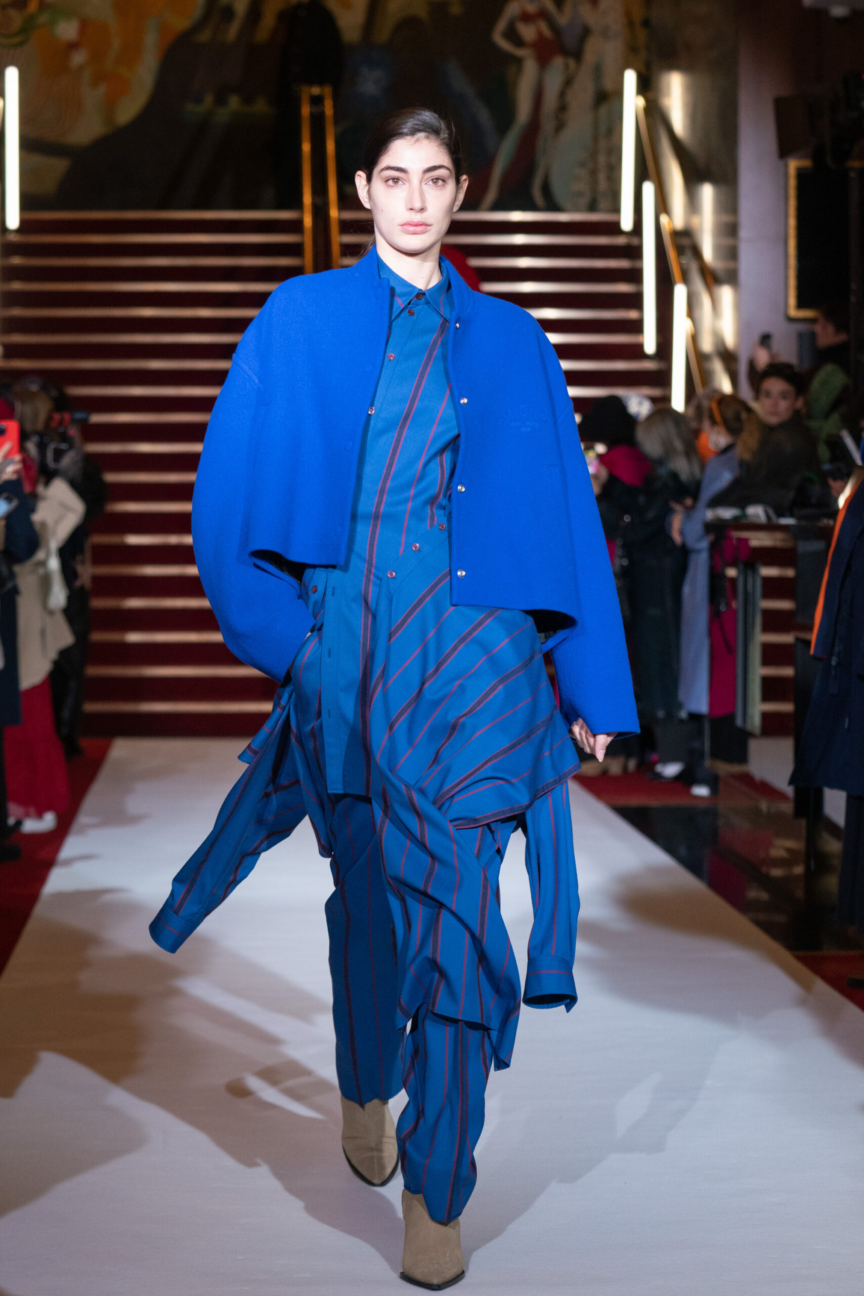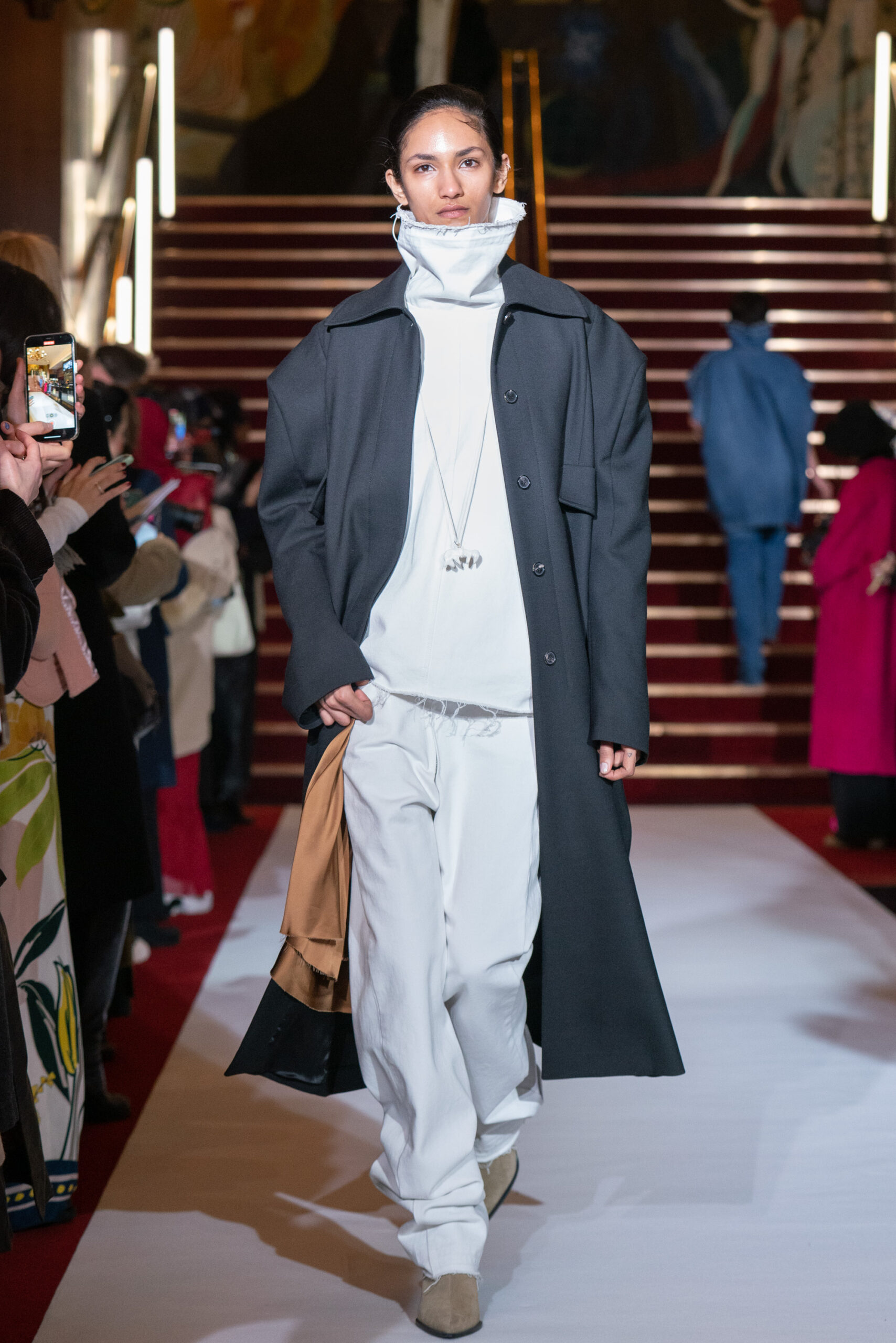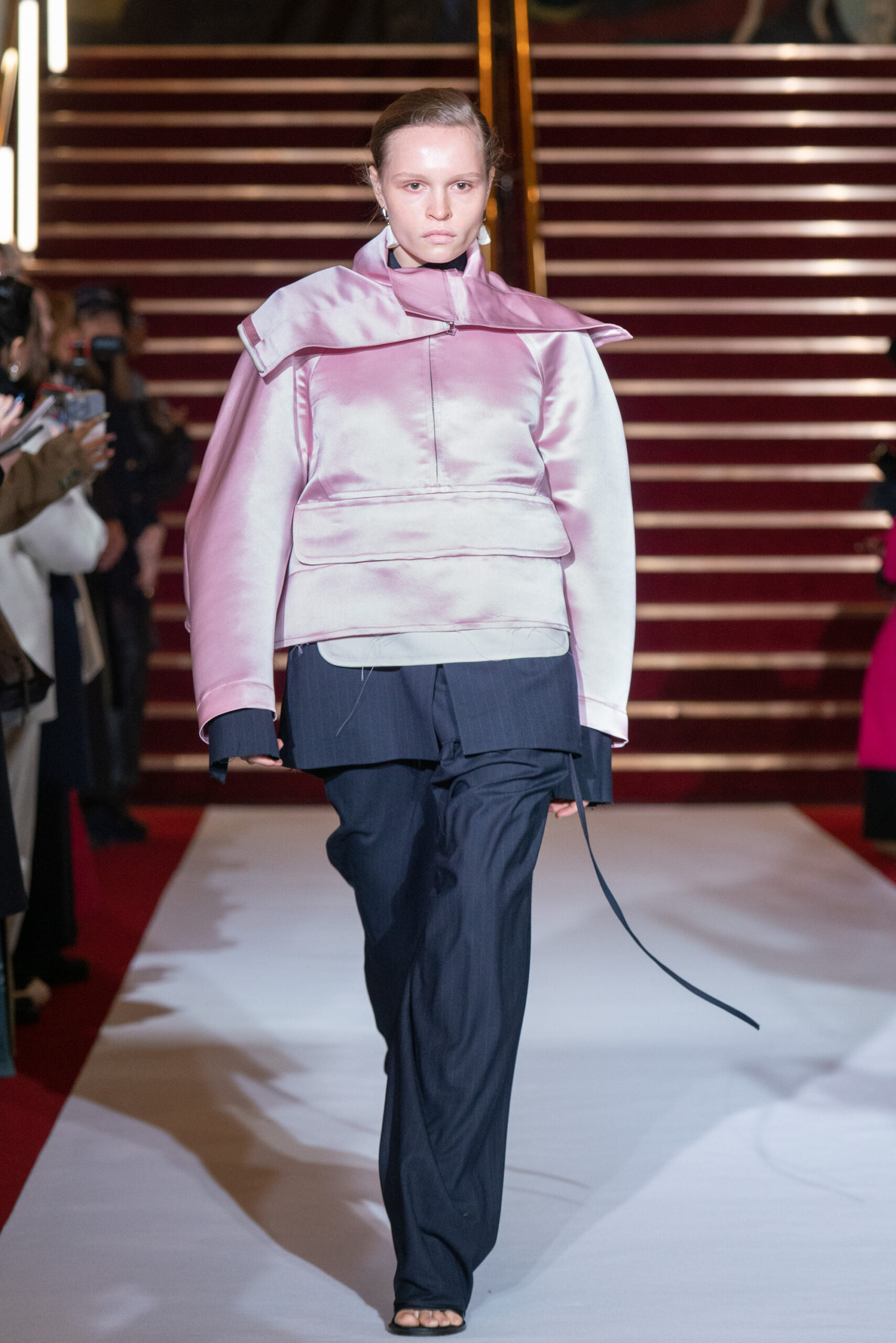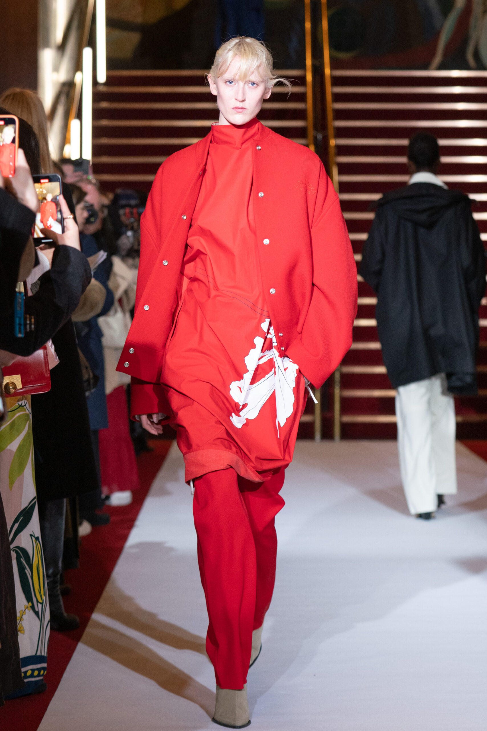 La collection a été présentée dans l’un des cinémas les plus célèbres du monde, où les caméras, les téléphones et les miroirs sont omniprésents, poussant souvent les gens à porter un masque lorsqu’ils se présentent devant le monde (des réseaux sociaux). Cependant, les Ukrainiens, qui font face à une guerre à grande échelle depuis un an, ne peuvent plus se permettre de porter ces masques. Au lieu de cela, ils se présentent tels quels, dans leur état brut. La designer Lilia Litkovska voit et honore la beauté des valeurs intérieures et de la force, de la vie quotidienne contre vents et marées. Elle établit un chic brut et touchant, presque un chic industriel, célébrant la personne pour ce qu’elle est vraiment lorsqu’elle porte et ressent les vêtements, et s’exprime dans sa forme la plus vraie.