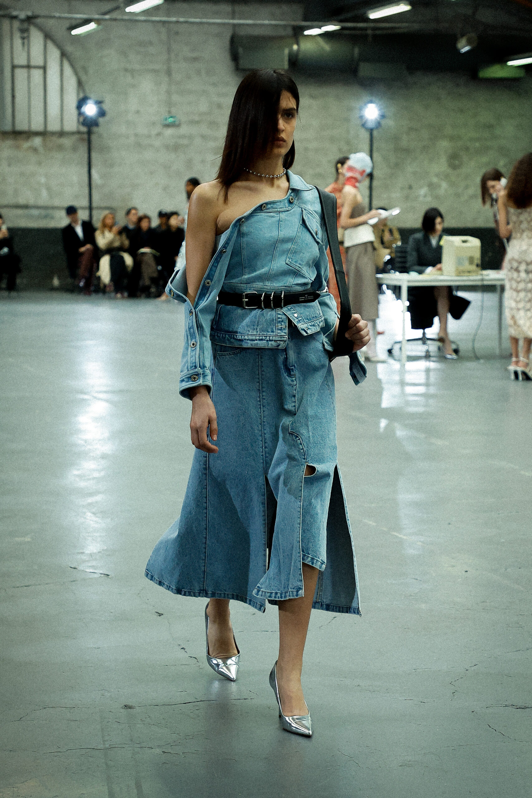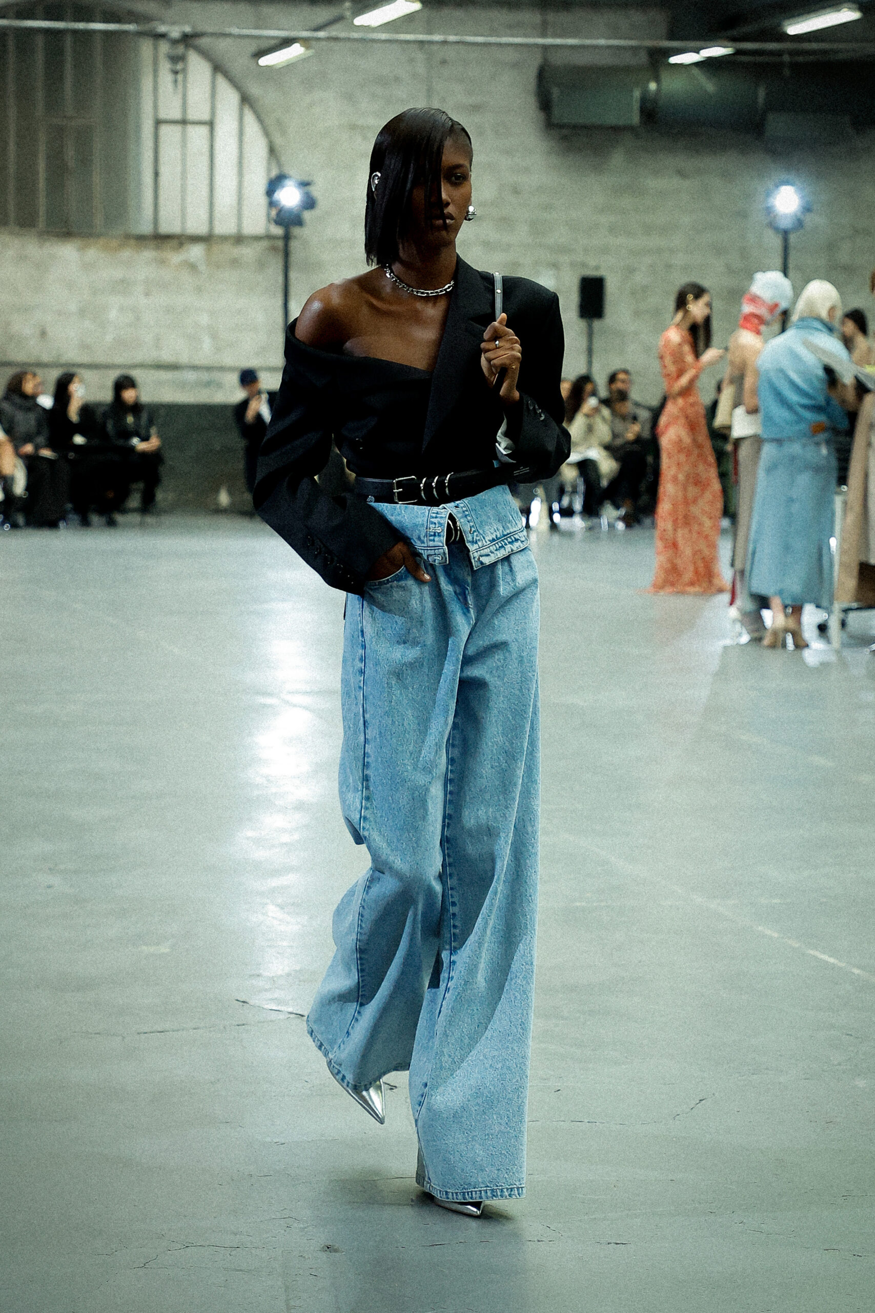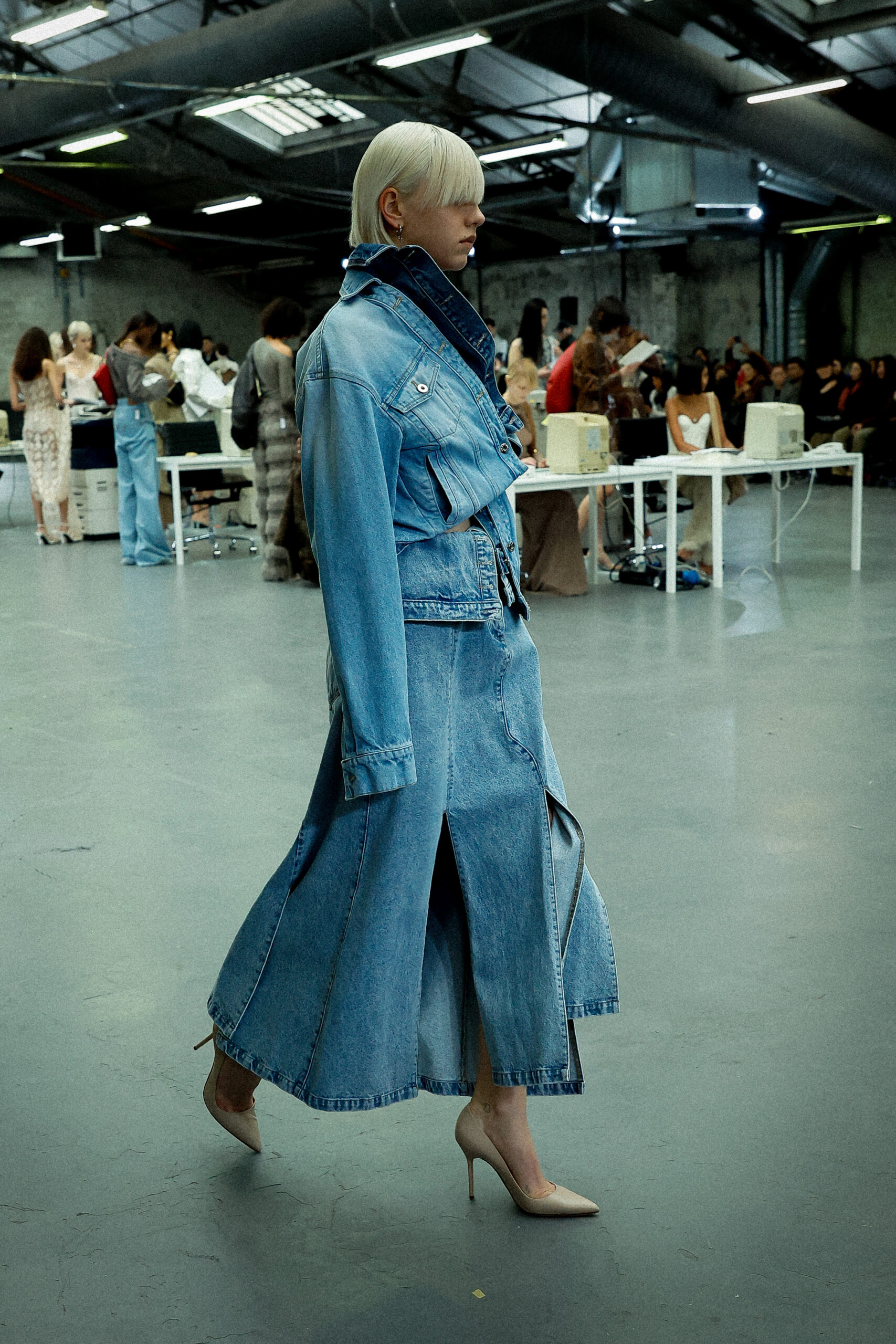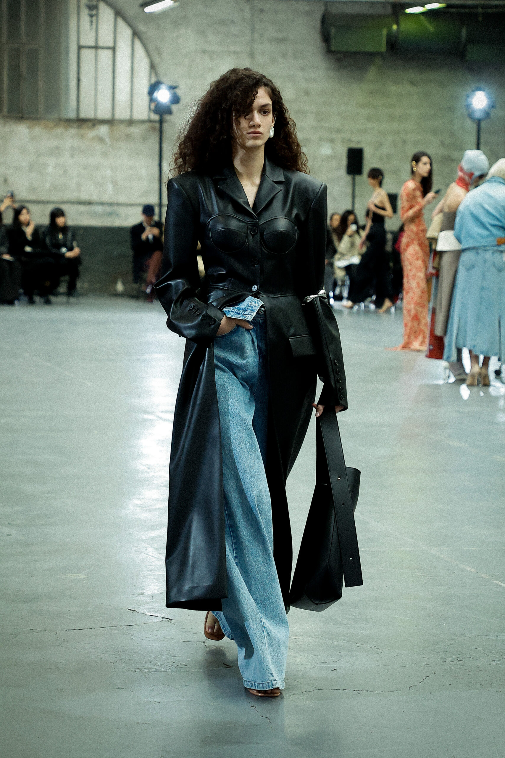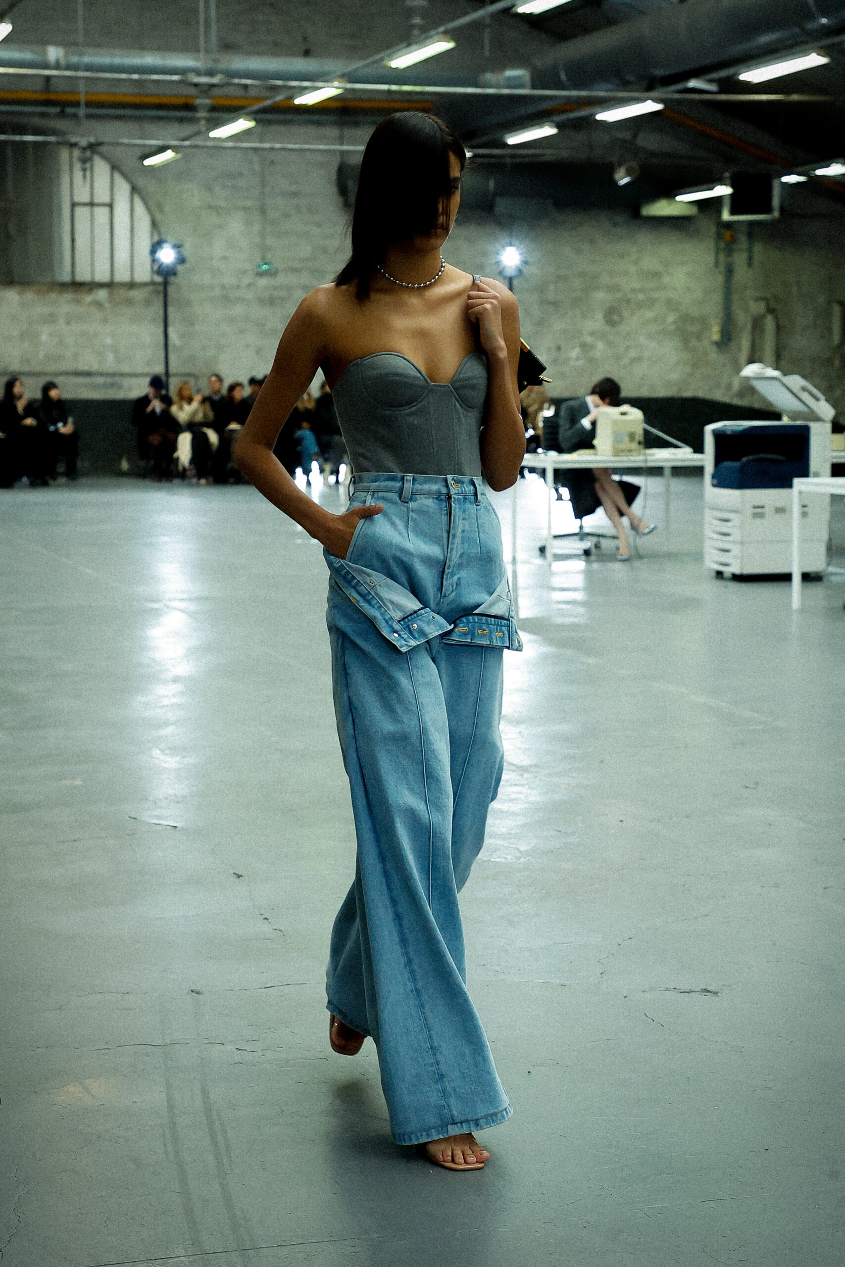 Les corsets taillés en laine vierge fine donnent le ton avec leur attrait décisif et sensuel. Construits à l’aide de techniques de couture méticuleuses, ces corsets présentent des pinces bien placées, des coutures verticales et des structures internes qui accentuent la taille. Pendant ce temps, le denim lavé intensément est affûté à l’aide de techniques de construction utilitaire traditionnelles et d’accents dynamiques de mélange de lavage en pierre et de lavage au sable.