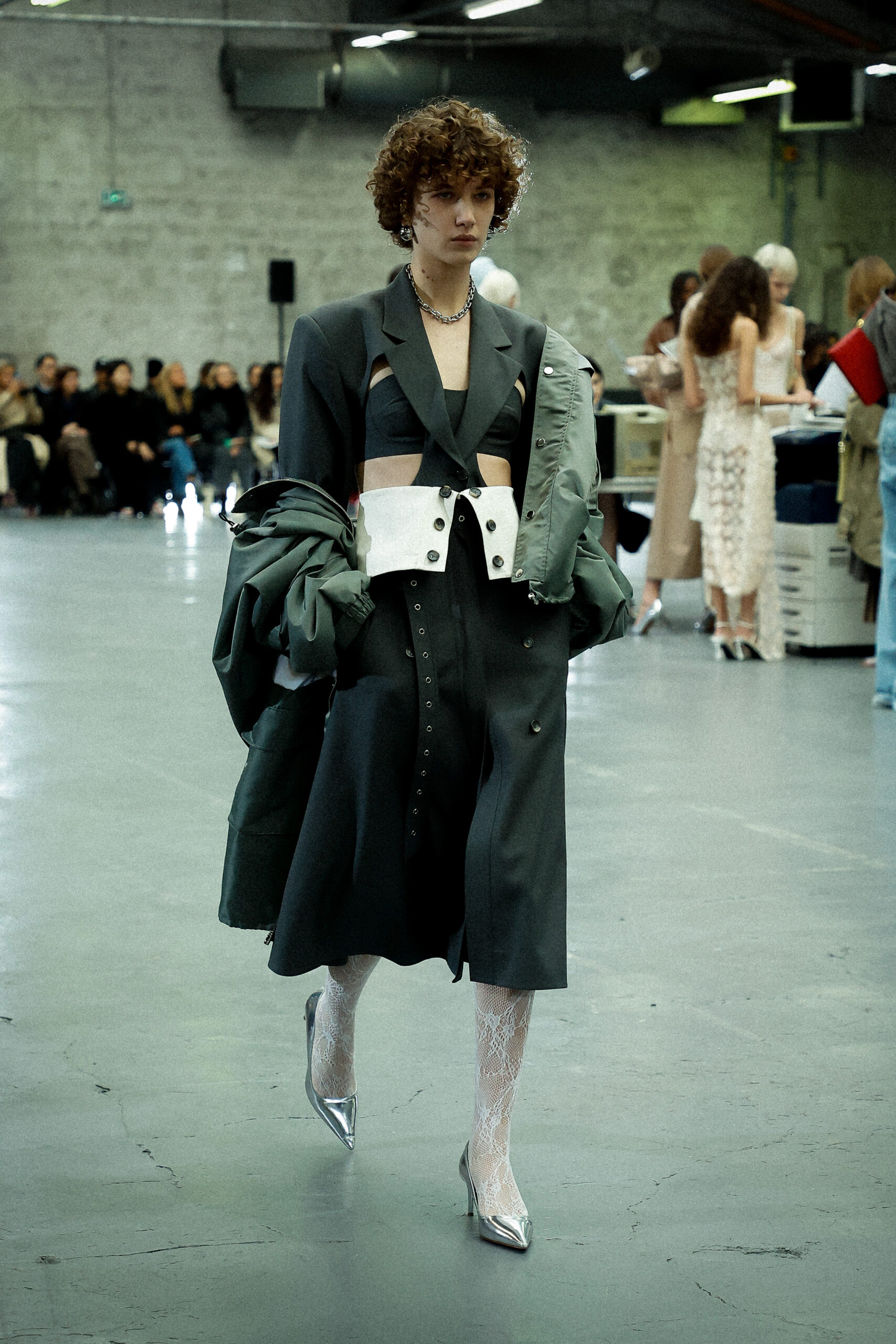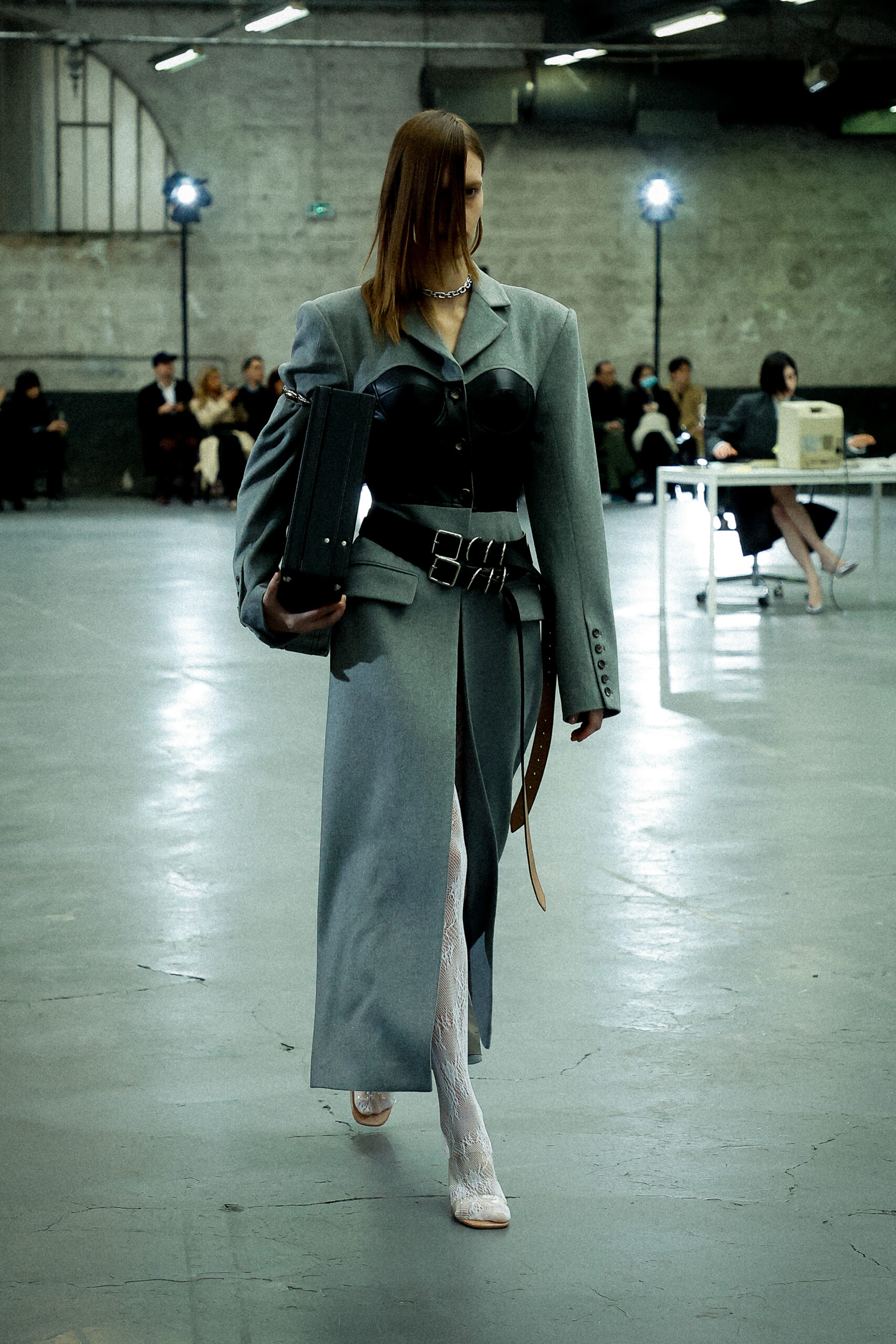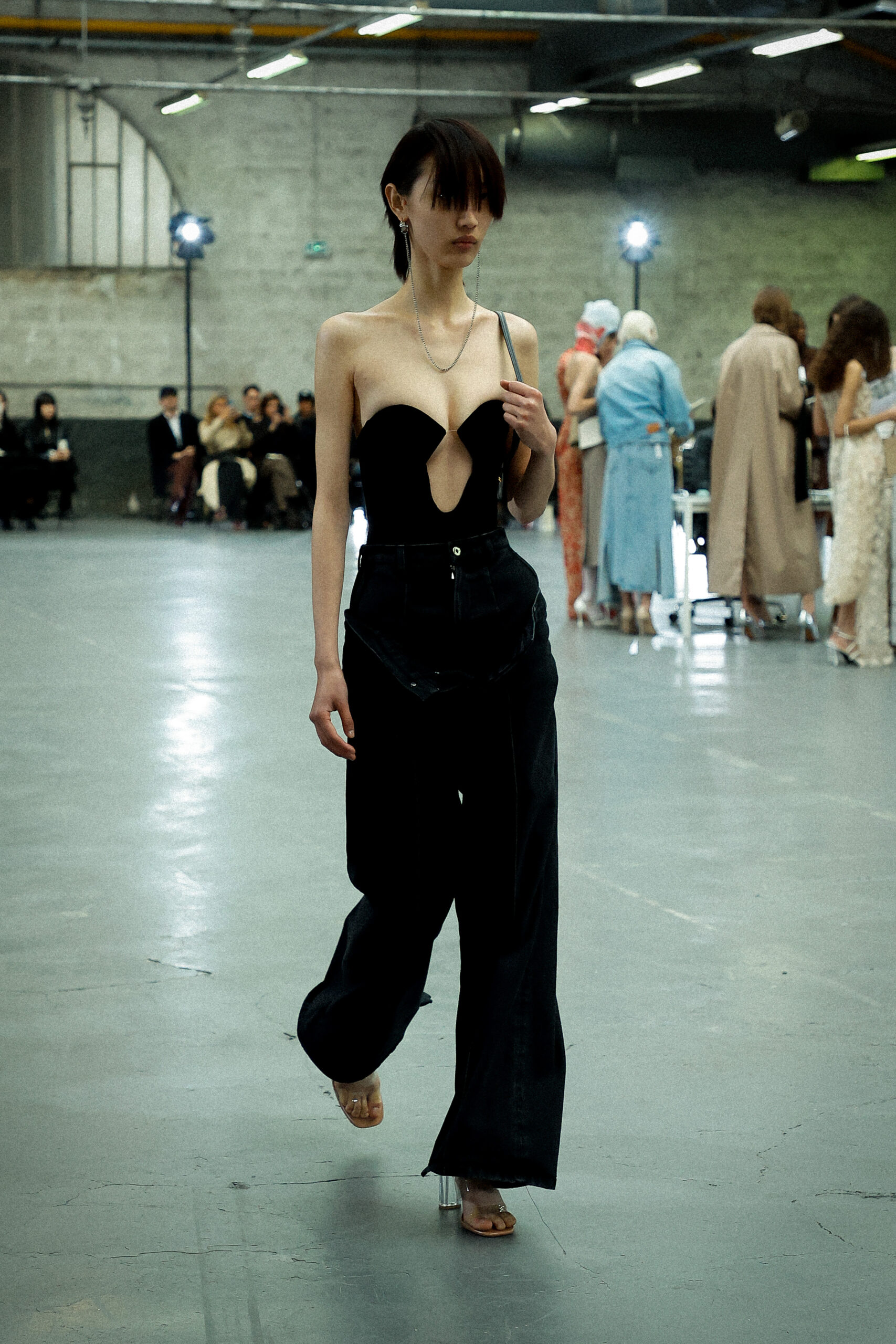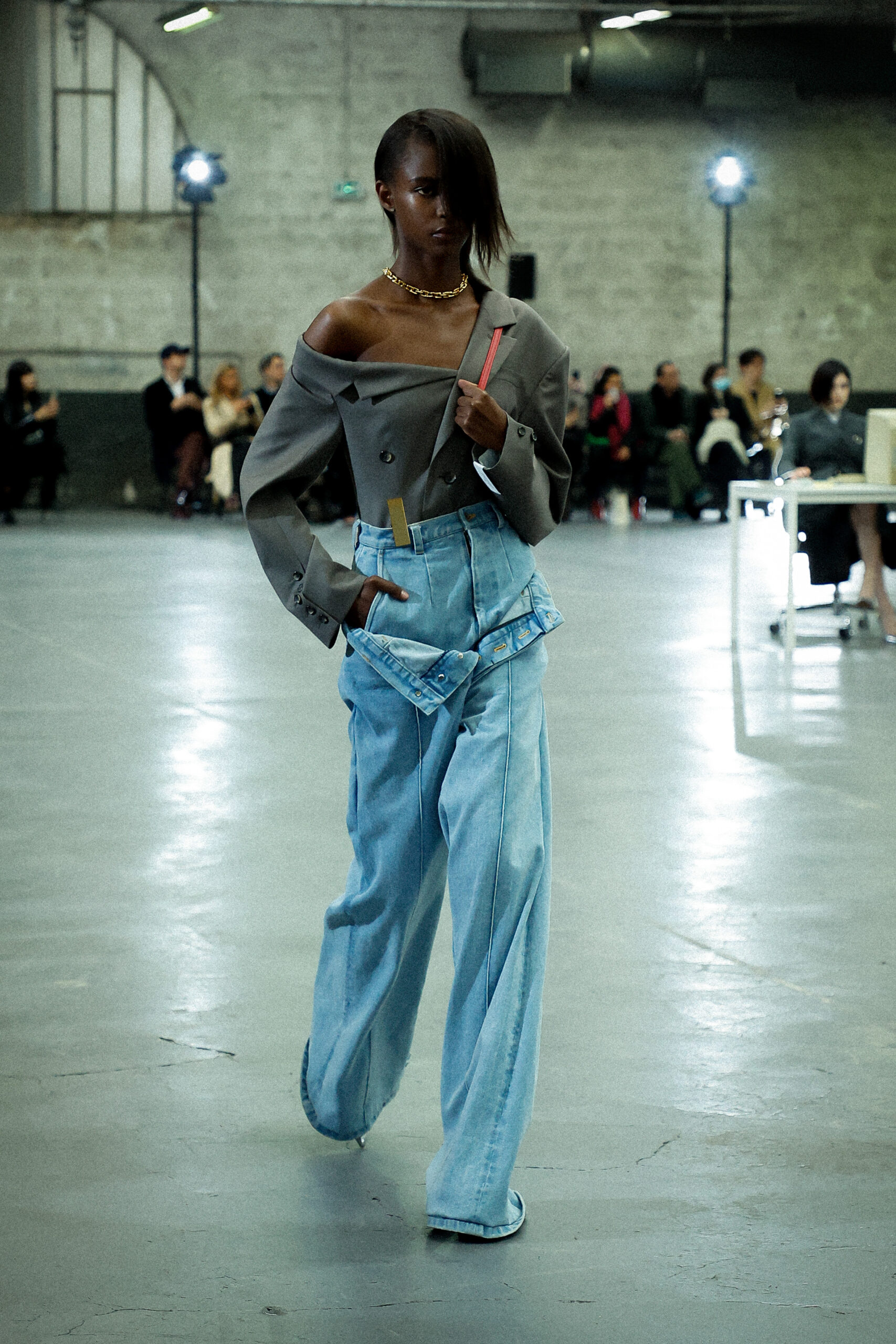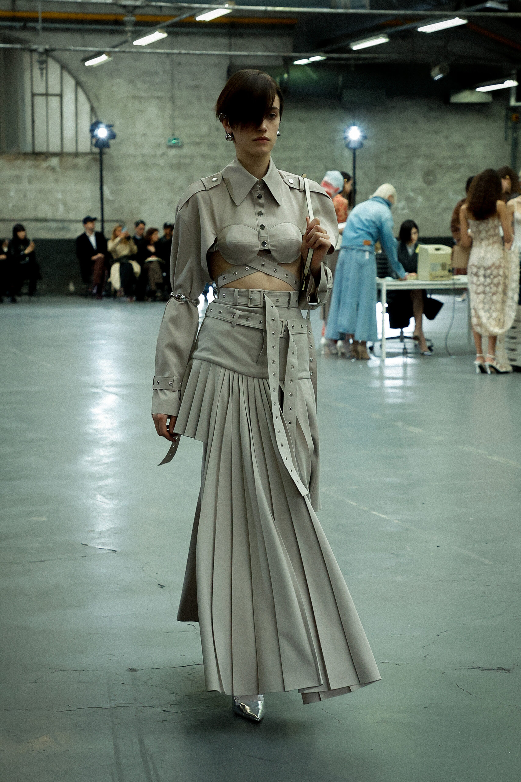 Les corsets taillés en laine vierge fine donnent le ton avec leur attrait décisif et sensuel. Construits à l’aide de techniques de couture méticuleuses, ces corsets présentent des pinces bien placées, des coutures verticales et des structures internes qui accentuent la taille. Pendant ce temps, le denim lavé intensément est affûté à l’aide de techniques de construction utilitaire traditionnelles et d’accents dynamiques de mélange de lavage en pierre et de lavage au sable.