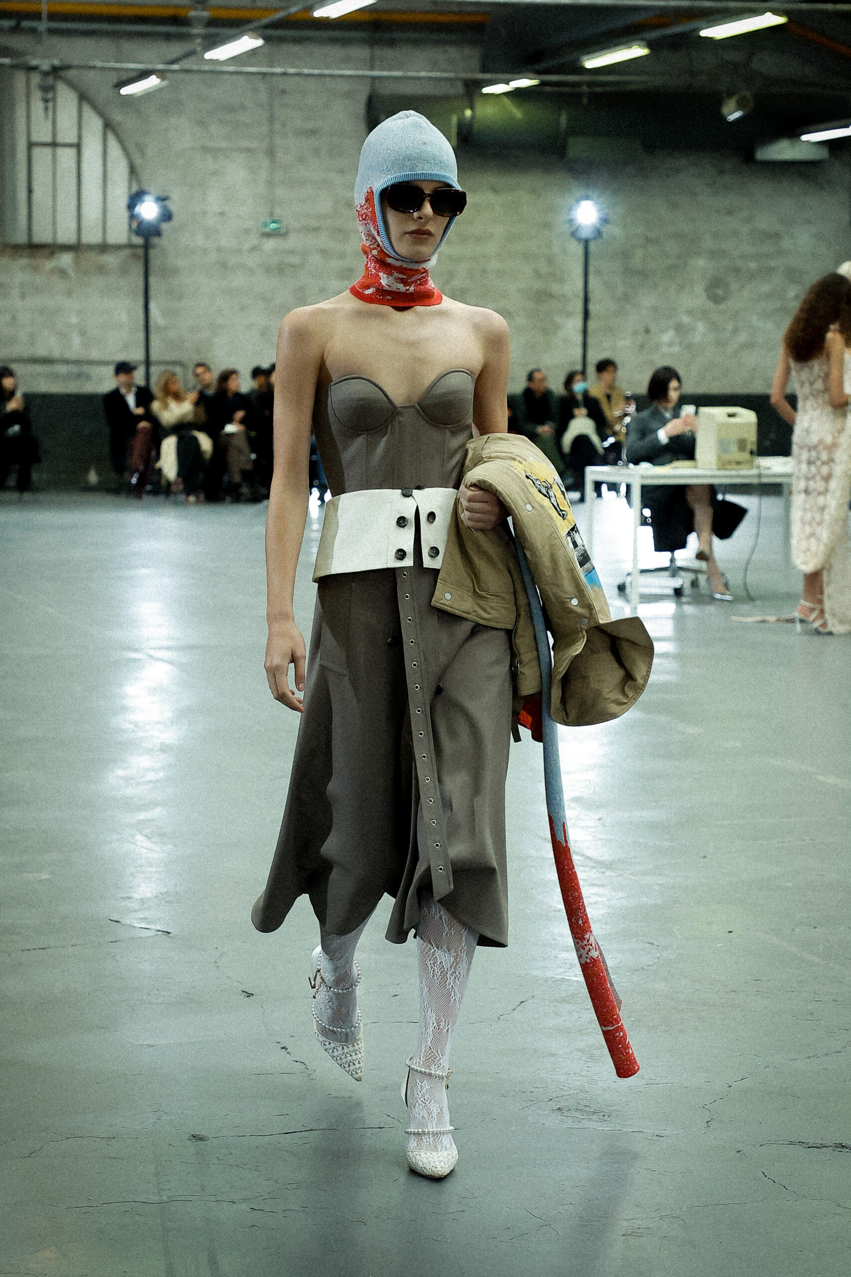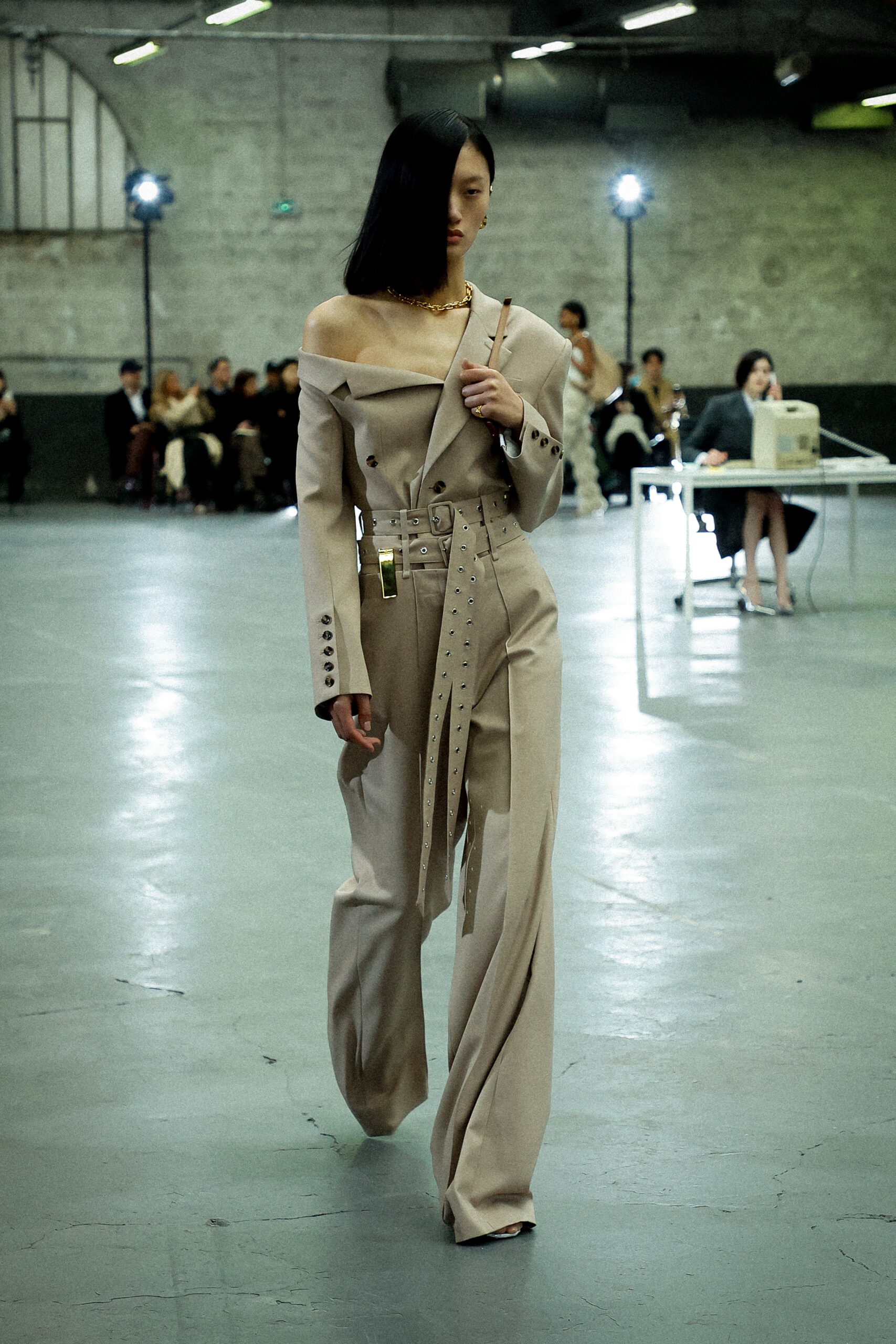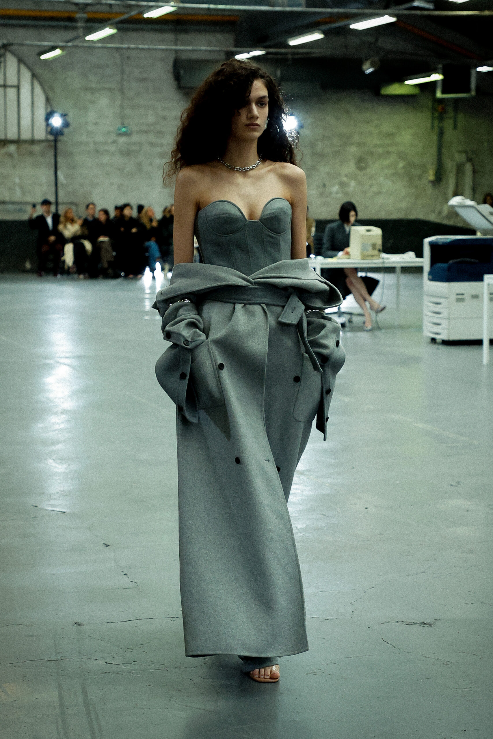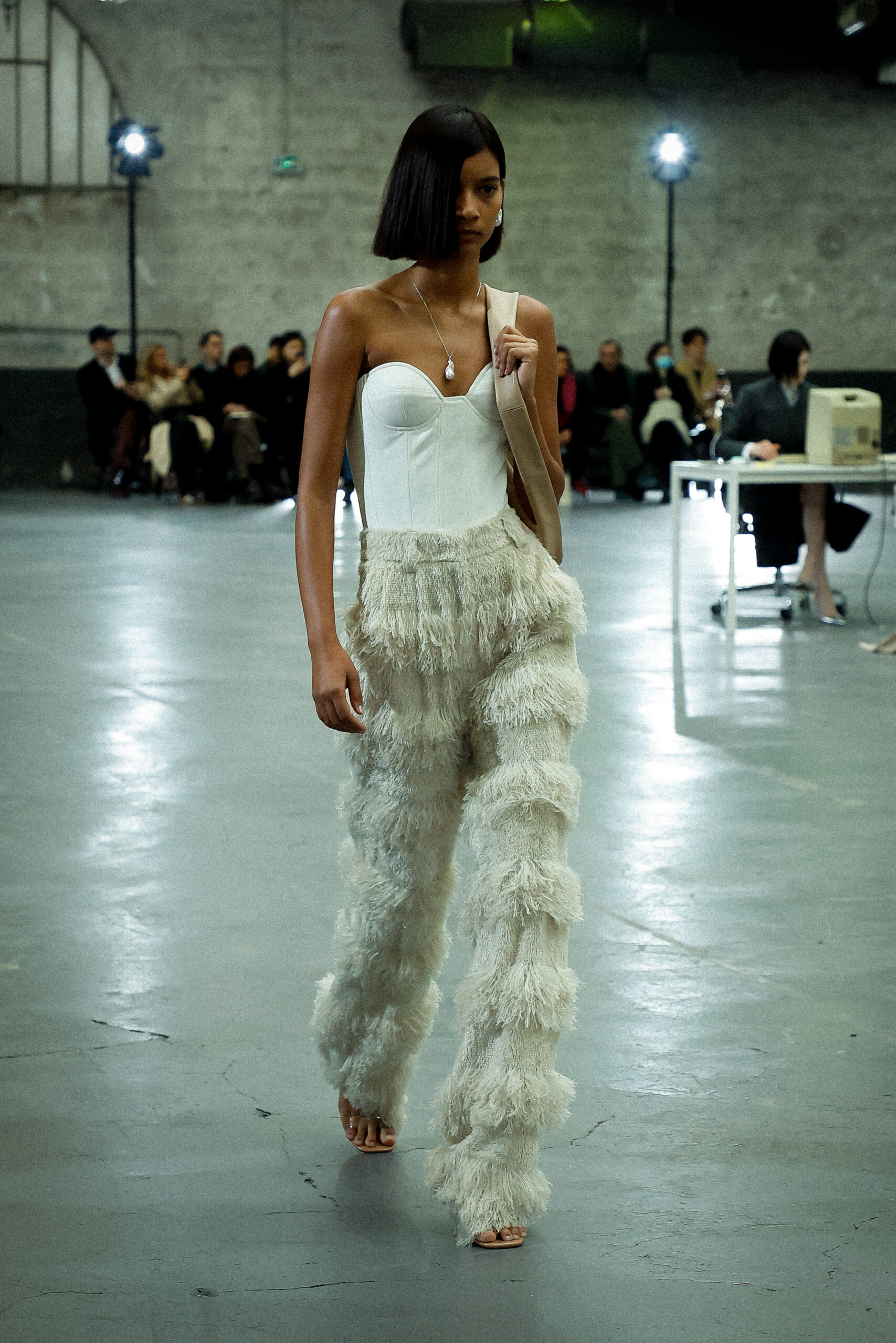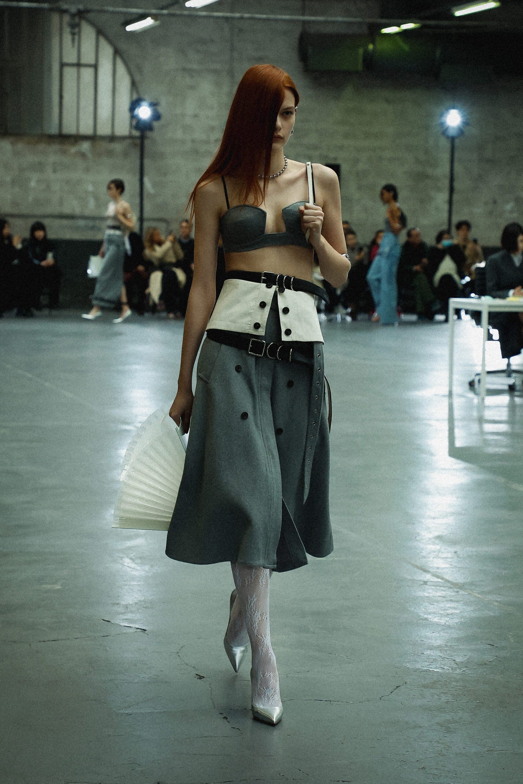 Les corsets taillés en laine vierge fine donnent le ton avec leur attrait décisif et sensuel. Construits à l’aide de techniques de couture méticuleuses, ces corsets présentent des pinces bien placées, des coutures verticales et des structures internes qui accentuent la taille. Pendant ce temps, le denim lavé intensément est affûté à l’aide de techniques de construction utilitaire traditionnelles et d’accents dynamiques de mélange de lavage en pierre et de lavage au sable.