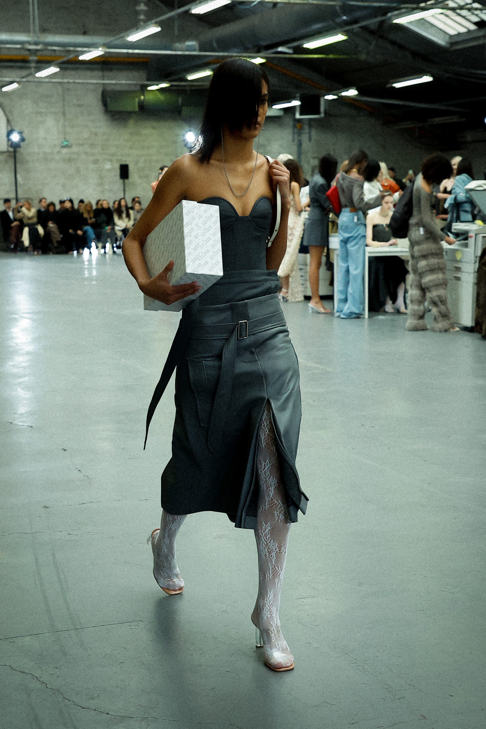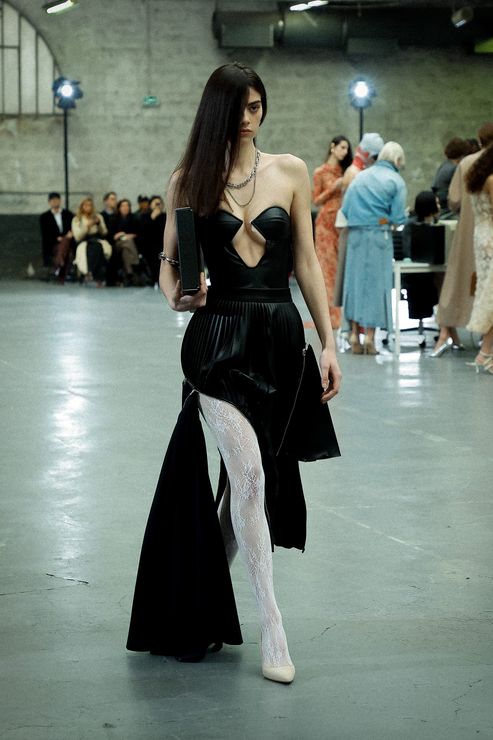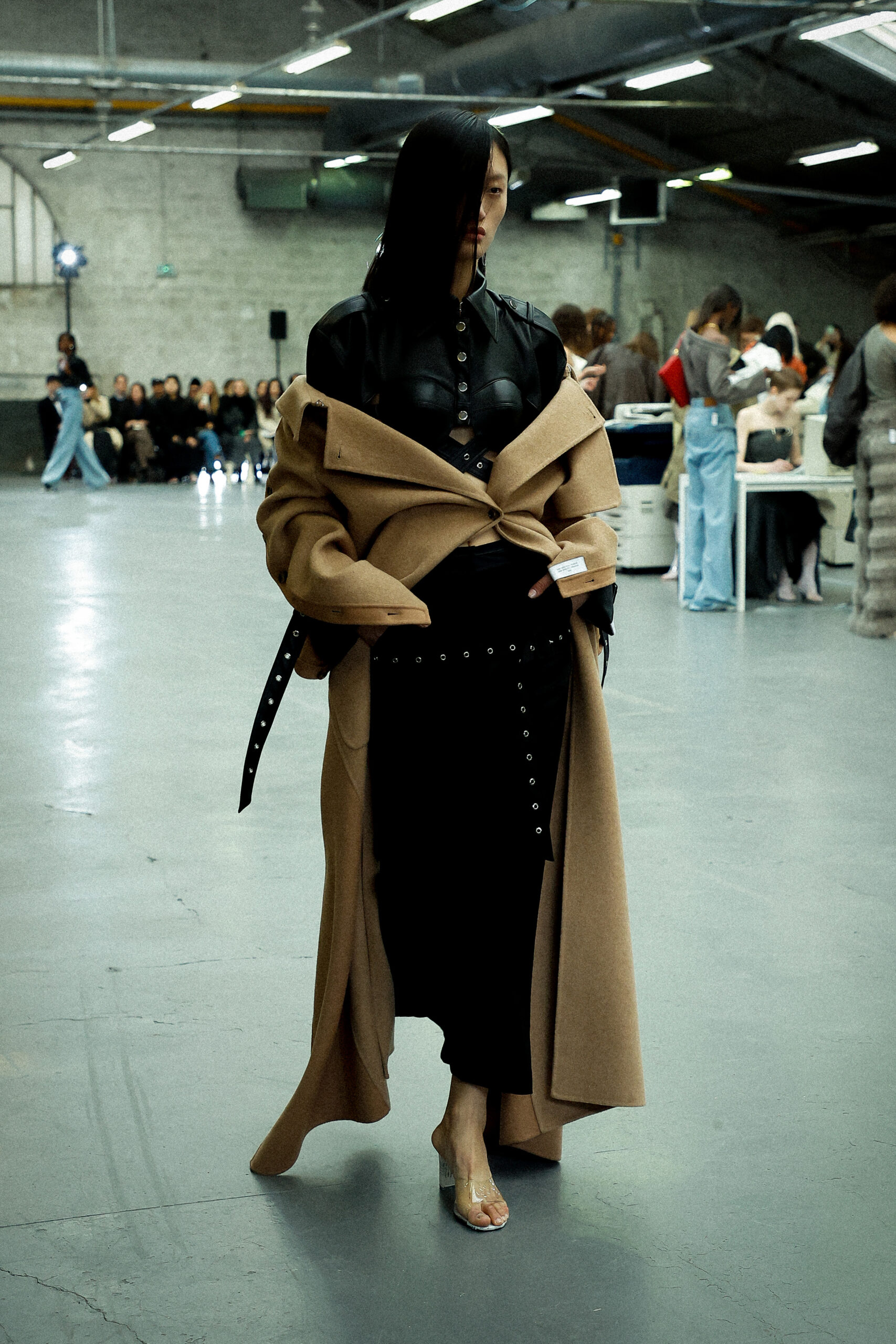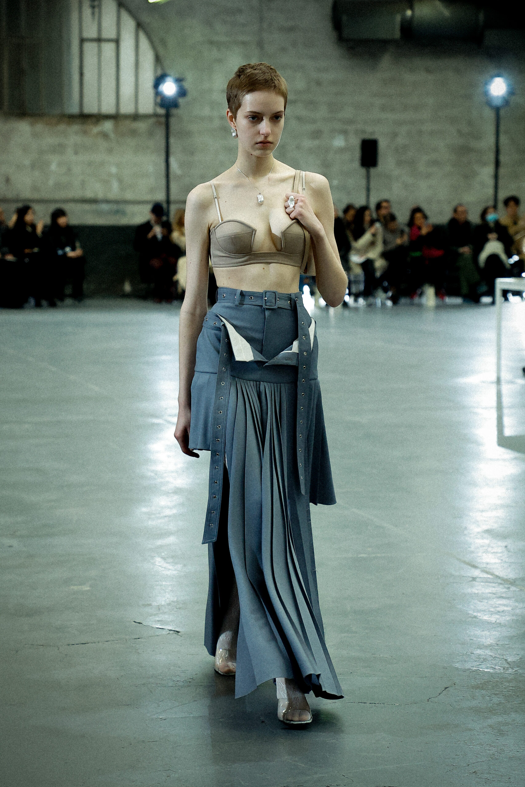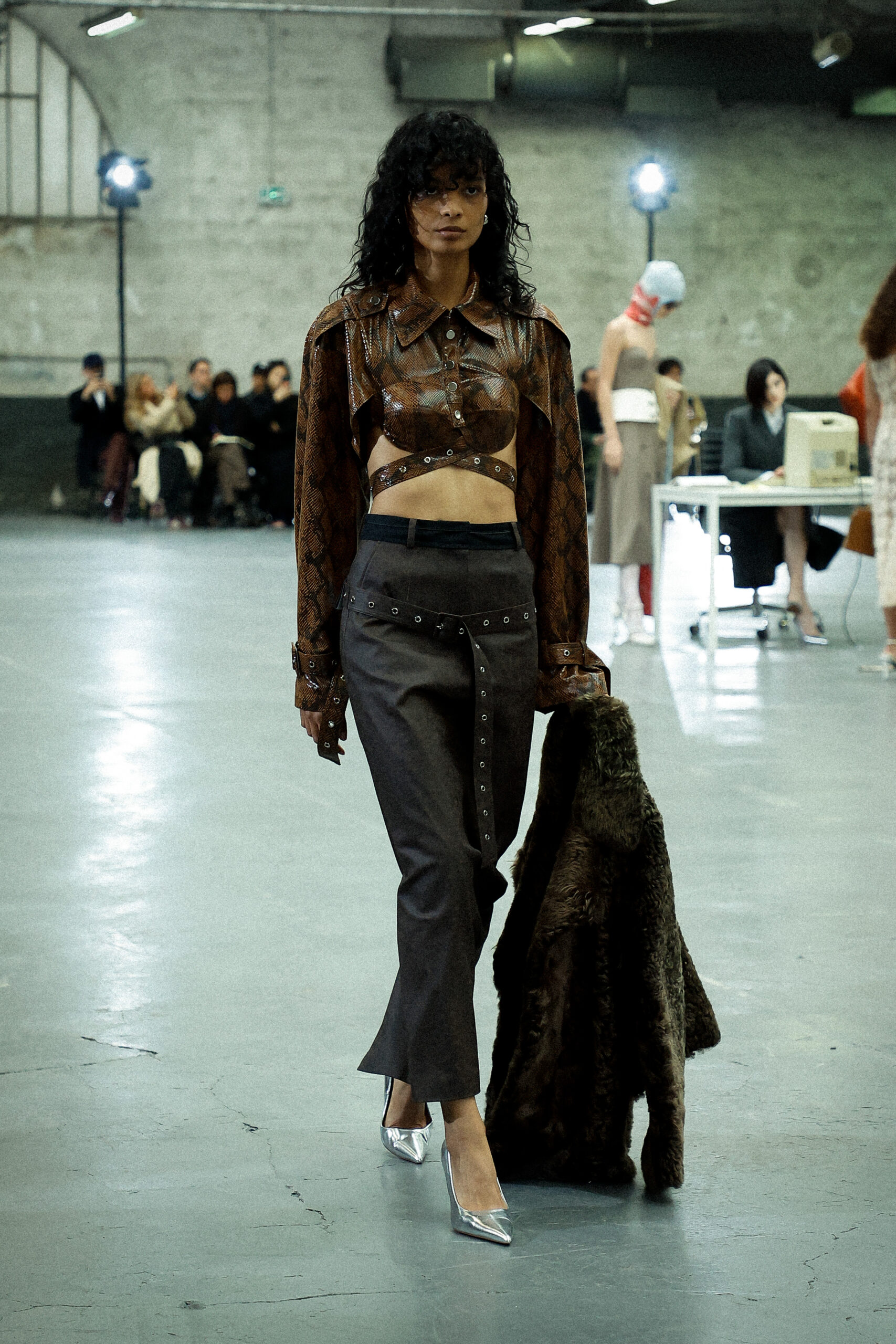 Les corsets taillés en laine vierge fine donnent le ton avec leur attrait décisif et sensuel. Construits à l’aide de techniques de couture méticuleuses, ces corsets présentent des pinces bien placées, des coutures verticales et des structures internes qui accentuent la taille. Pendant ce temps, le denim lavé intensément est affûté à l’aide de techniques de construction utilitaire traditionnelles et d’accents dynamiques de mélange de lavage en pierre et de lavage au sable.
