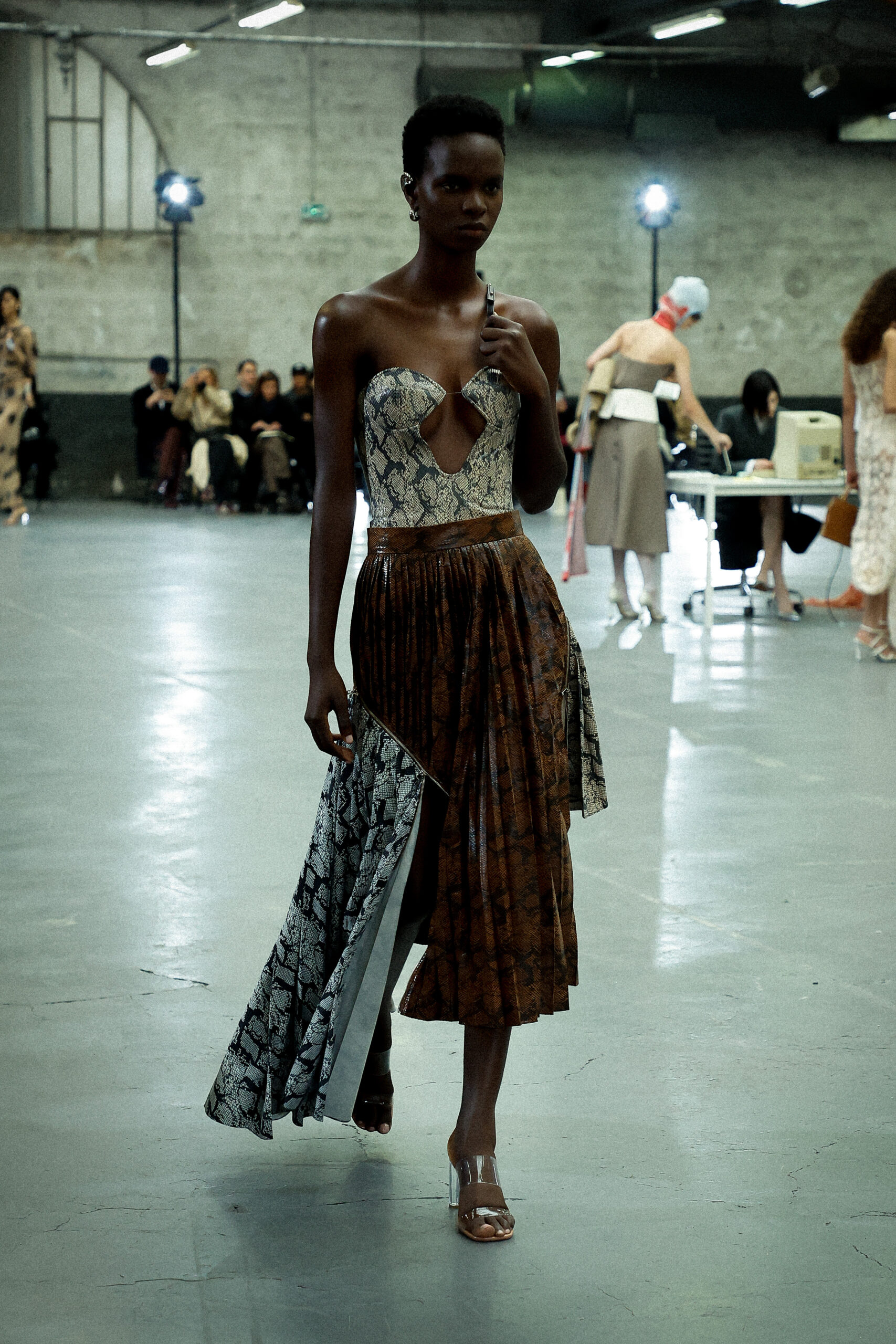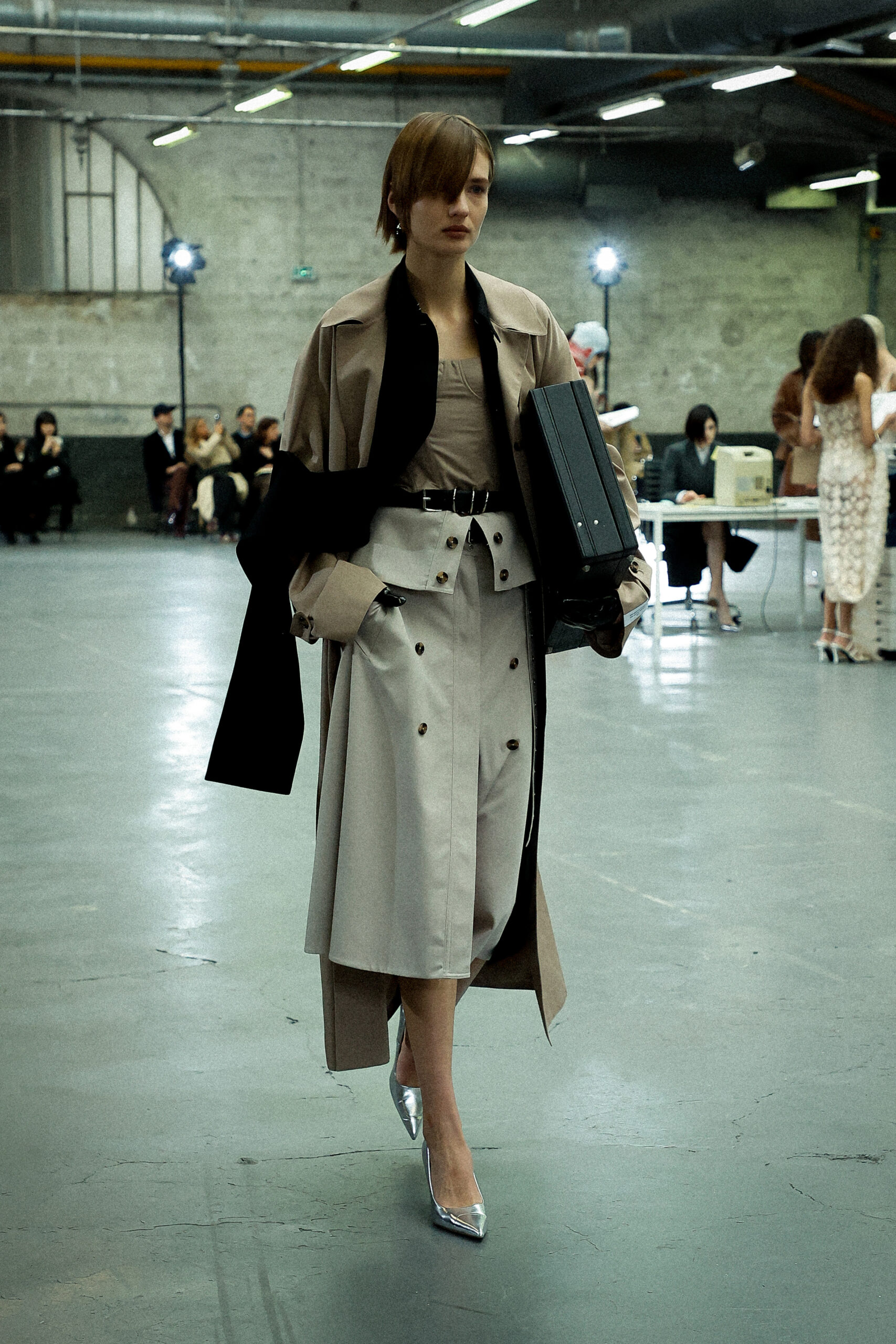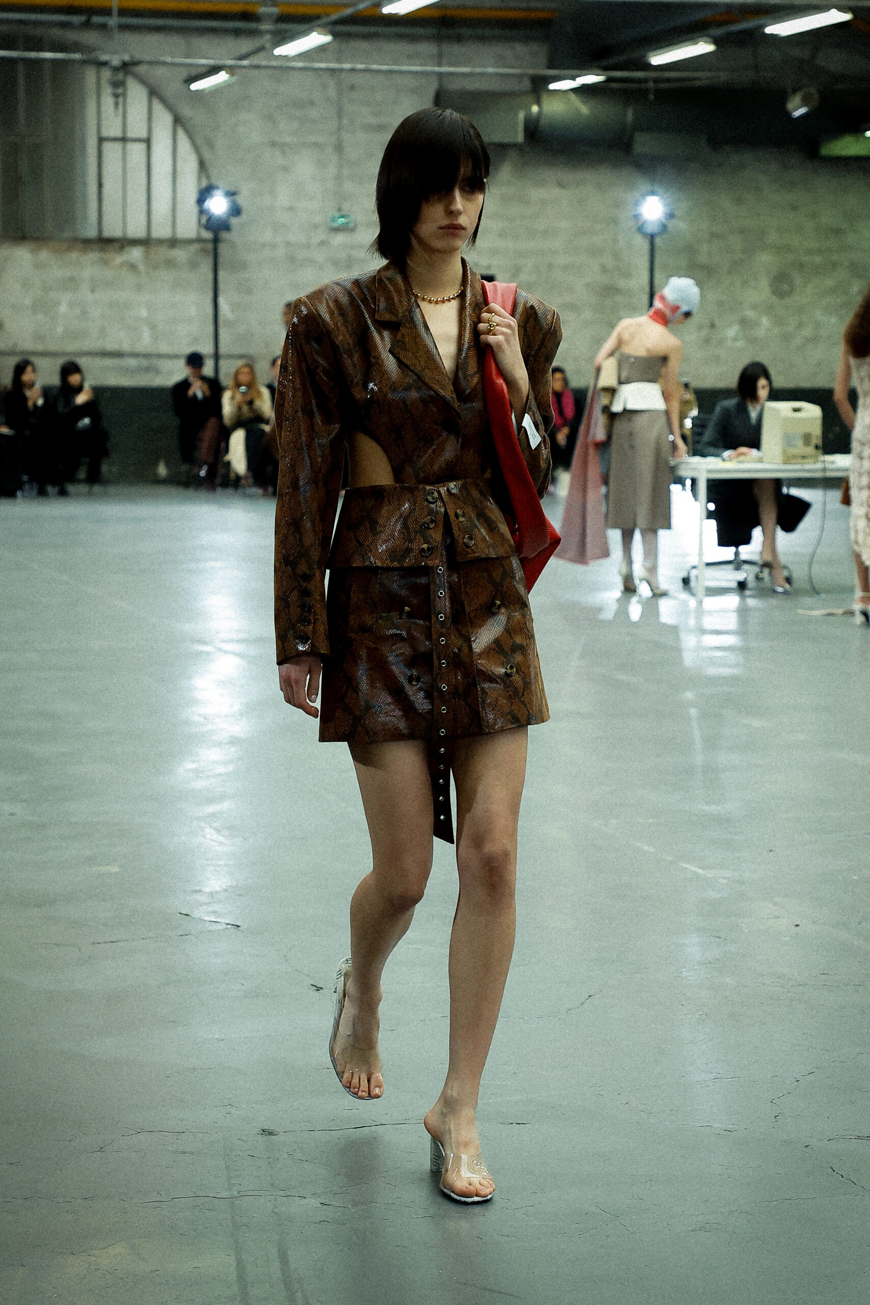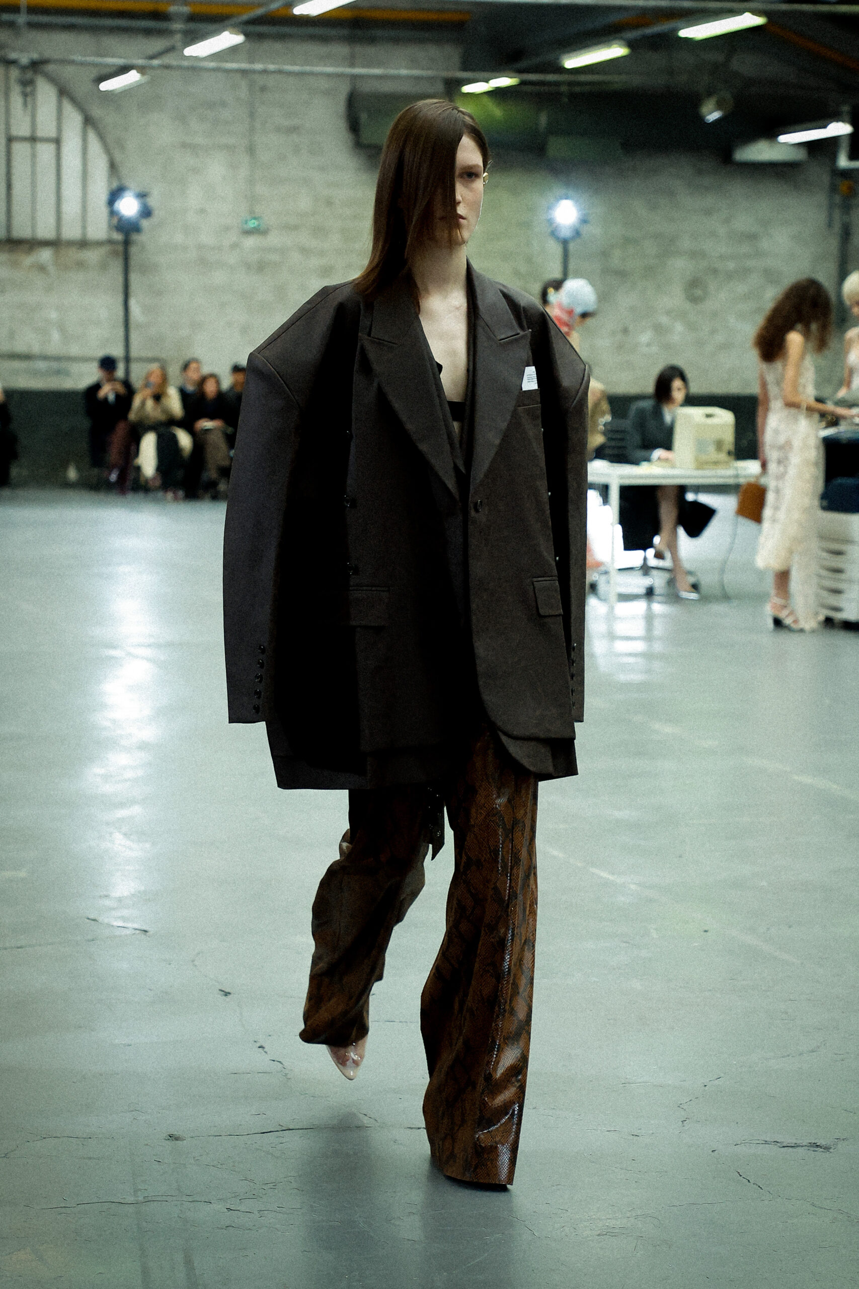 Des formes allongées telles que des pantalons structurés, des robes en jersey torsadées, des jupes crayon coupées droites et des robes minimalistes inspirées des années 90 sont parfaitement équilibrées par des vestes de tailleur pointues amplifiées avec des découpes sensuelles et des coussinets structurés et rembourrés. De plus, les silhouettes à ligne droite et les ourlets fendus introduisent des proportions fraîches et sensuelles qui prennent vie avec le mouvement.