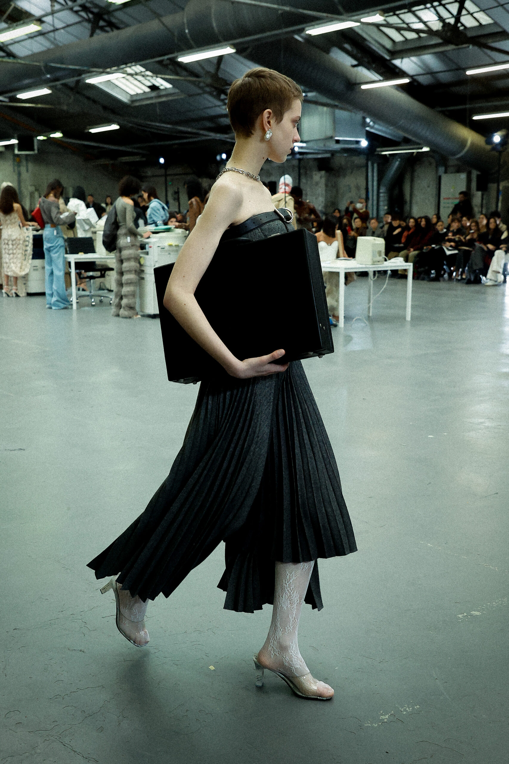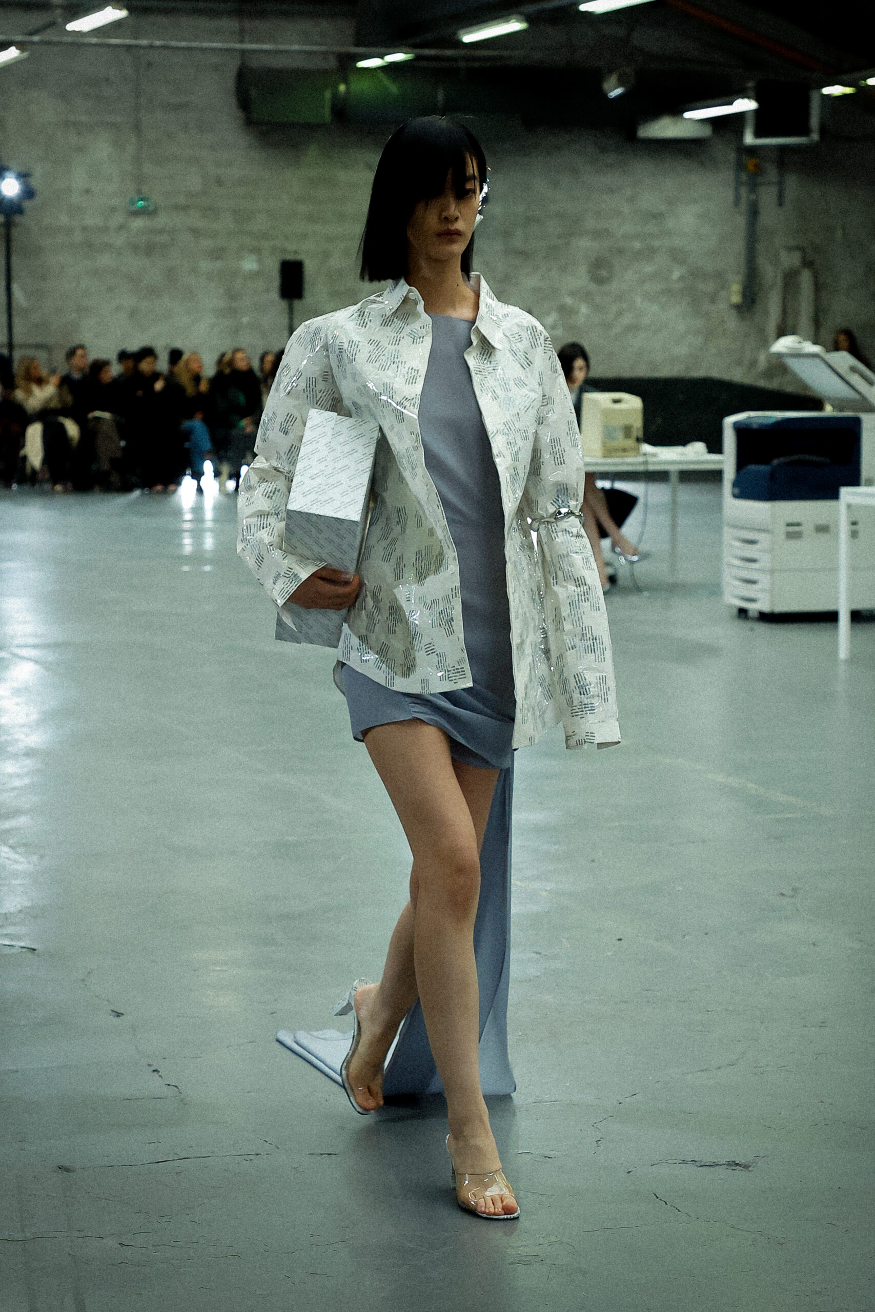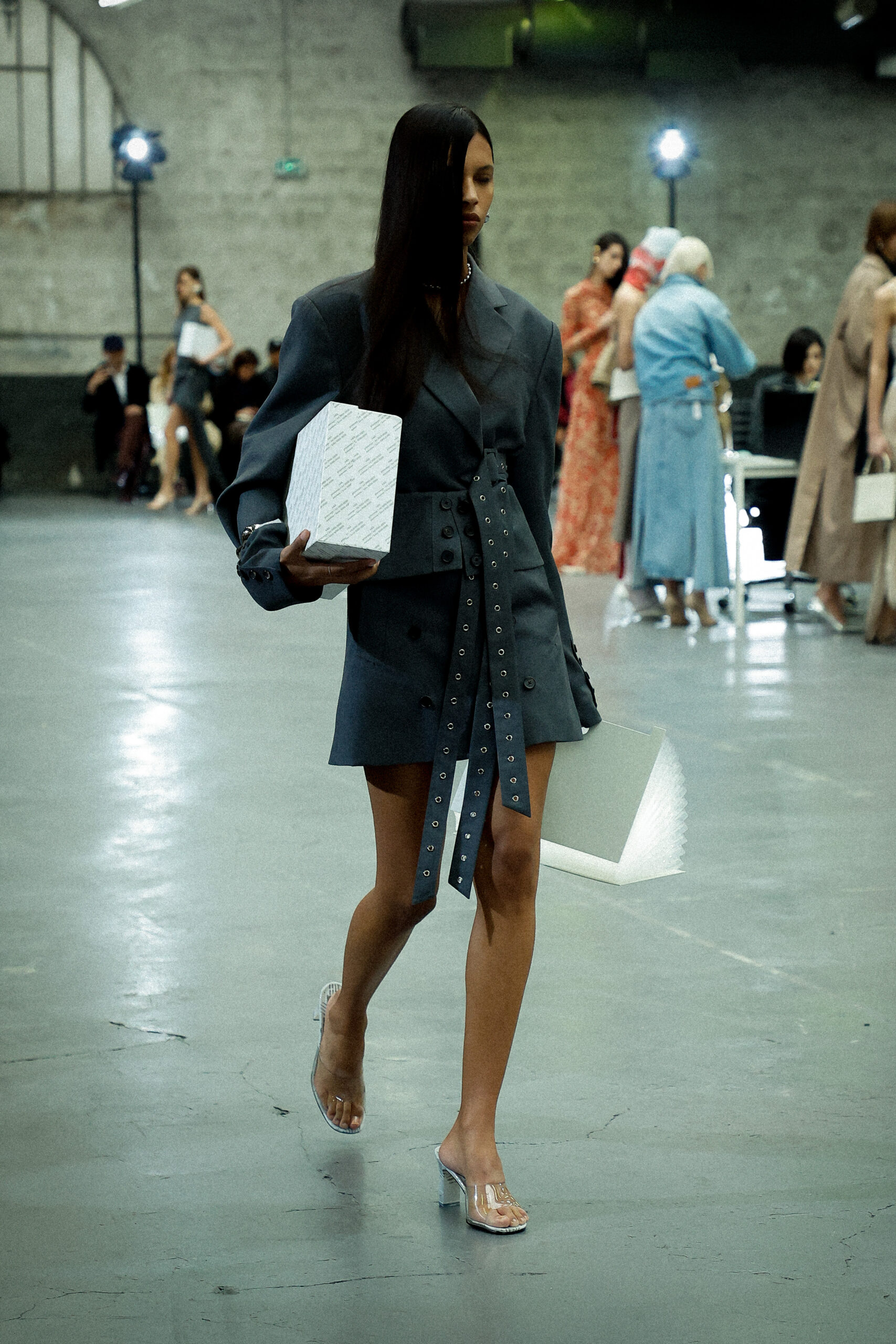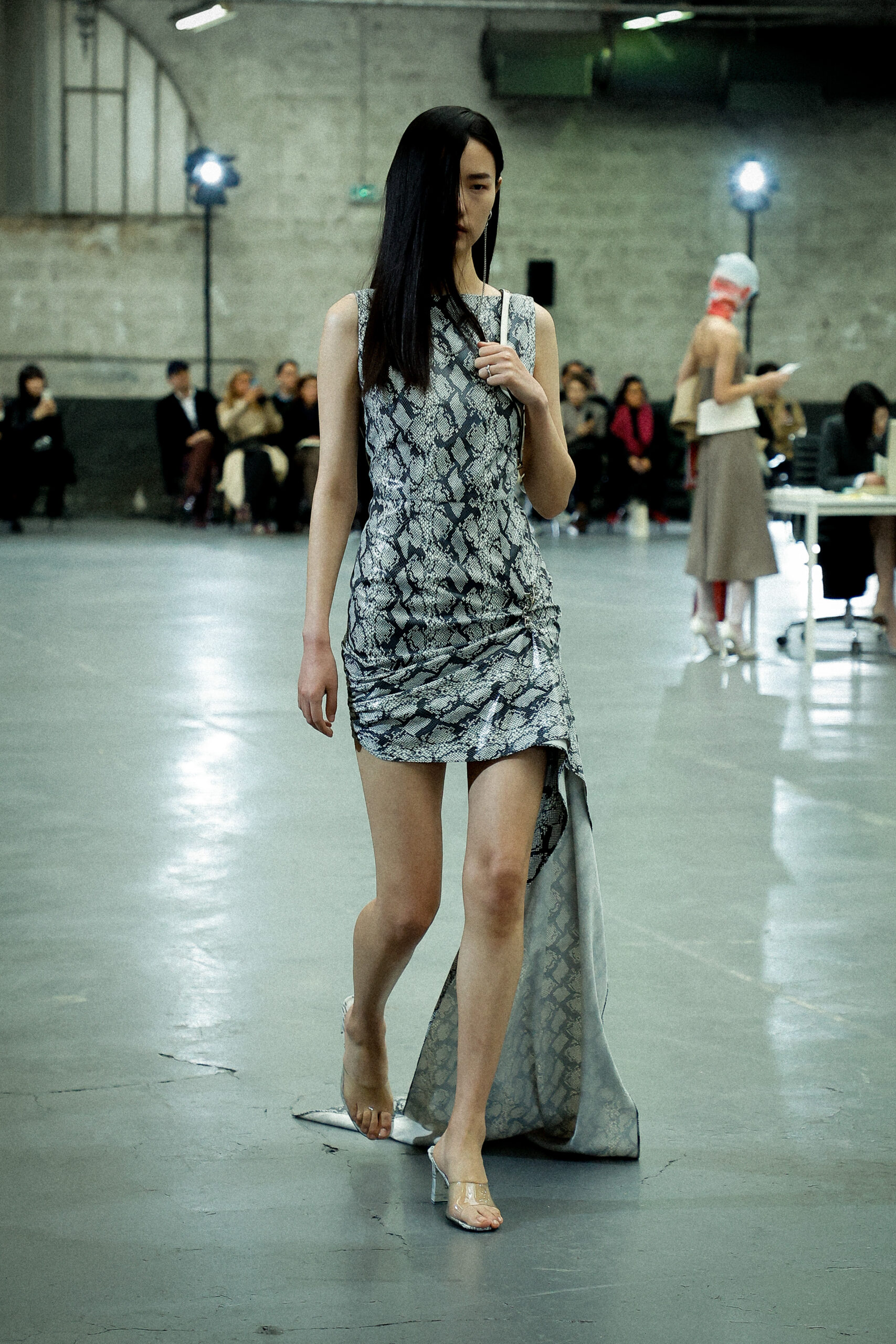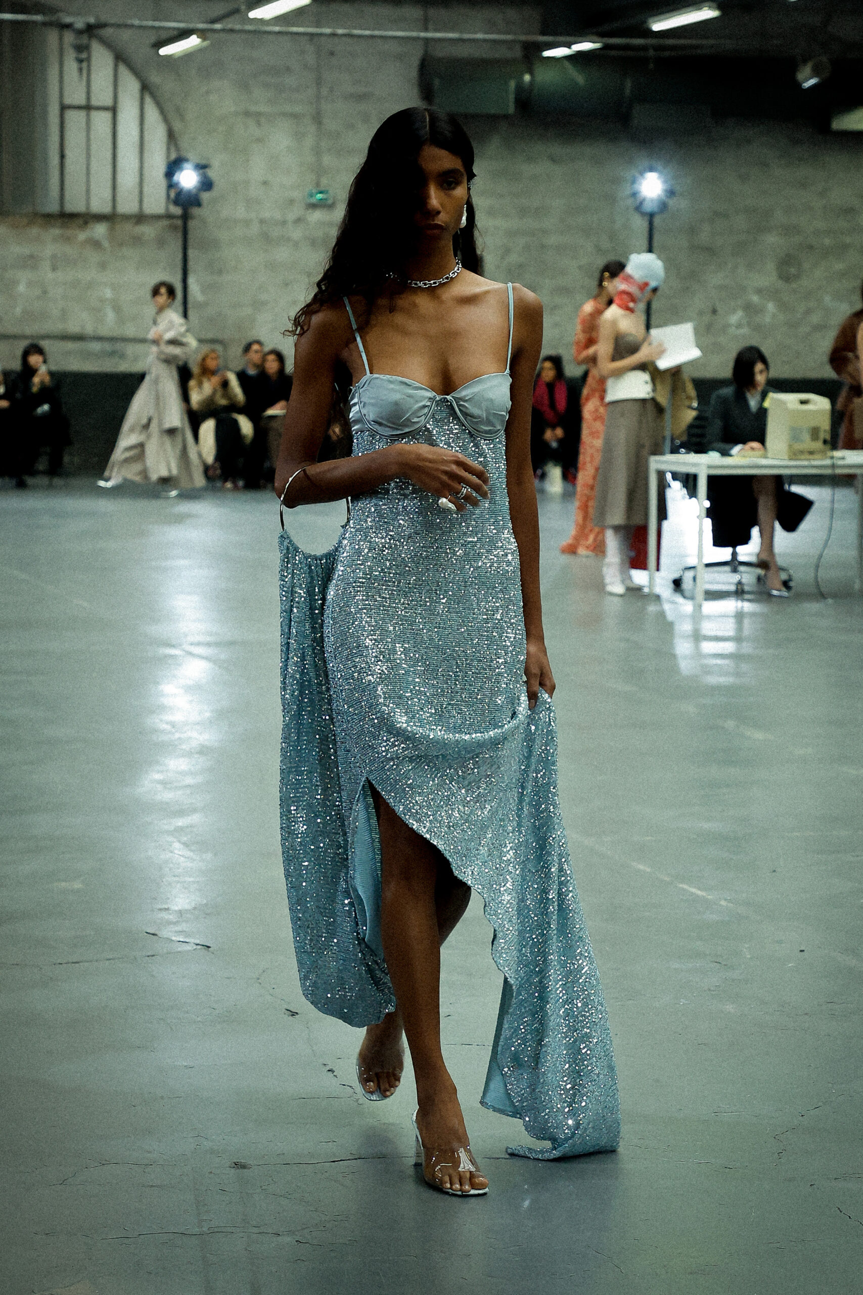 Des formes allongées telles que des pantalons structurés, des robes en jersey torsadées, des jupes crayon coupées droites et des robes minimalistes inspirées des années 90 sont parfaitement équilibrées par des vestes de tailleur pointues amplifiées avec des découpes sensuelles et des coussinets structurés et rembourrés. De plus, les silhouettes à ligne droite et les ourlets fendus introduisent des proportions fraîches et sensuelles qui prennent vie avec le mouvement.
