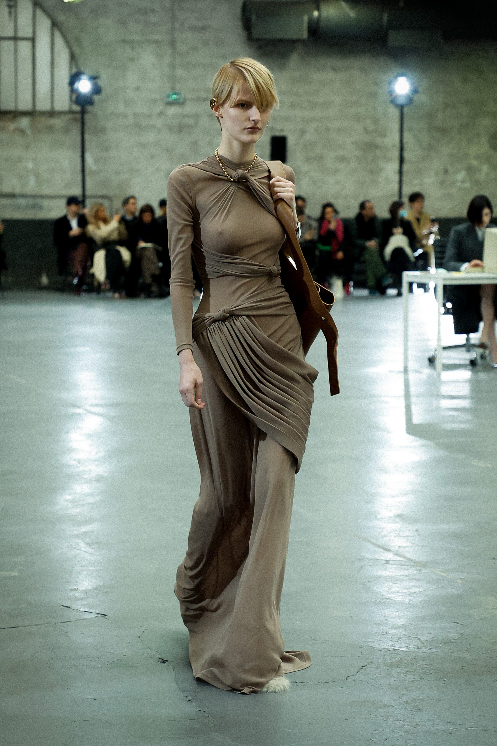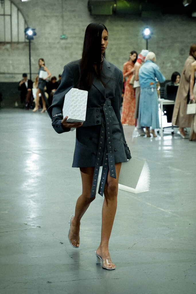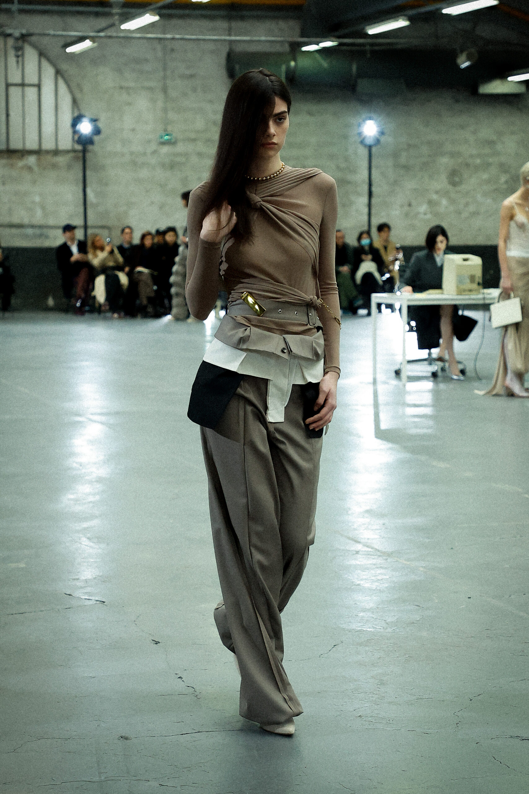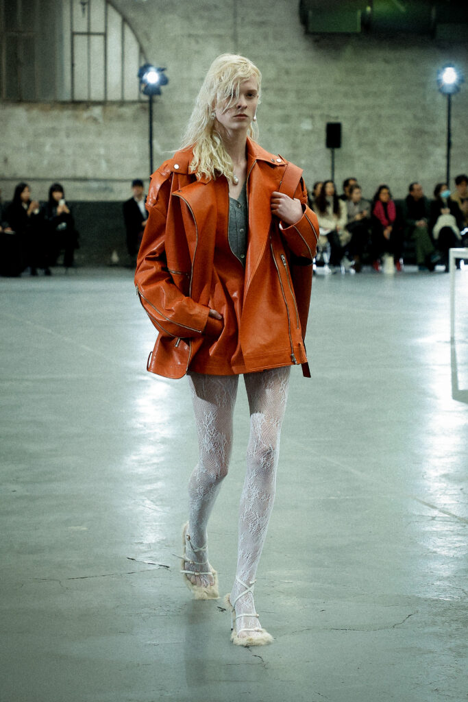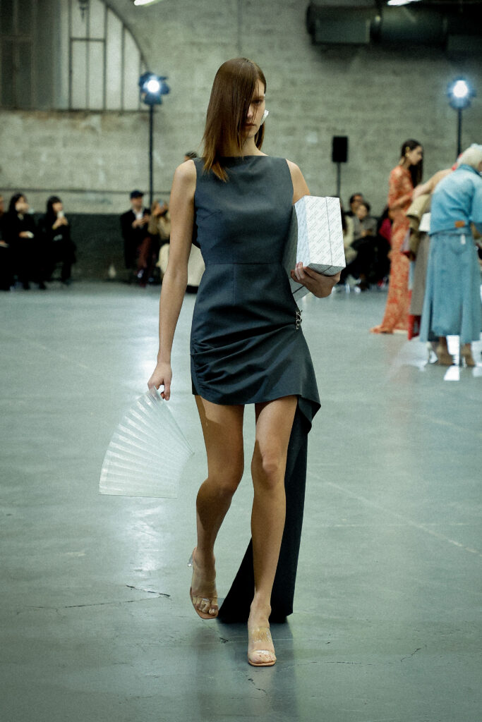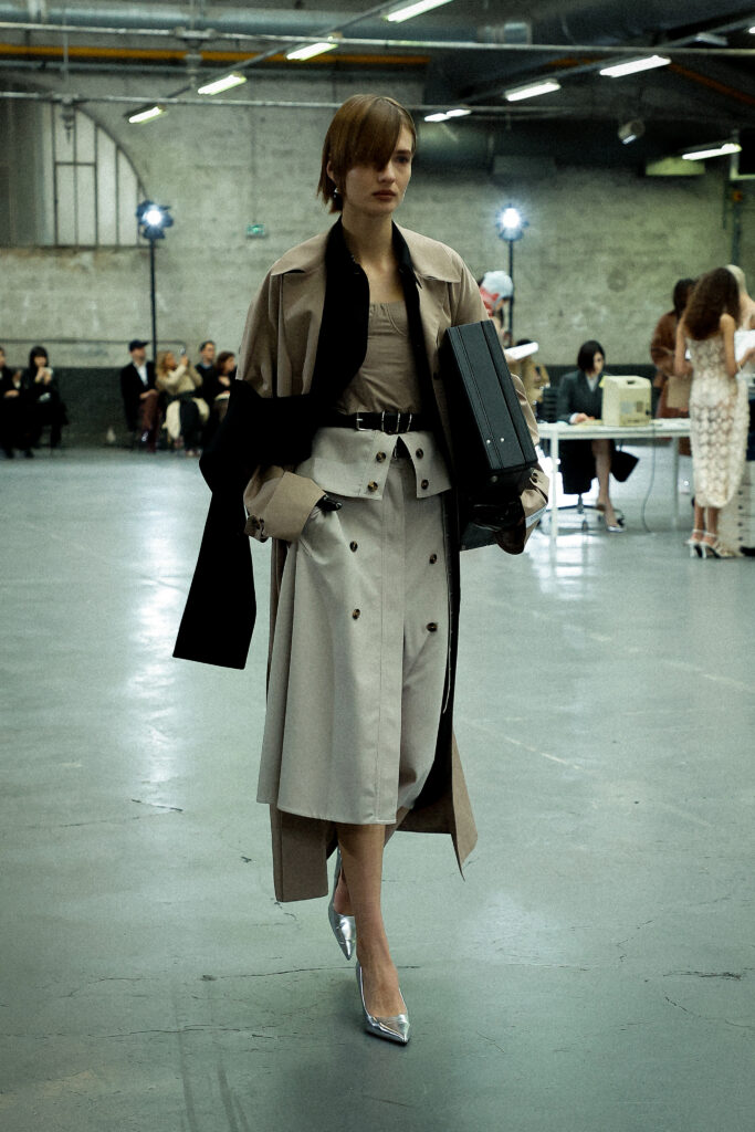 La palette principalement neutre, stimulée par un accent orange mandarine profond, met l’accent sur les mélanges de matériaux artistiquement travaillés et les finitions distinctives. Les ourlets bruts, la construction inversée de la couture et le drapé torsadé sur le jersey de soie transparent ajoutent à l’attrait unique de la collection.