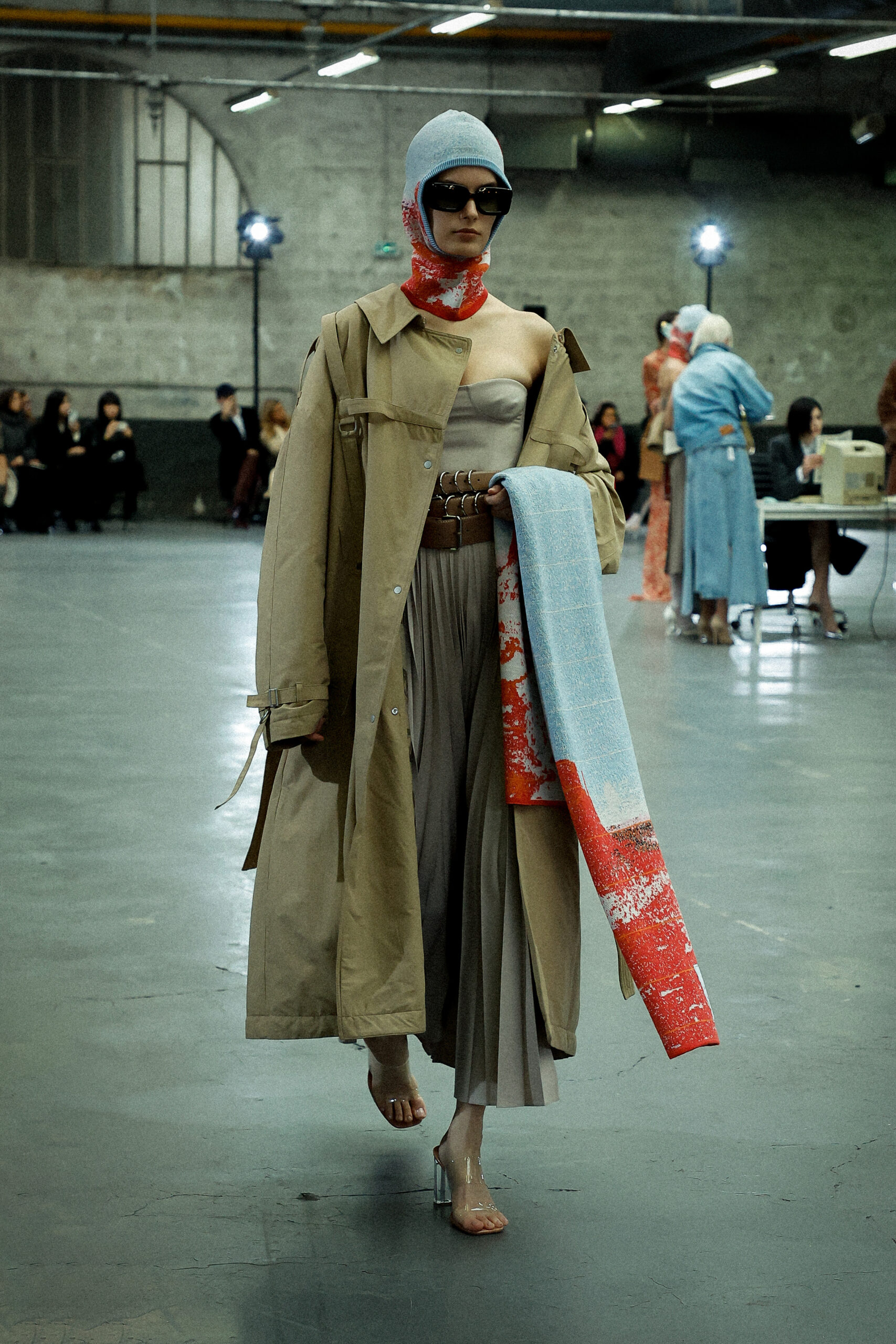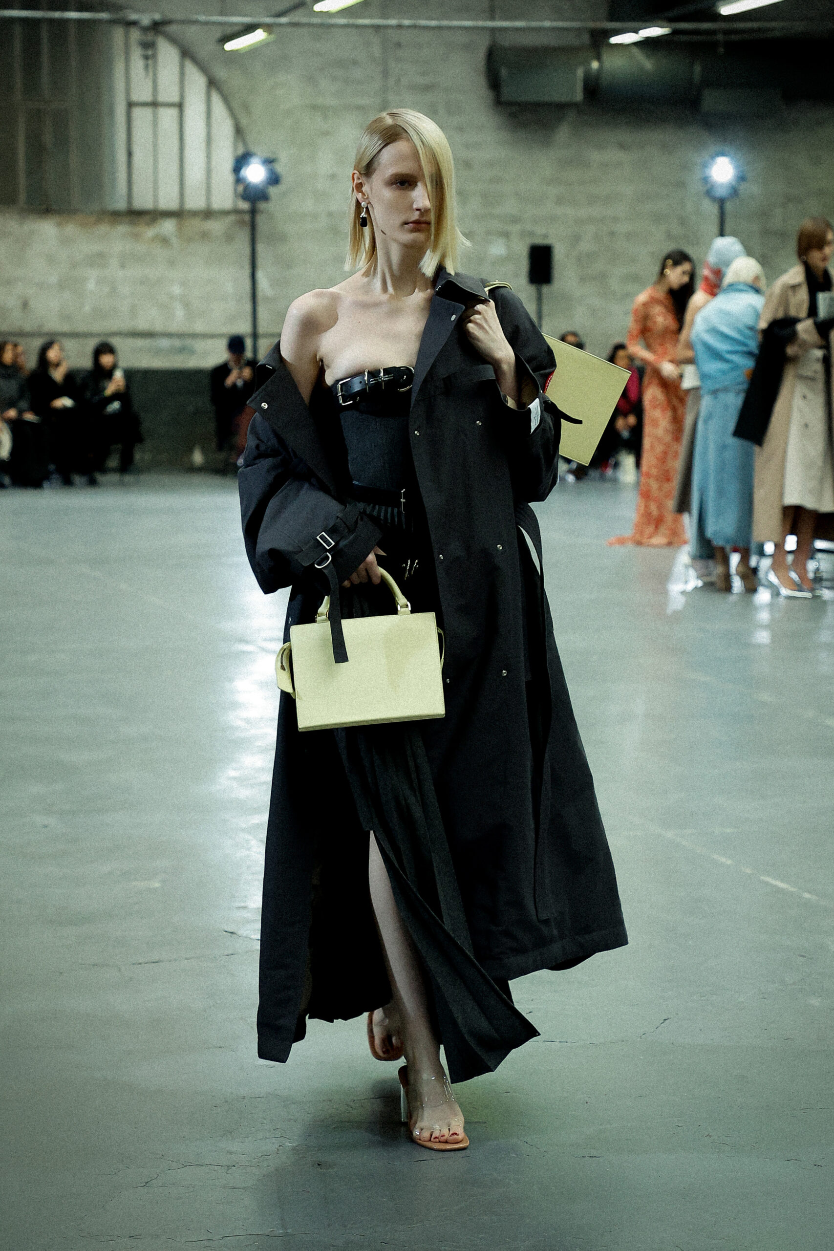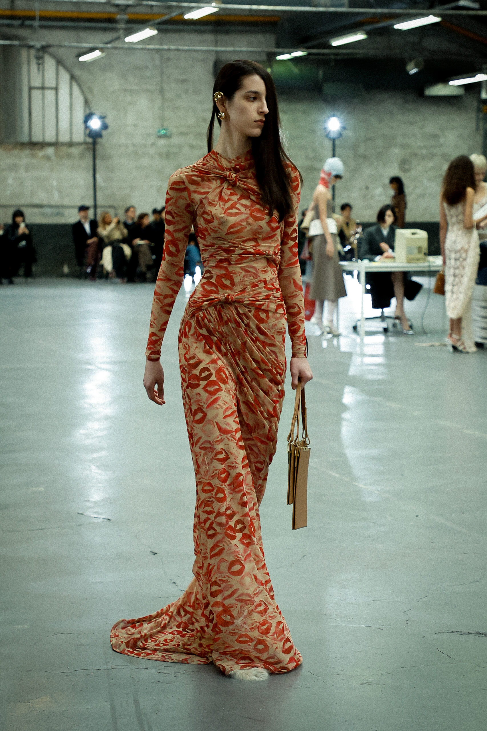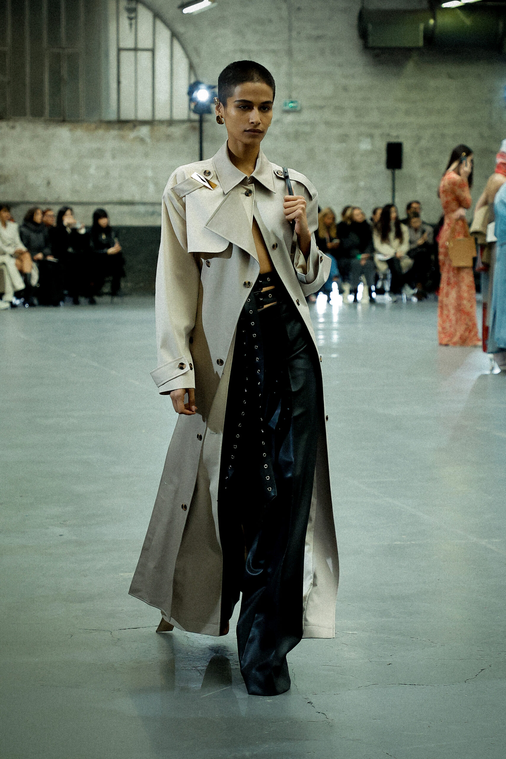 La palette principalement neutre, stimulée par un accent orange mandarine profond, met l’accent sur les mélanges de matériaux artistiquement travaillés et les finitions distinctives. Les ourlets bruts, la construction inversée de la couture et le drapé torsadé sur le jersey de soie transparent ajoutent à l’attrait unique de la collection.