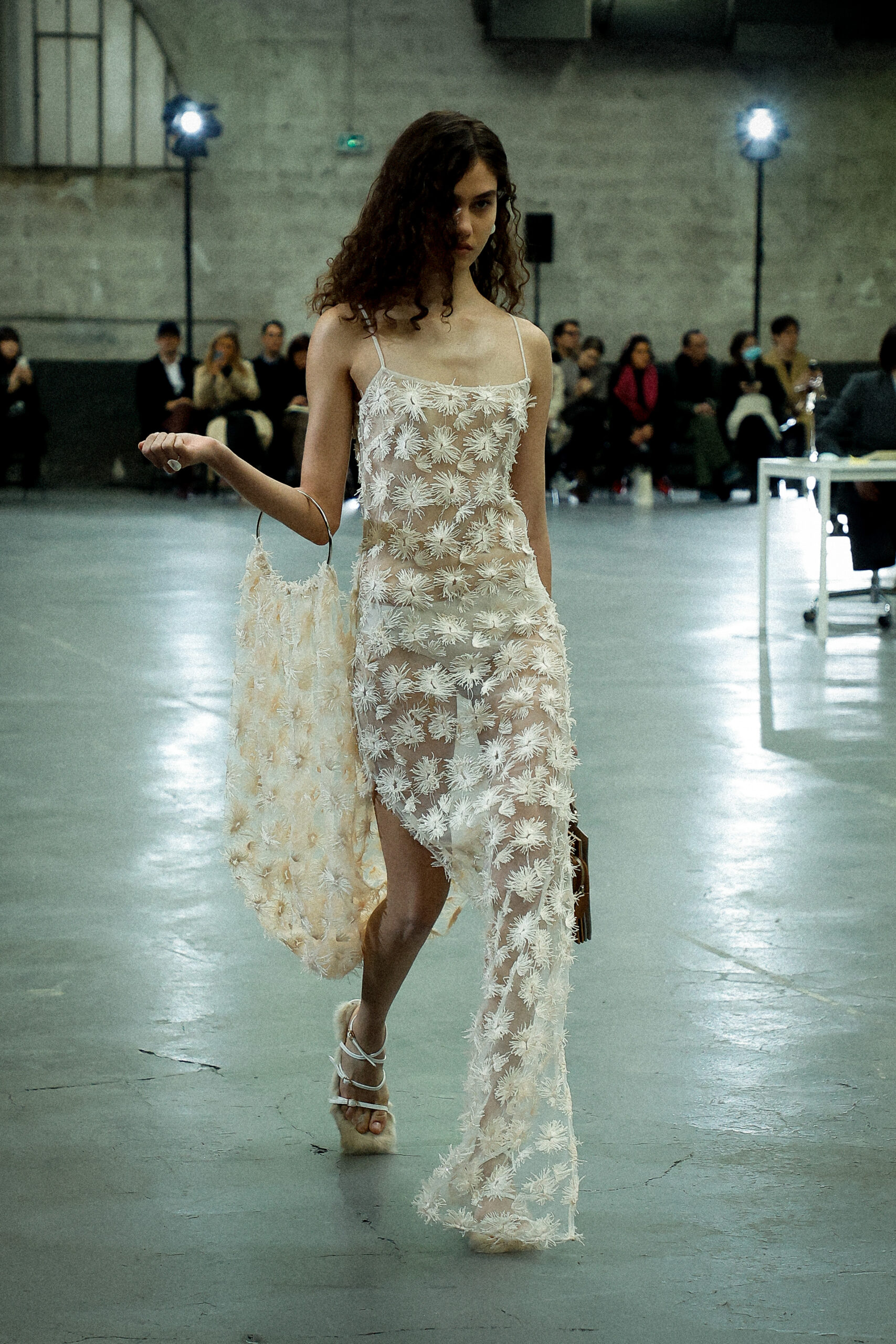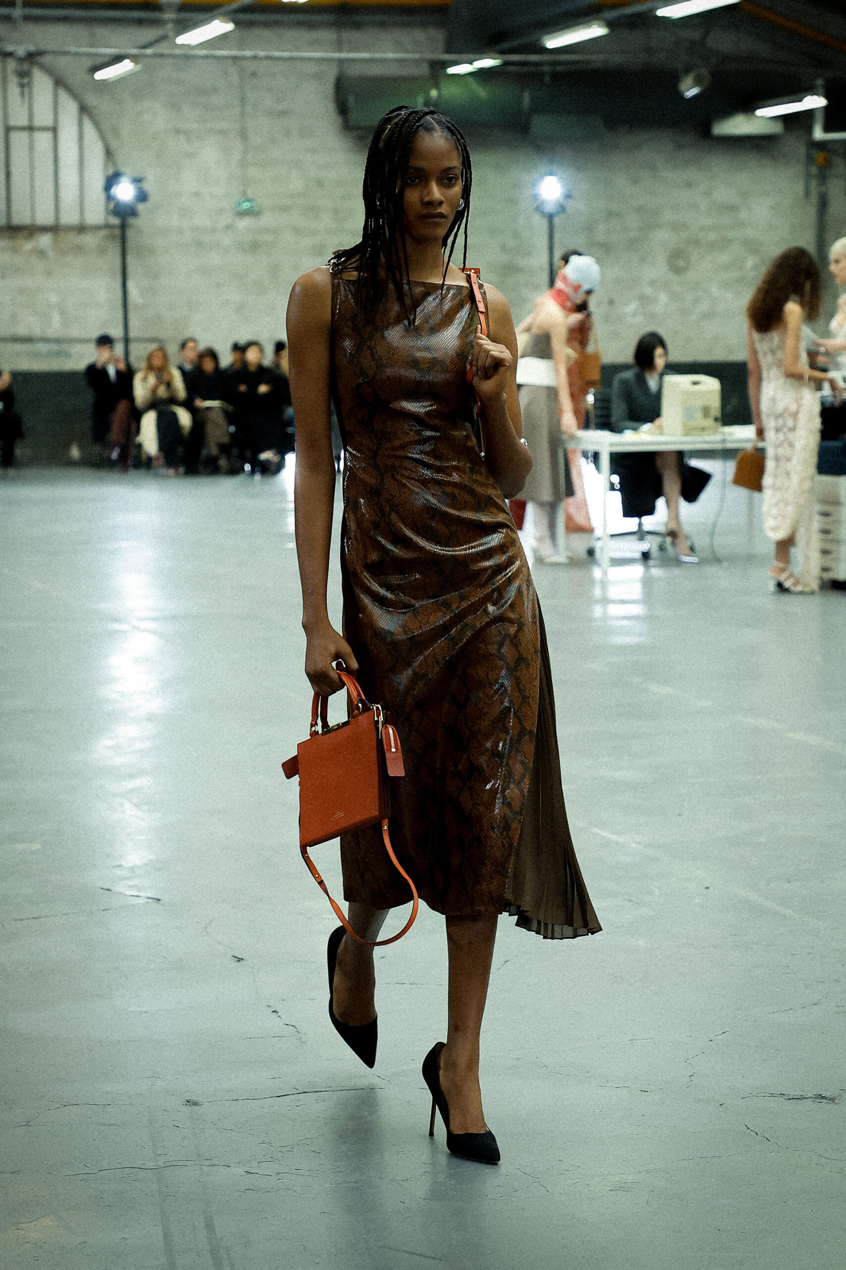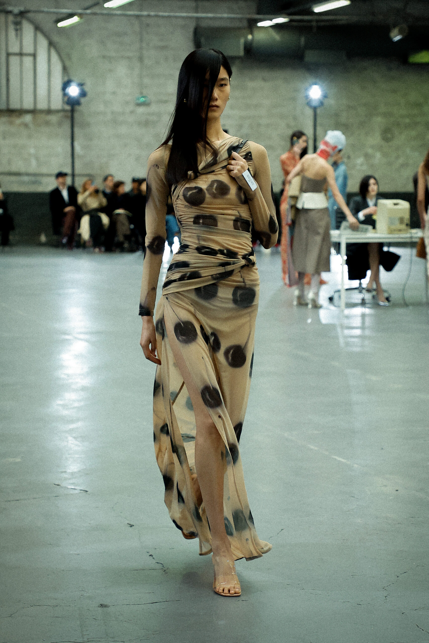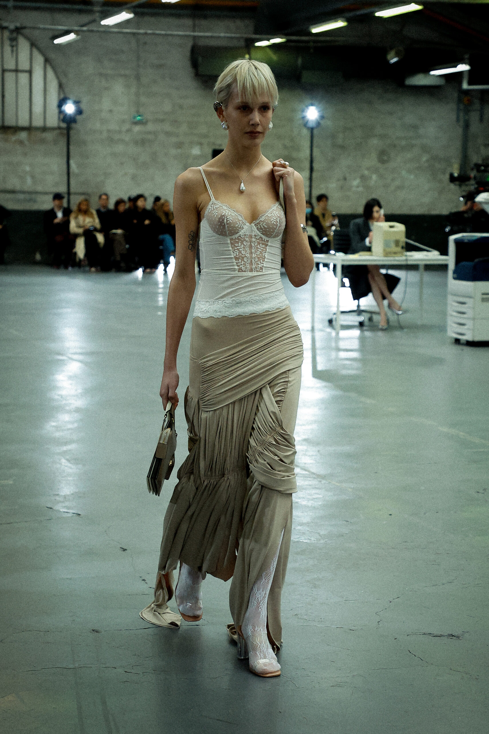 La palette principalement neutre, stimulée par un accent orange mandarine profond, met l’accent sur les mélanges de matériaux artistiquement travaillés et les finitions distinctives. Les ourlets bruts, la construction inversée de la couture et le drapé torsadé sur le jersey de soie transparent ajoutent à l’attrait unique de la collection.