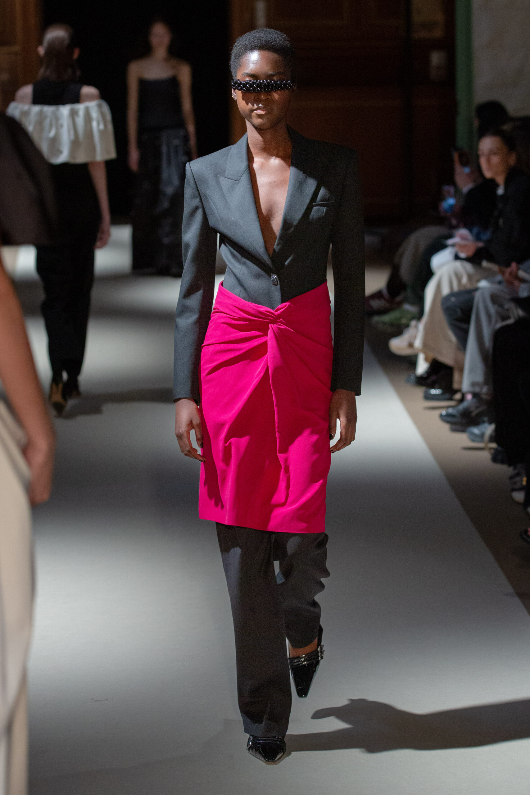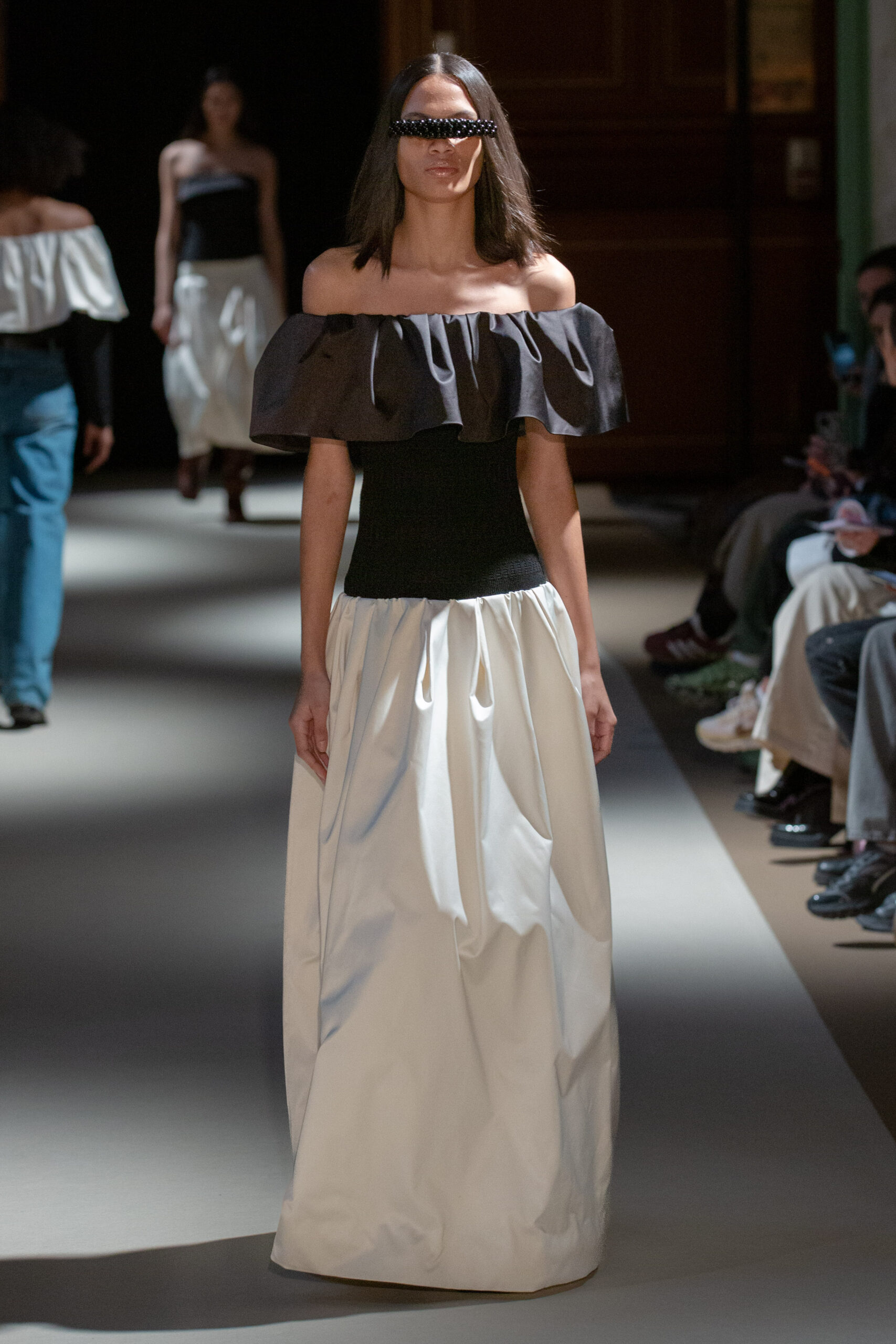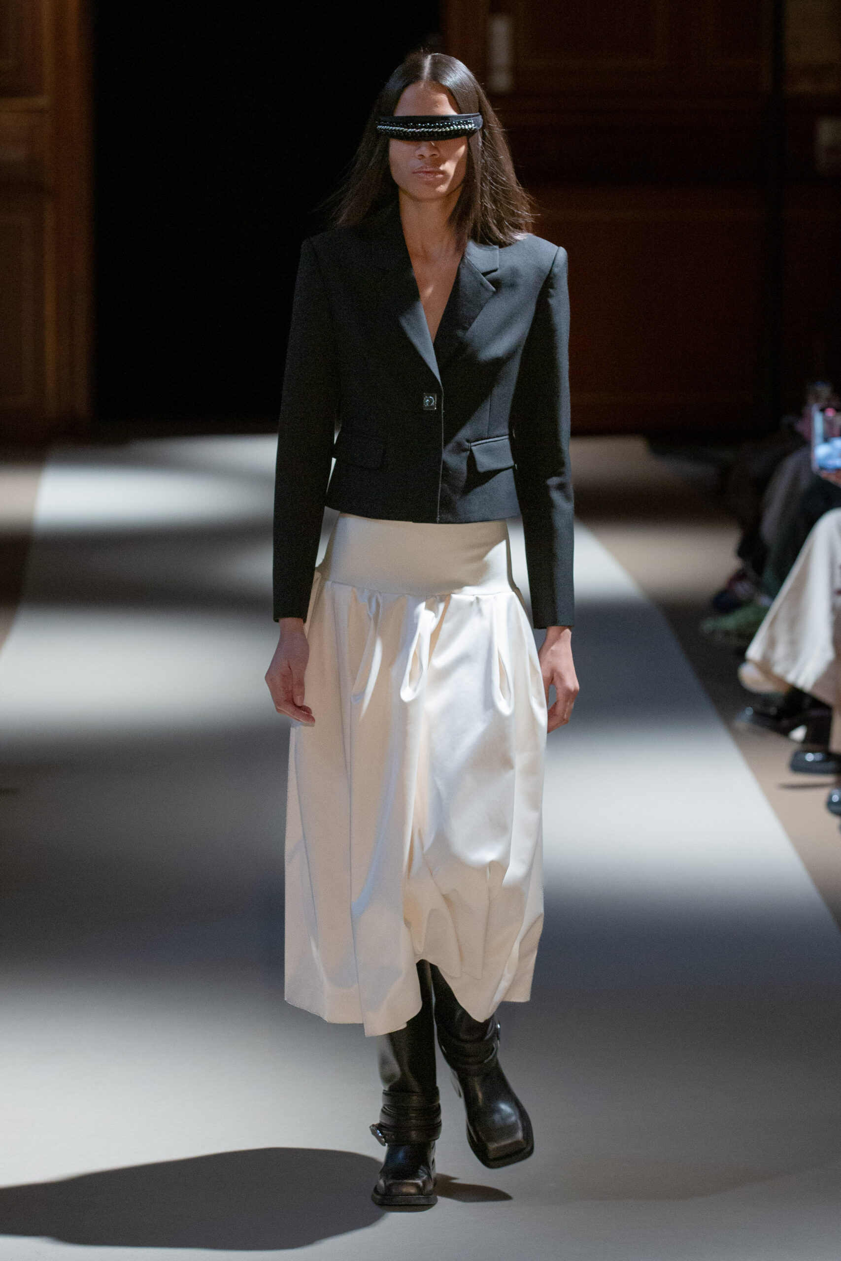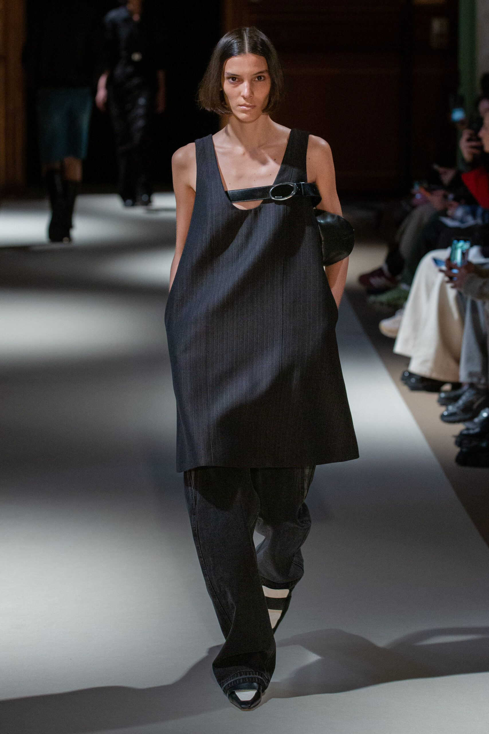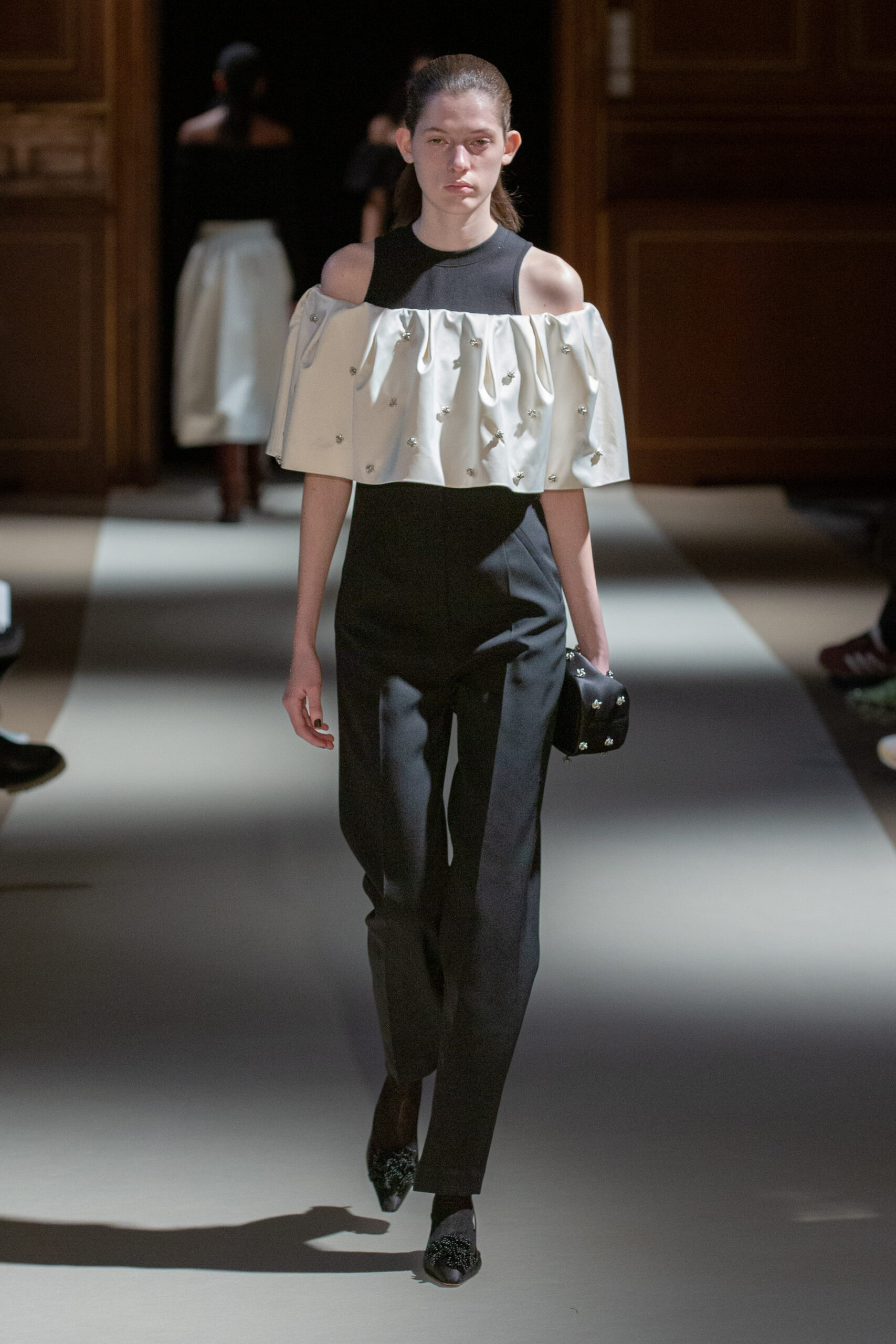 La collection se compose de pièces féminines et délicates, comme des plis fluides en mousseline de soie, des tricots aux épaules renforcées de ressorts métalliques, et des costumes noirs classiques agrémentés de plis en taffetas. La collection met également en avant des éléments novateurs comme des ceintures multi-niveaux, des lanières et des rayures pour rafraîchir les coupes et les basiques.