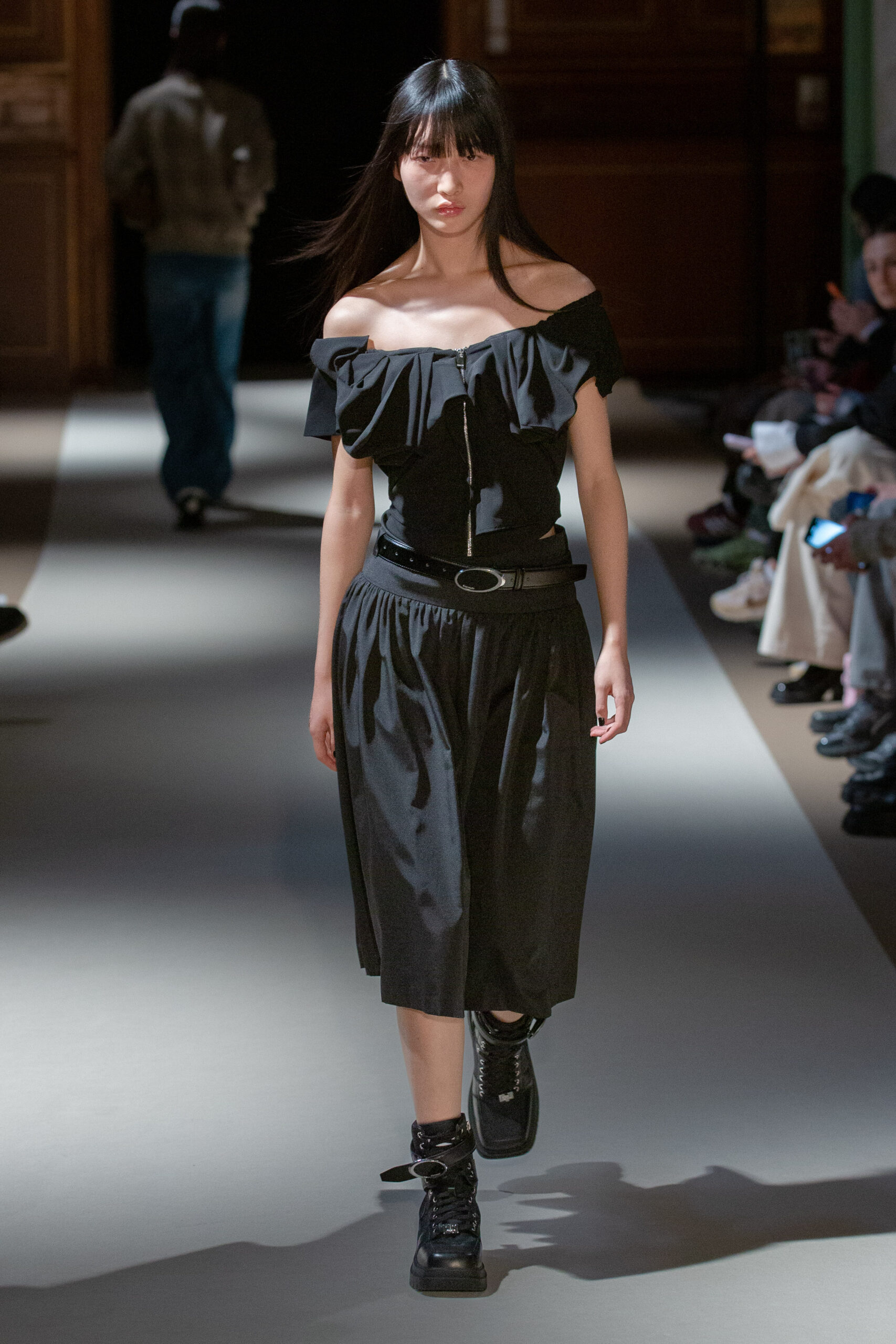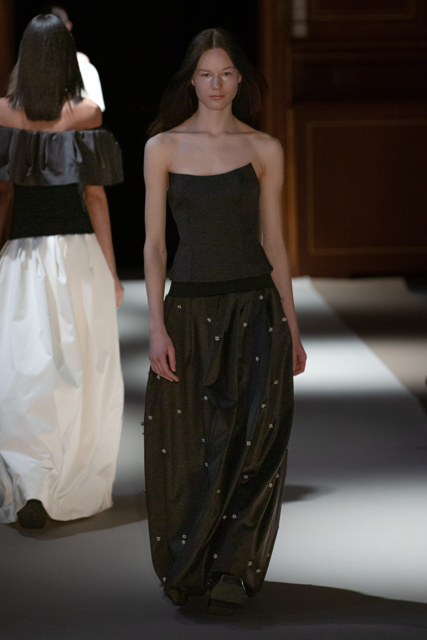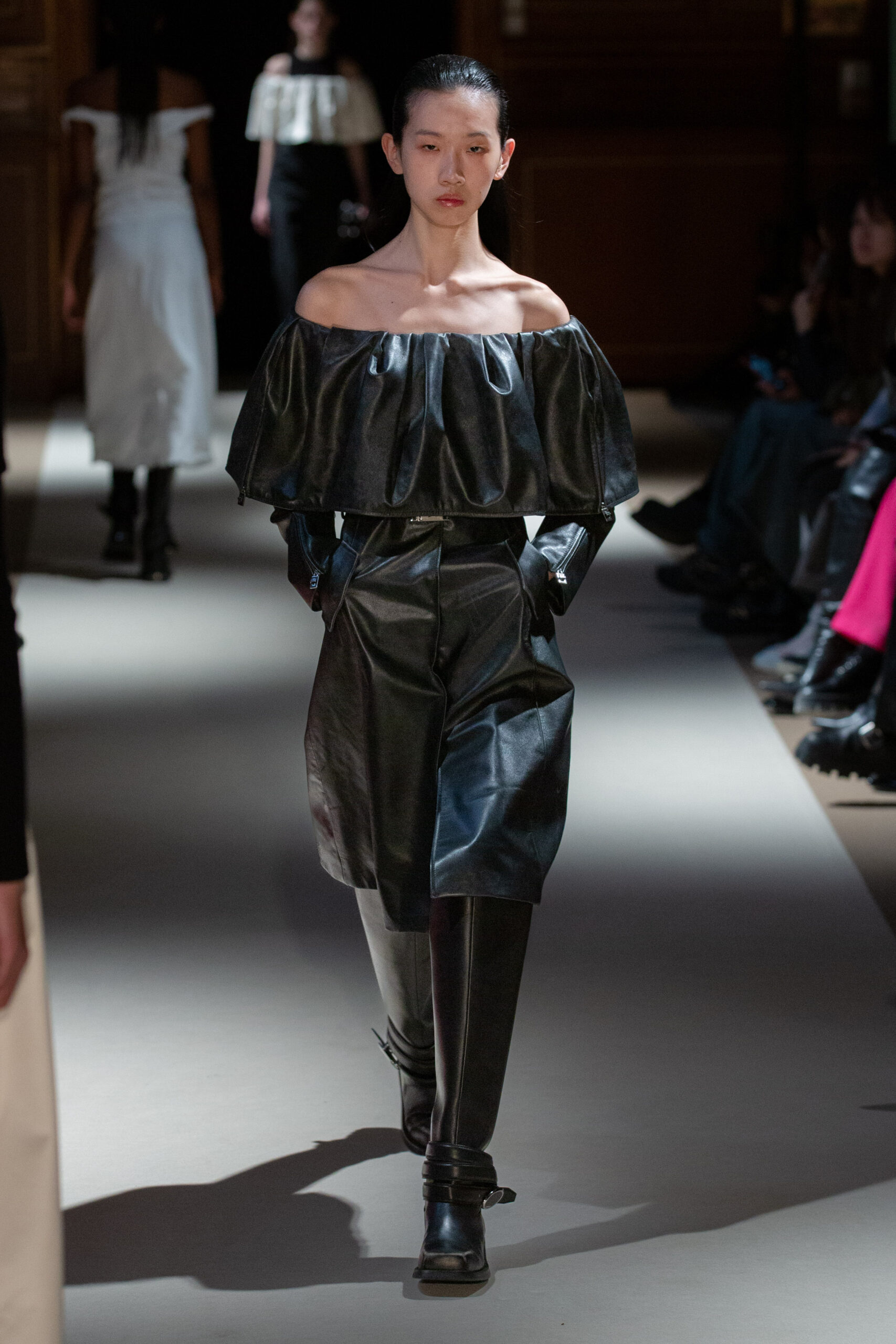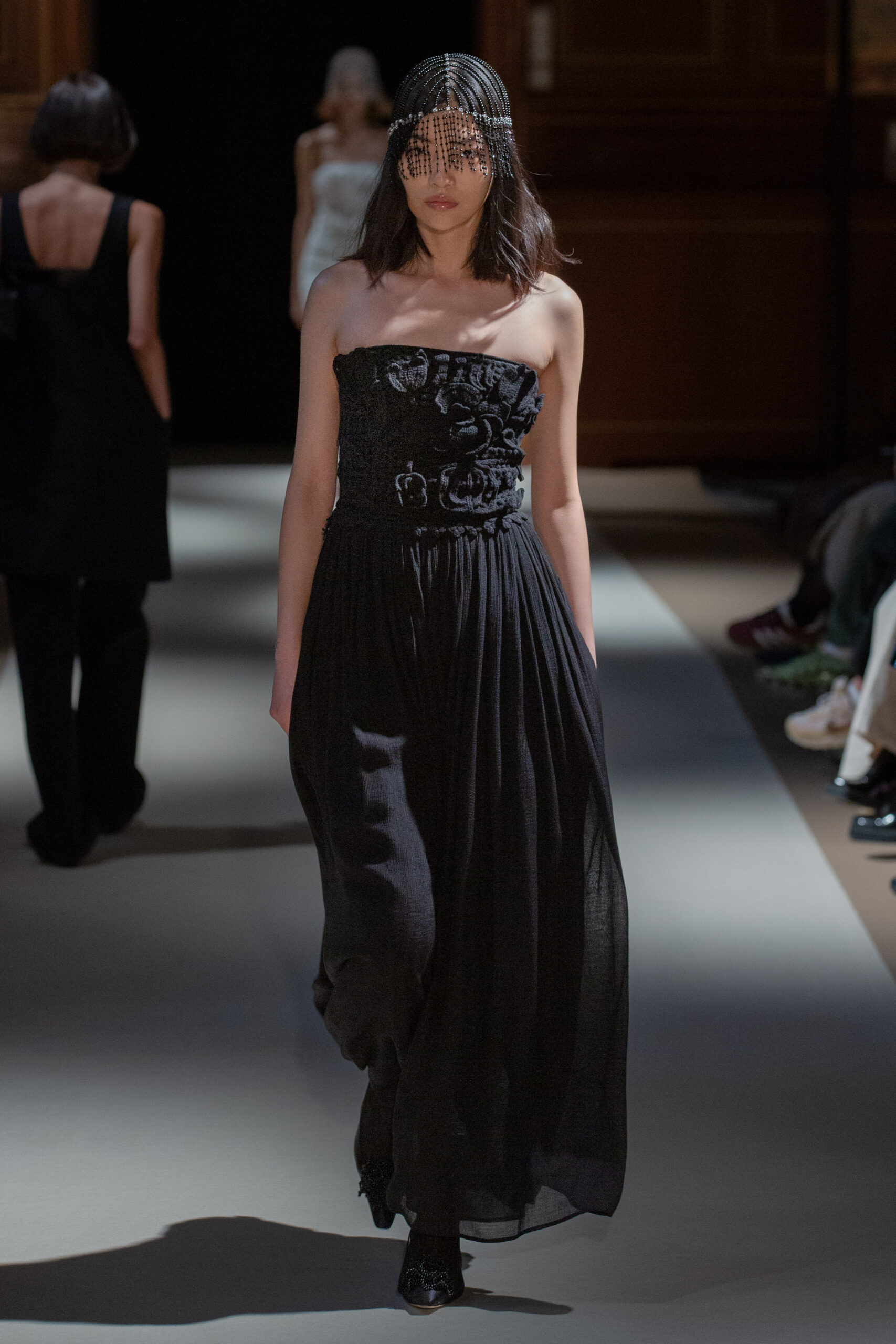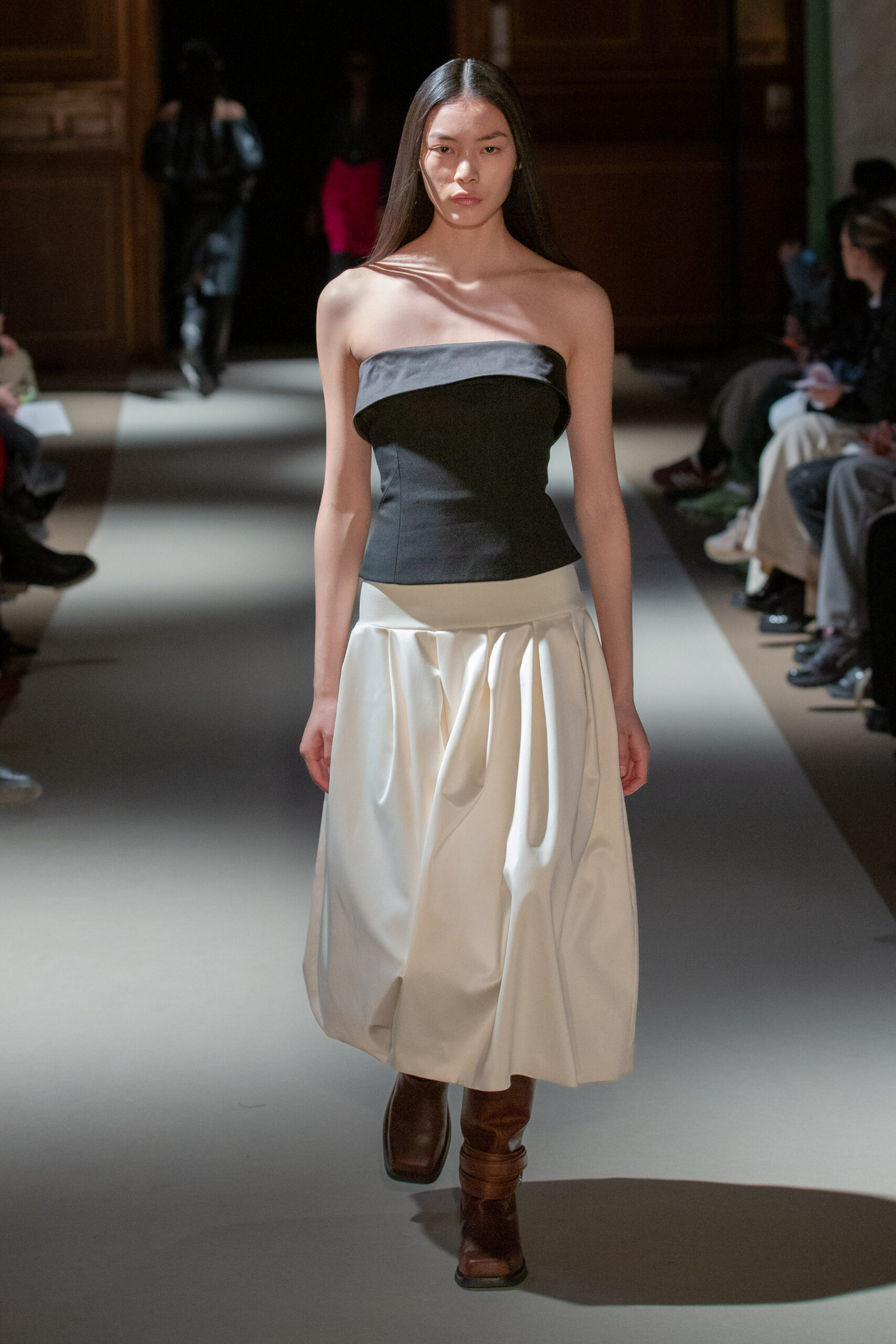La collection se compose de pièces féminines et délicates, comme des plis fluides en mousseline de soie, des tricots aux épaules renforcées de ressorts métalliques, et des costumes noirs classiques agrémentés de plis en taffetas. La collection met également en avant des éléments novateurs comme des ceintures multi-niveaux, des lanières et des rayures pour rafraîchir les coupes et les basiques.