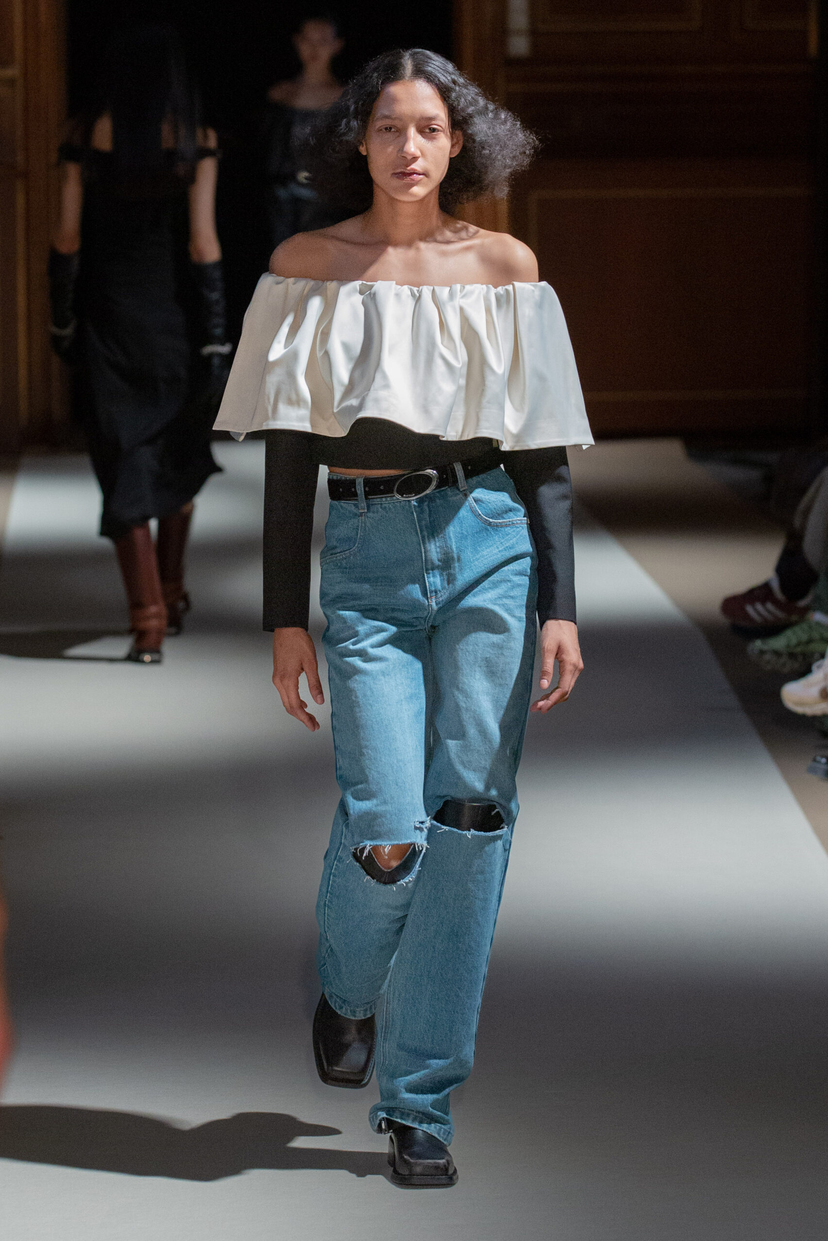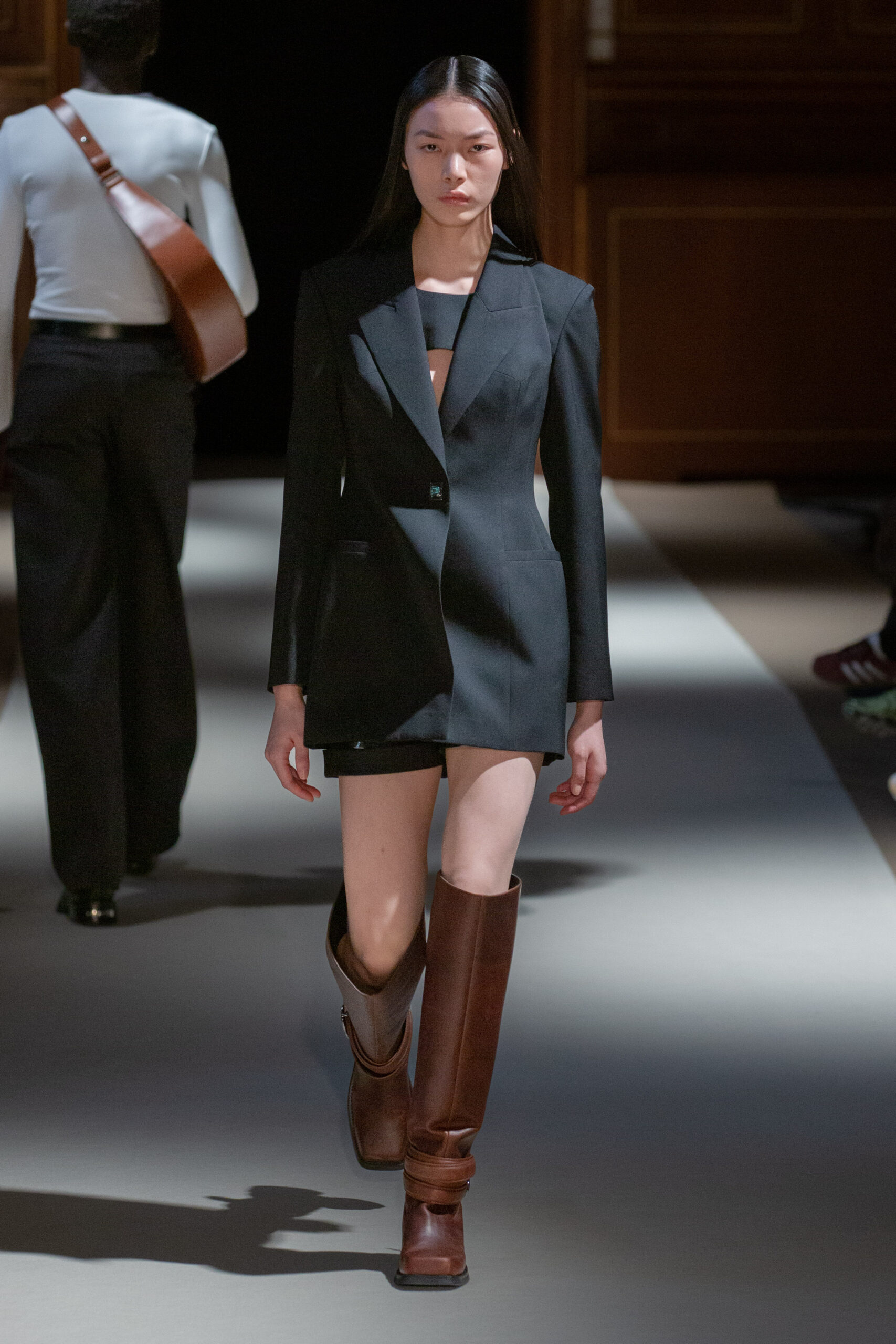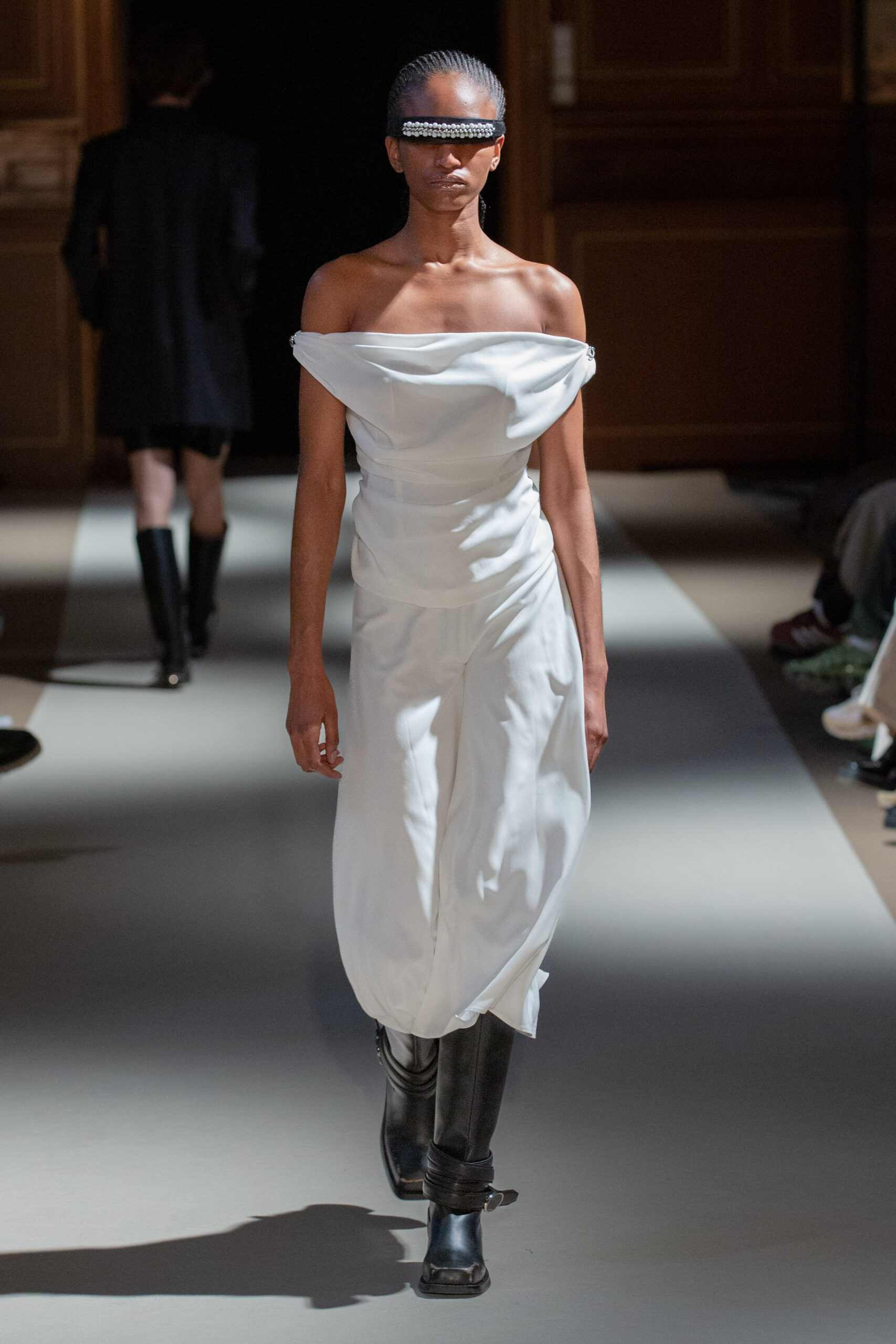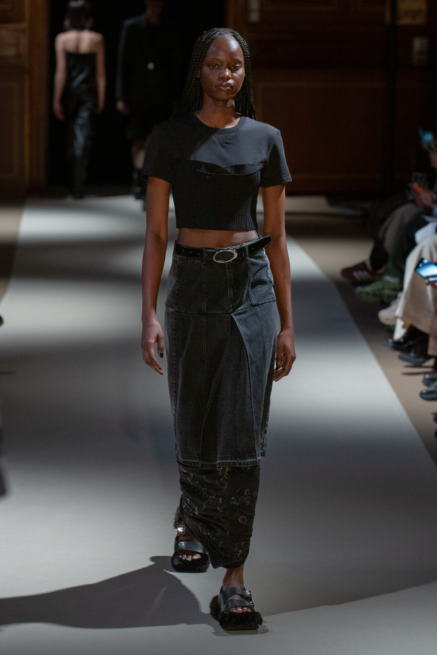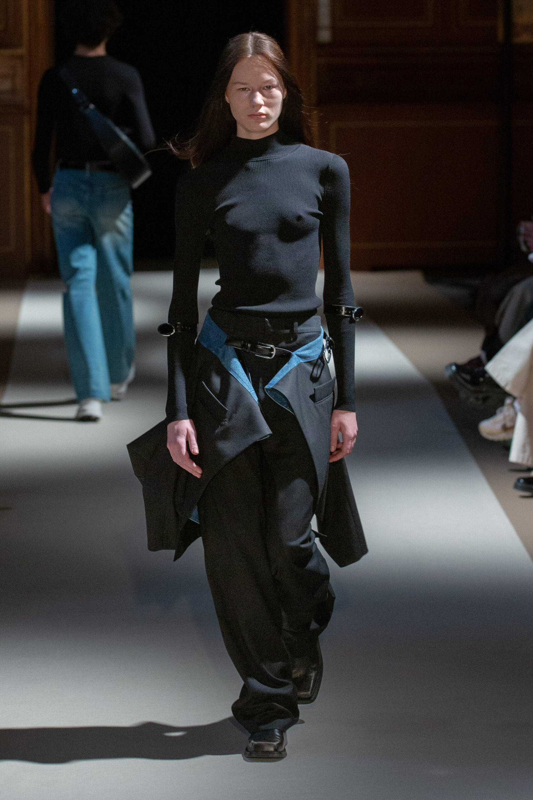 La collection se compose de pièces féminines et délicates, comme des plis fluides en mousseline de soie, des tricots aux épaules renforcées de ressorts métalliques, et des costumes noirs classiques agrémentés de plis en taffetas. La collection met également en avant des éléments novateurs comme des ceintures multi-niveaux, des lanières et des rayures pour rafraîchir les coupes et les basiques.