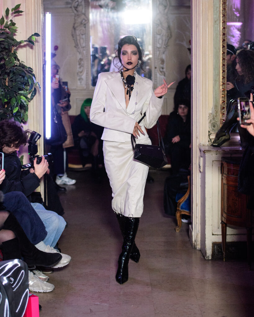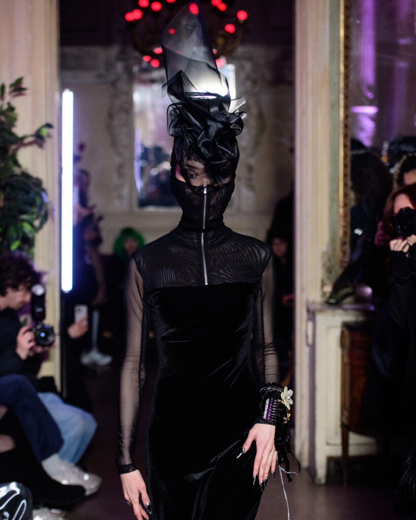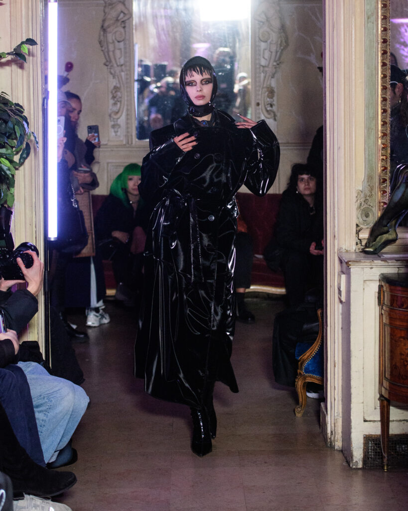 Les pièces Couture de la collection permettent d’expérimenter les idées et la créativité. Inspiré par l’étrangeté d’avoir des mouettes à Paris, Pressiat a créé une doudoune avec des manches en PVC recyclé rempli de plumes noires et blanches. De loin, cela ressemble à un imprimé Dalmatien, mais de près, les plumes font référence à la pollution des océans causée par les pétroliers et la mise en danger des oiseaux. La collection est accessoirisée avec élégance par des foulards noués autour de la tête se transformant en nœud lavallière, symboles de glamour, de pouvoir et d’indépendance.