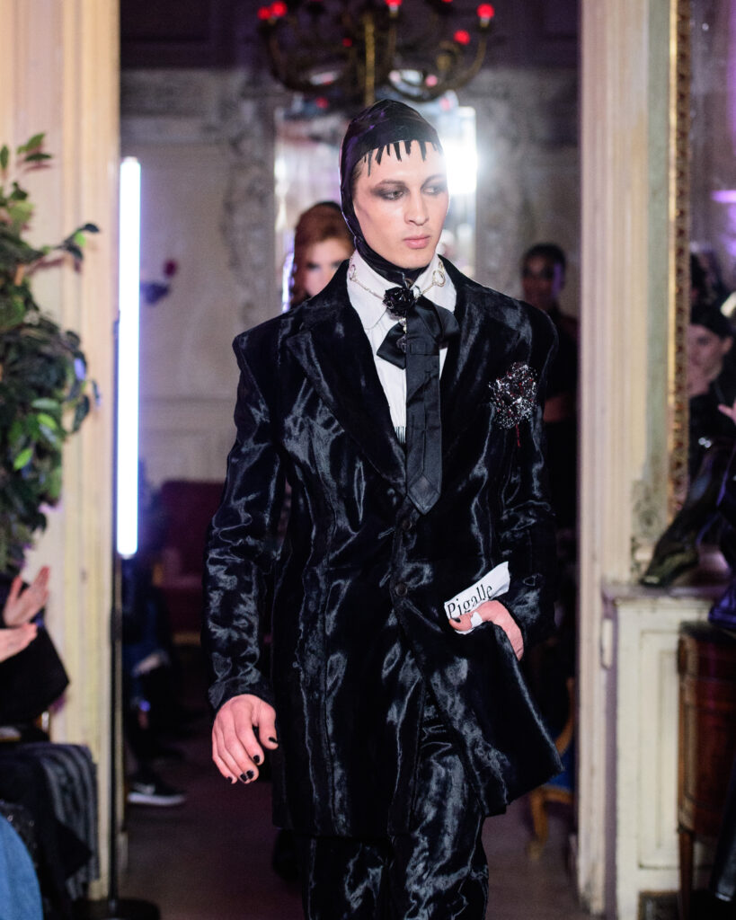 La collection unisexe se compose de l’allure victorienne aux cols montants et manches gigots donnant un port de cou flamboyant, avec des pièces plus rock telles que les mini-jupes. Pressiat propose des hauts dos-nus twistés tel un foulard, des longues robes du soir imprimé panthère en velours dévorée, des corsets, des hauts drapés et noués autour du cou, ainsi que des micro robes en cuir. Les accessoires incluent des foulards noués autour de la tête se transformant en nœud lavallière, des cagoules en maille et des structures de tête démesurément Pressiat artisanales en vinyle et en tulle, symbolisant le choc des élites, des débutantes dans leurs rallies et des demi-mondaines de la nuit.
