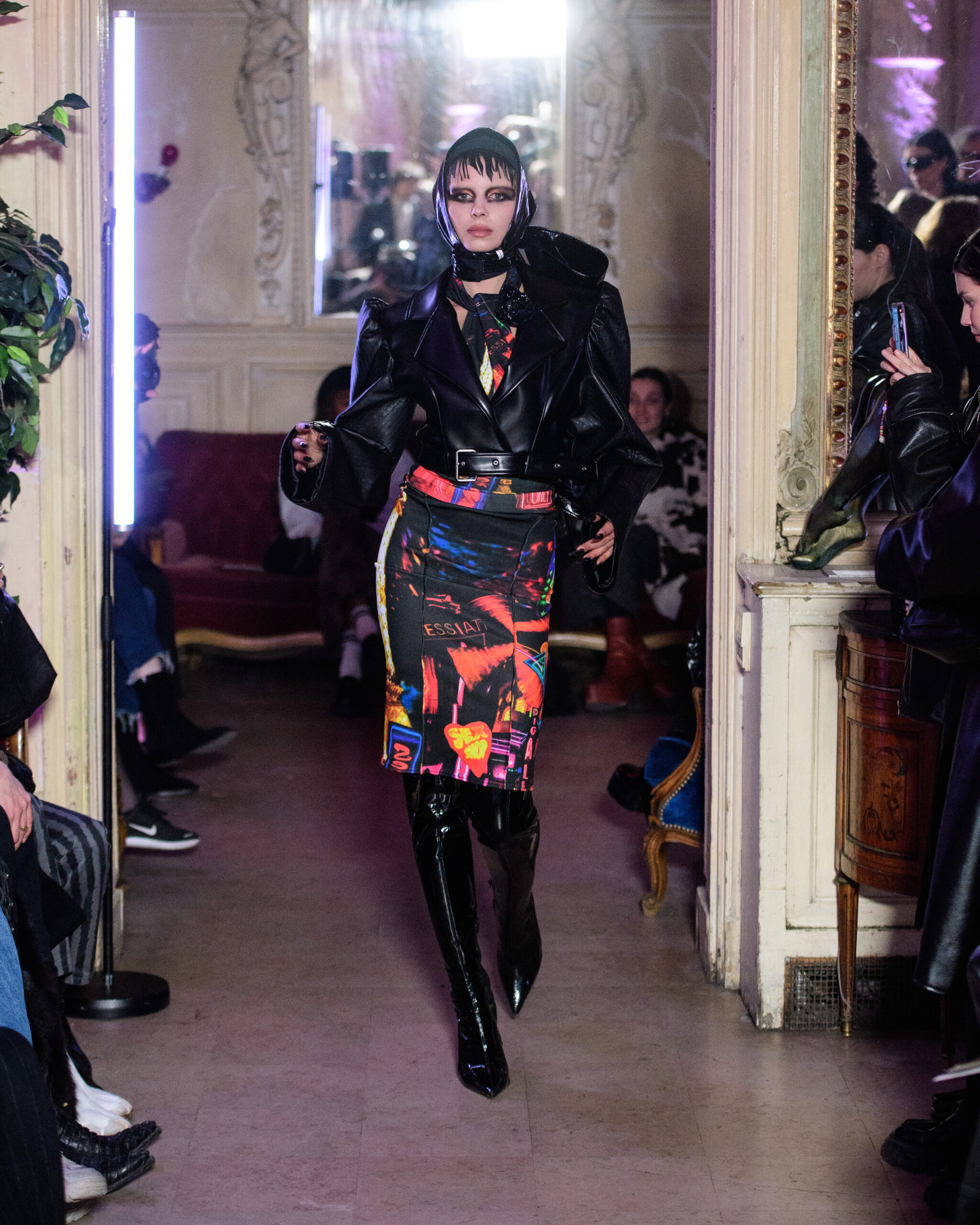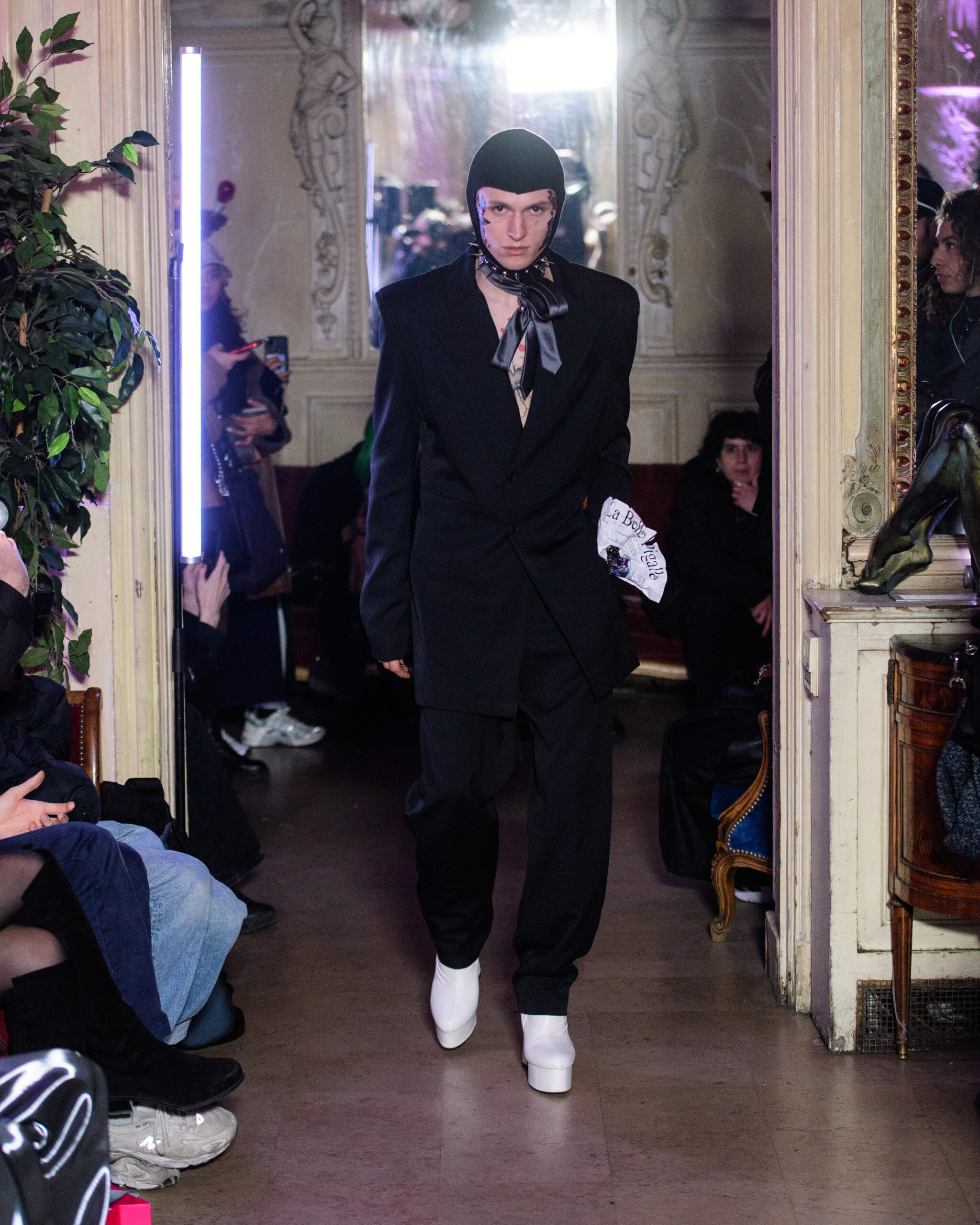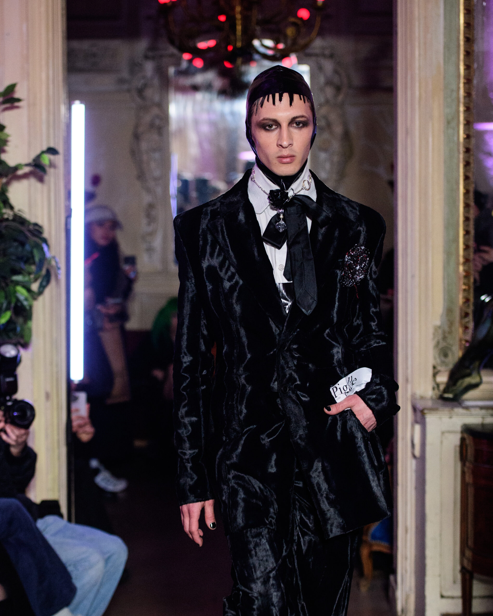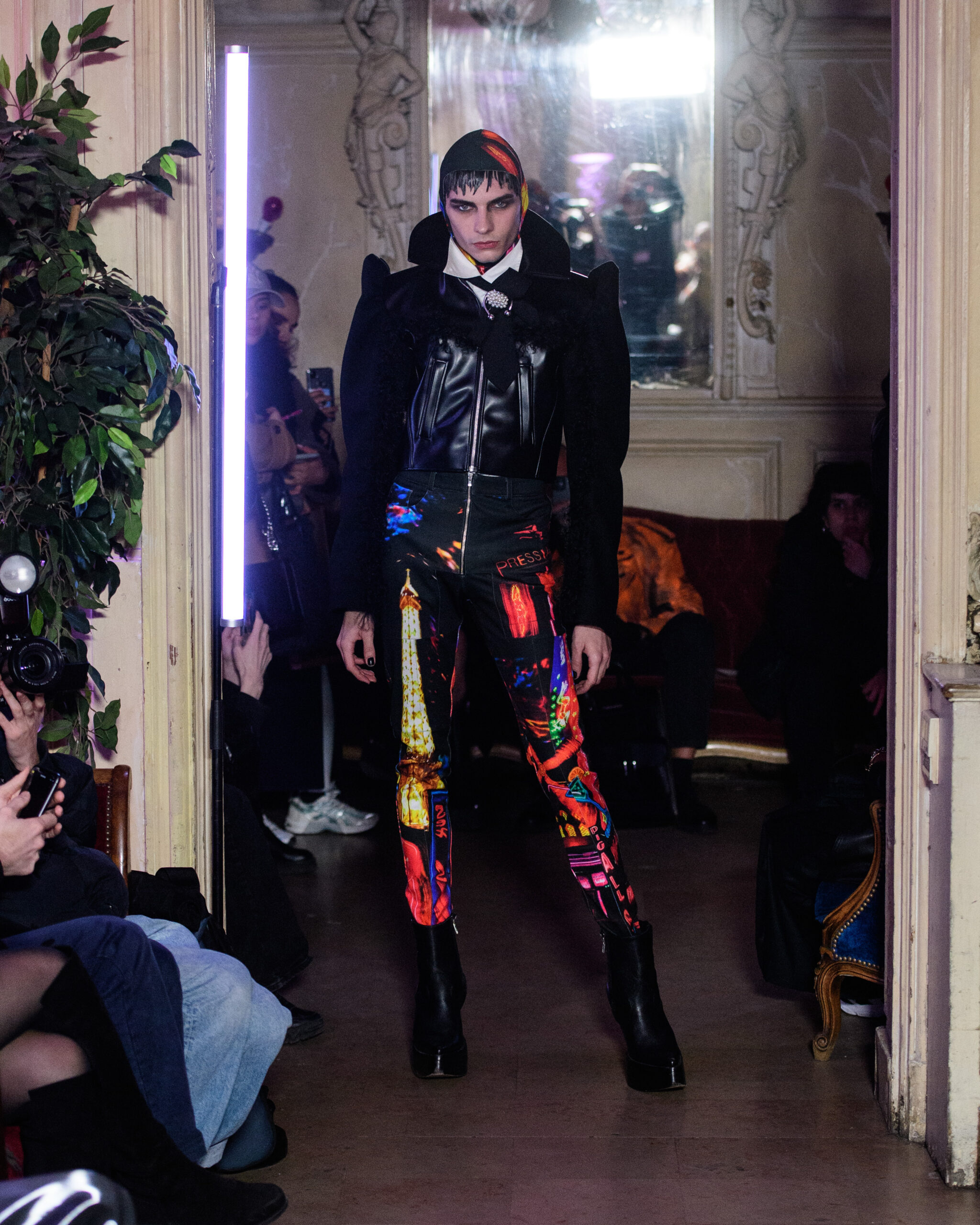 La collection unisexe se compose de l’allure victorienne aux cols montants et manches gigots donnant un port de cou flamboyant, avec des pièces plus rock telles que les mini-jupes. Pressiat propose des hauts dos-nus twistés tel un foulard, des longues robes du soir imprimé panthère en velours dévorée, des corsets, des hauts drapés et noués autour du cou, ainsi que des micro robes en cuir. Les accessoires incluent des foulards noués autour de la tête se transformant en nœud lavallière, des cagoules en maille et des structures de tête démesurément Pressiat artisanales en vinyle et en tulle, symbolisant le choc des élites, des débutantes dans leurs rallies et des demi-mondaines de la nuit.