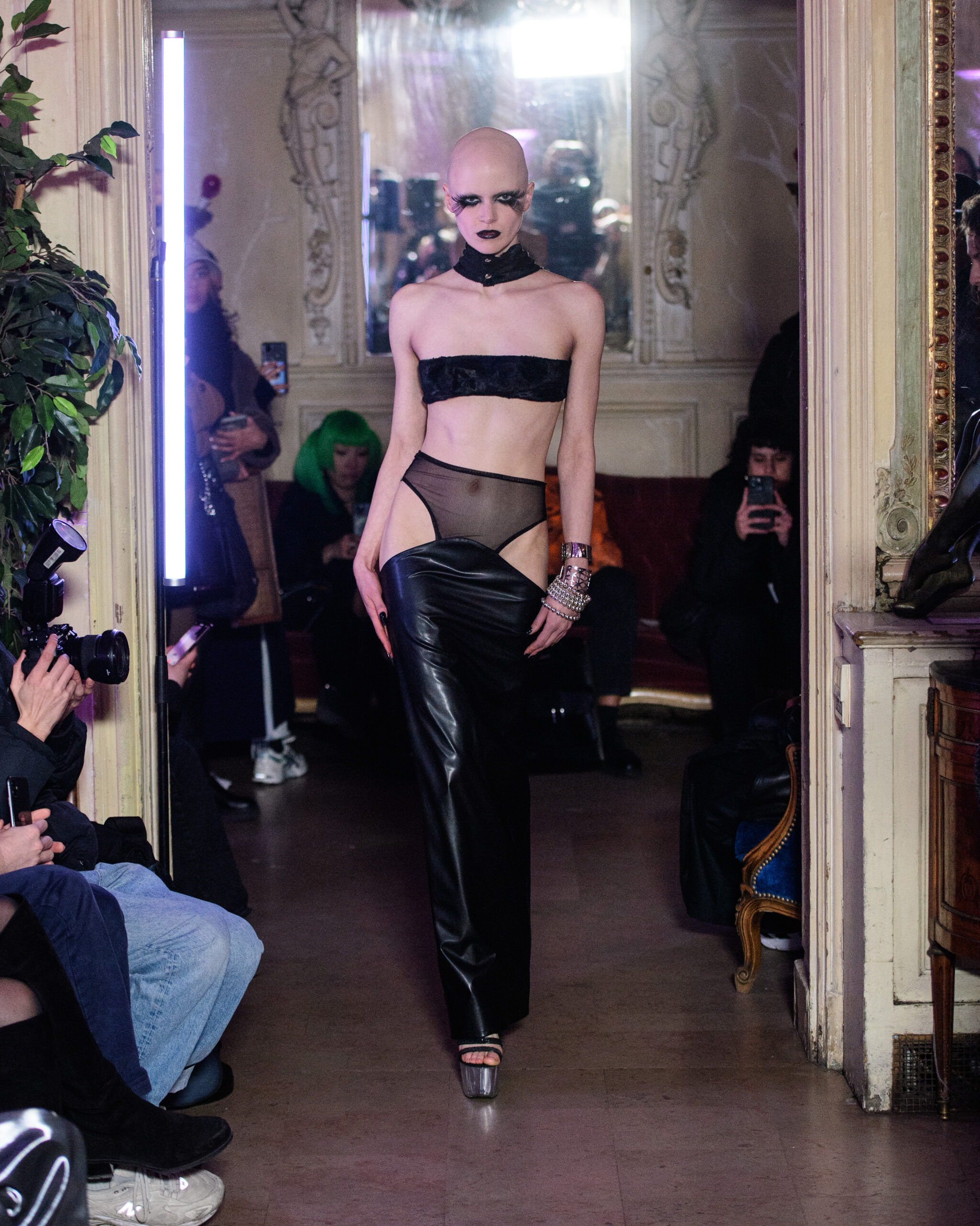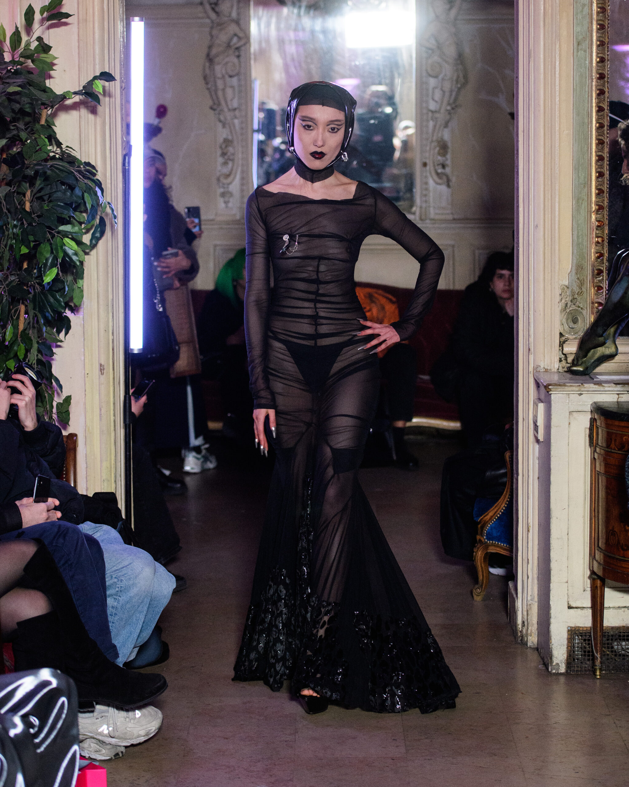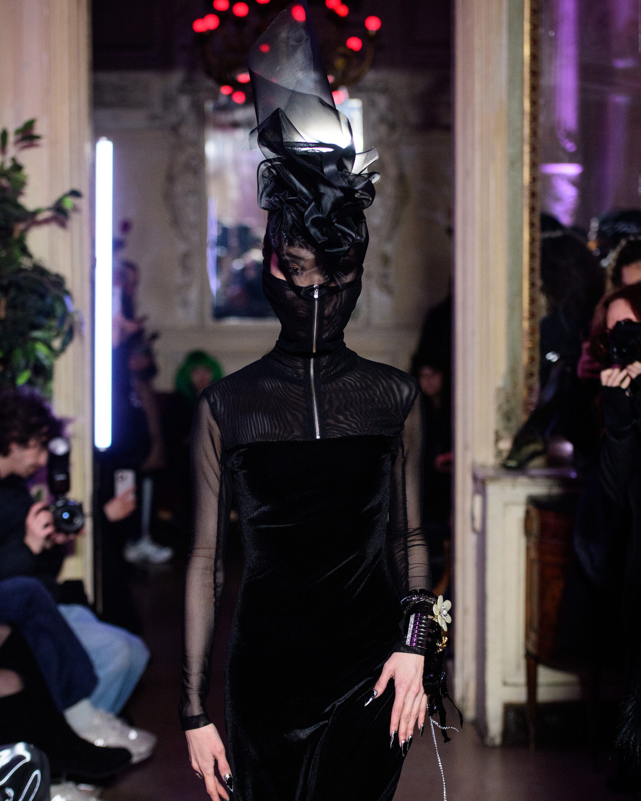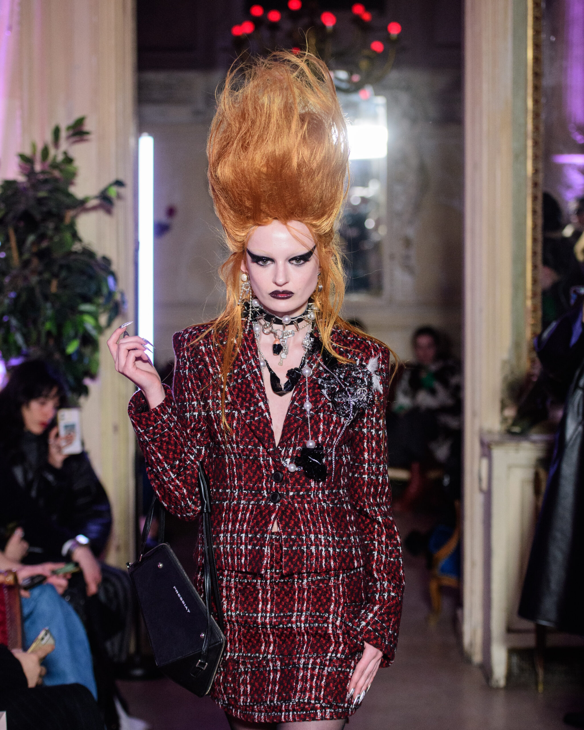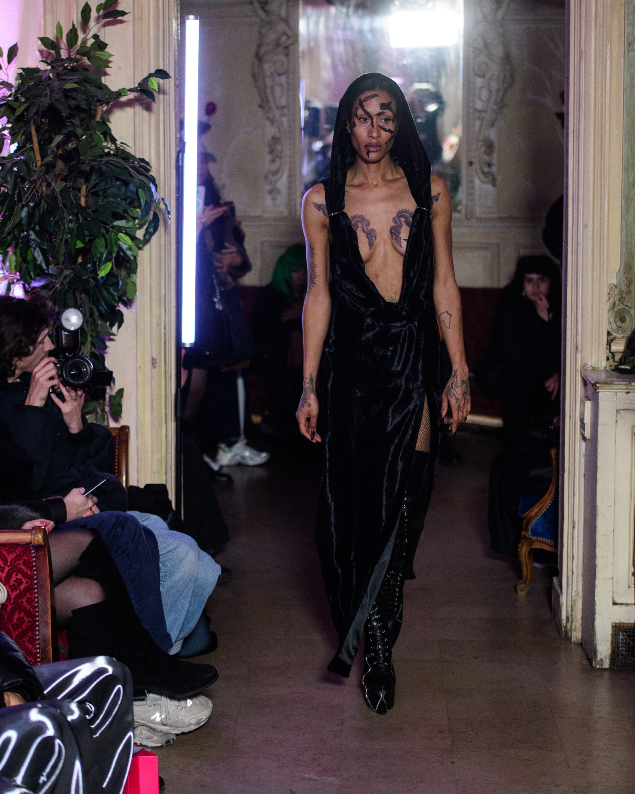 La collection unisexe se compose de l’allure victorienne aux cols montants et manches gigots donnant un port de cou flamboyant, avec des pièces plus rock telles que les mini-jupes. Pressiat propose des hauts dos-nus twistés tel un foulard, des longues robes du soir imprimé panthère en velours dévorée, des corsets, des hauts drapés et noués autour du cou, ainsi que des micro robes en cuir. Les accessoires incluent des foulards noués autour de la tête se transformant en nœud lavallière, des cagoules en maille et des structures de tête démesurément Pressiat artisanales en vinyle et en tulle, symbolisant le choc des élites, des débutantes dans leurs rallies et des demi-mondaines de la nuit.