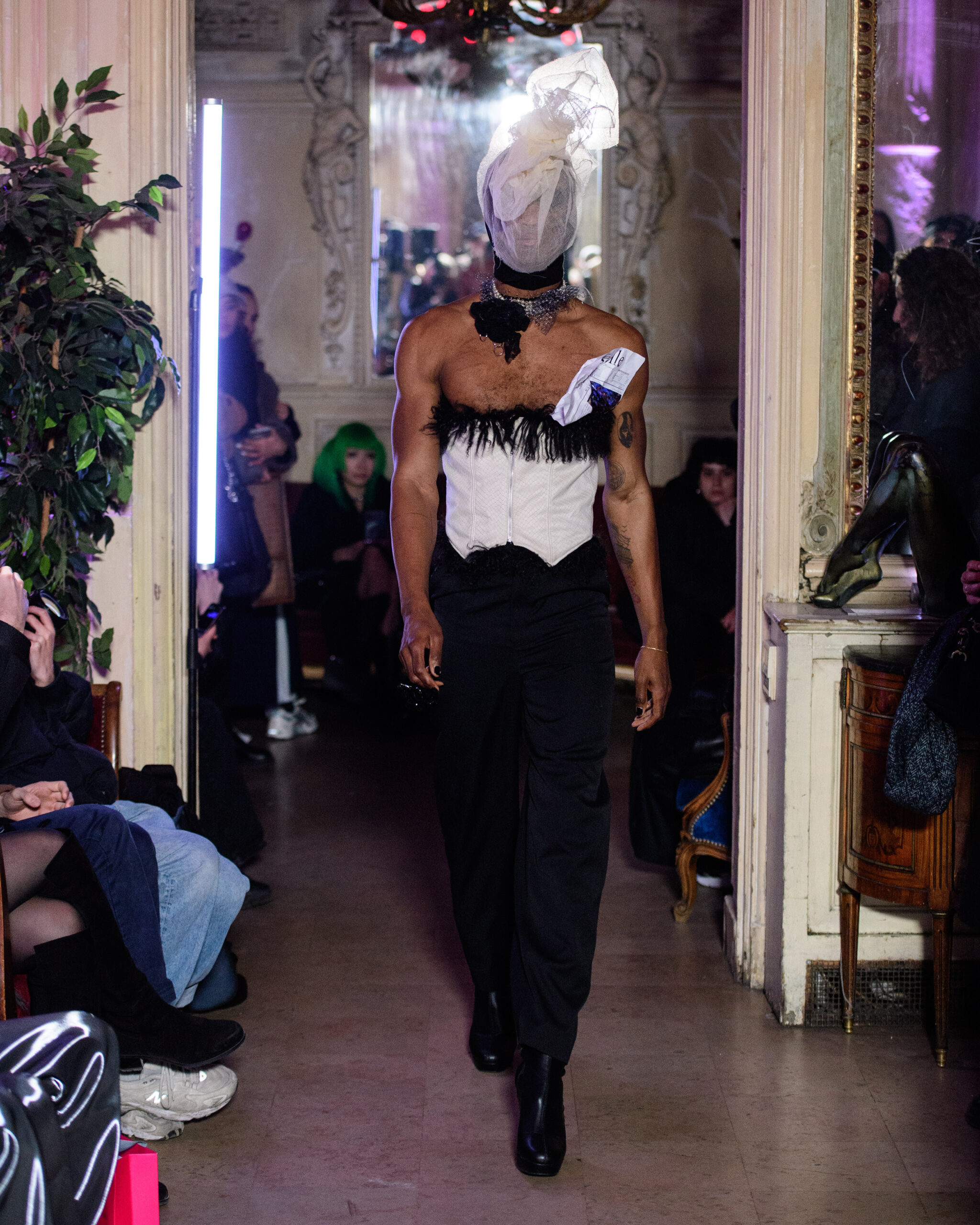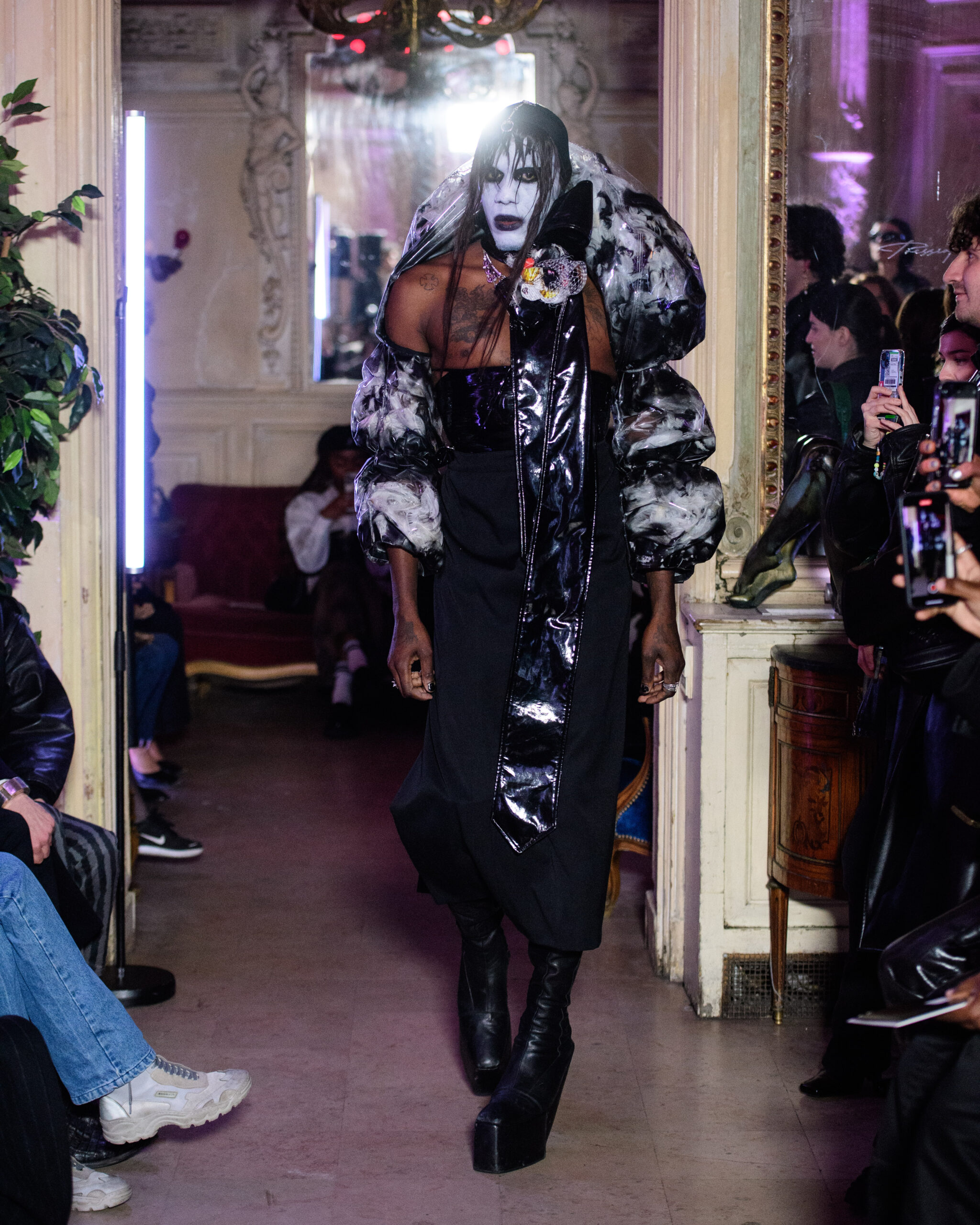 Les pièces Couture de la collection permettent d’expérimenter les idées et la créativité. Inspiré par l’étrangeté d’avoir des mouettes à Paris, Pressiat a créé une doudoune avec des manches en PVC recyclé rempli de plumes noires et blanches. De loin, cela ressemble à un imprimé Dalmatien, mais de près, les plumes font référence à la pollution des océans causée par les pétroliers et la mise en danger des oiseaux. La collection est accessoirisée avec élégance par des foulards noués autour de la tête se transformant en nœud lavallière, symboles de glamour, de pouvoir et d’indépendance.
