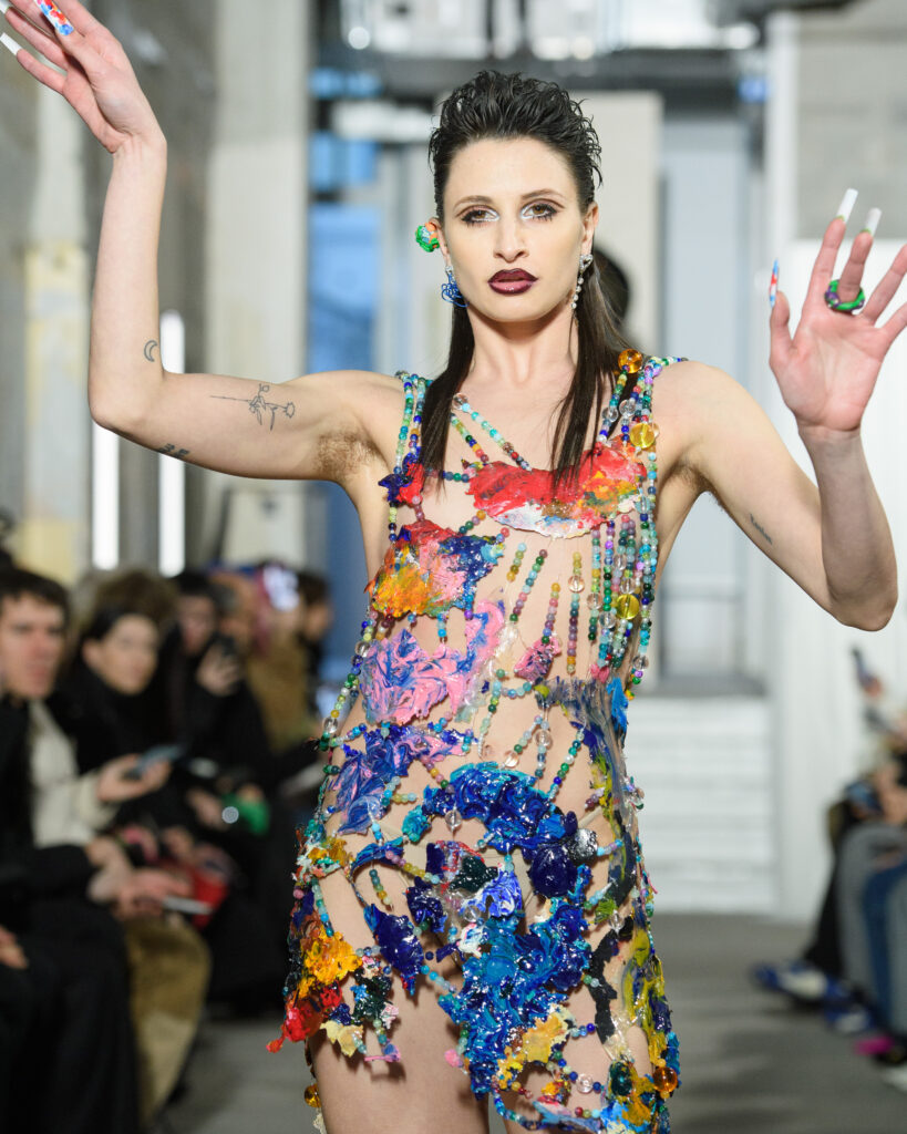 Plaçant toujours une grande importance sur le travail collaboratif avec son entourage, Weinsanto invite cette saison son ami de longue date, l’artiste Romain Eugene Campens, à créer un imprimé. Une peinture abstraite multicolore d’expressionnisme abstrait, représentant l’accumulation des choses dans une vie, est utilisée pour les pièces les plus simples jusqu’à la couture hautement élaborée. Une pièce de couture a été créée en utilisant une technique où l’artiste a épluché les premières couches de ses nombreuses palettes de peinture, et chacune de ces couches a été utilisée comme des fragments constituant une robe, puis en ajoutant de la peinture fraîche pour la texture.