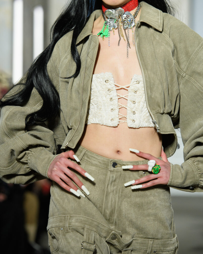 Une trouvaille textile inhabituelle a été un appliqué de fil beige mince et spaghetti-like qui a été utilisé pour une mini-jupe, une robe et un haut. L’aspect vintage de ce matériau donne aux pièces une allure rétro.