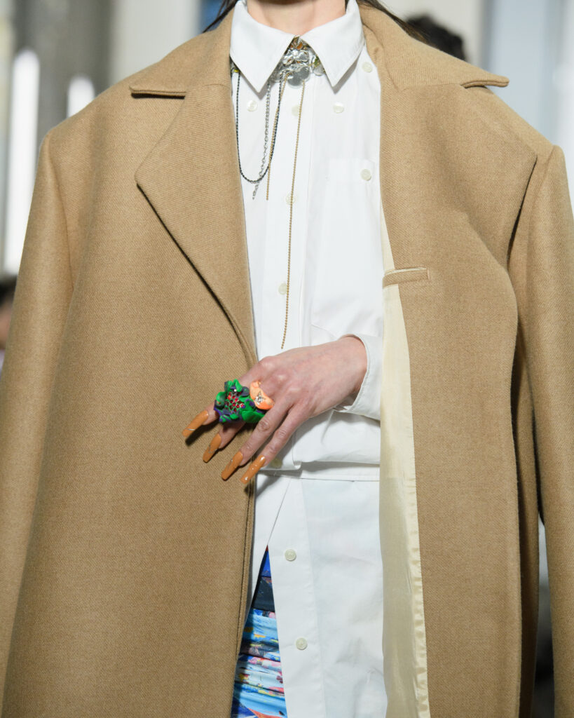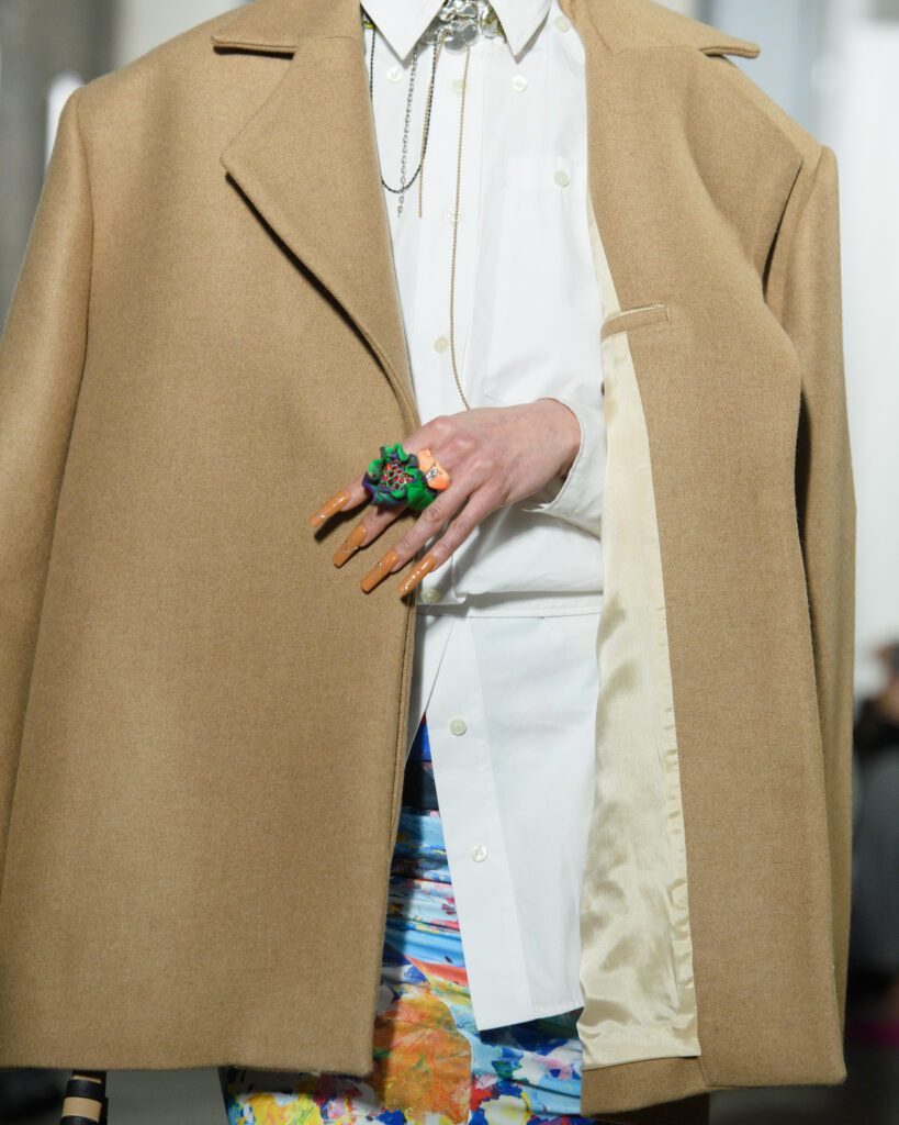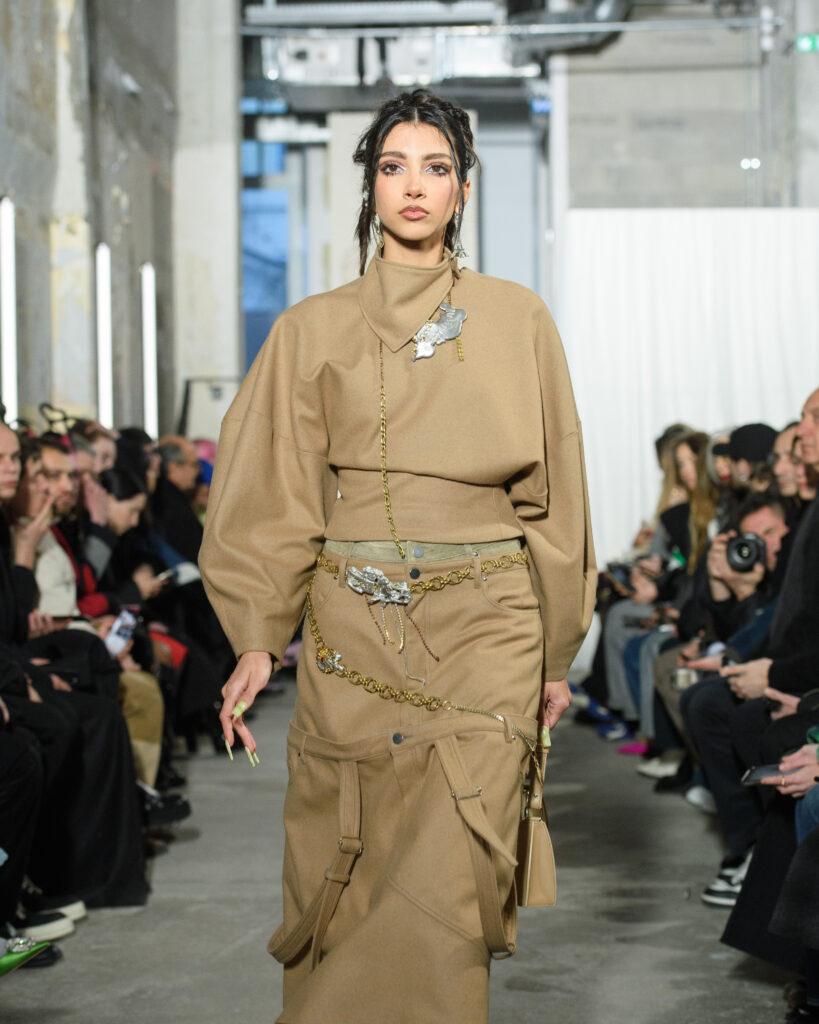 Avec une approche toujours consciente de l’environnement, Weinsanto continue de se procurer des stocks morts avec NONA Source de LVMH, dont il est un ambassadeur. Un mélange de laine de chameau est utilisé pour les tenues monochromes, du coton pour les chemises et les T-shirts, et du nylon pour une sensation de vêtements de sport avec des vestes matelassées et des pantalons de ski chics.