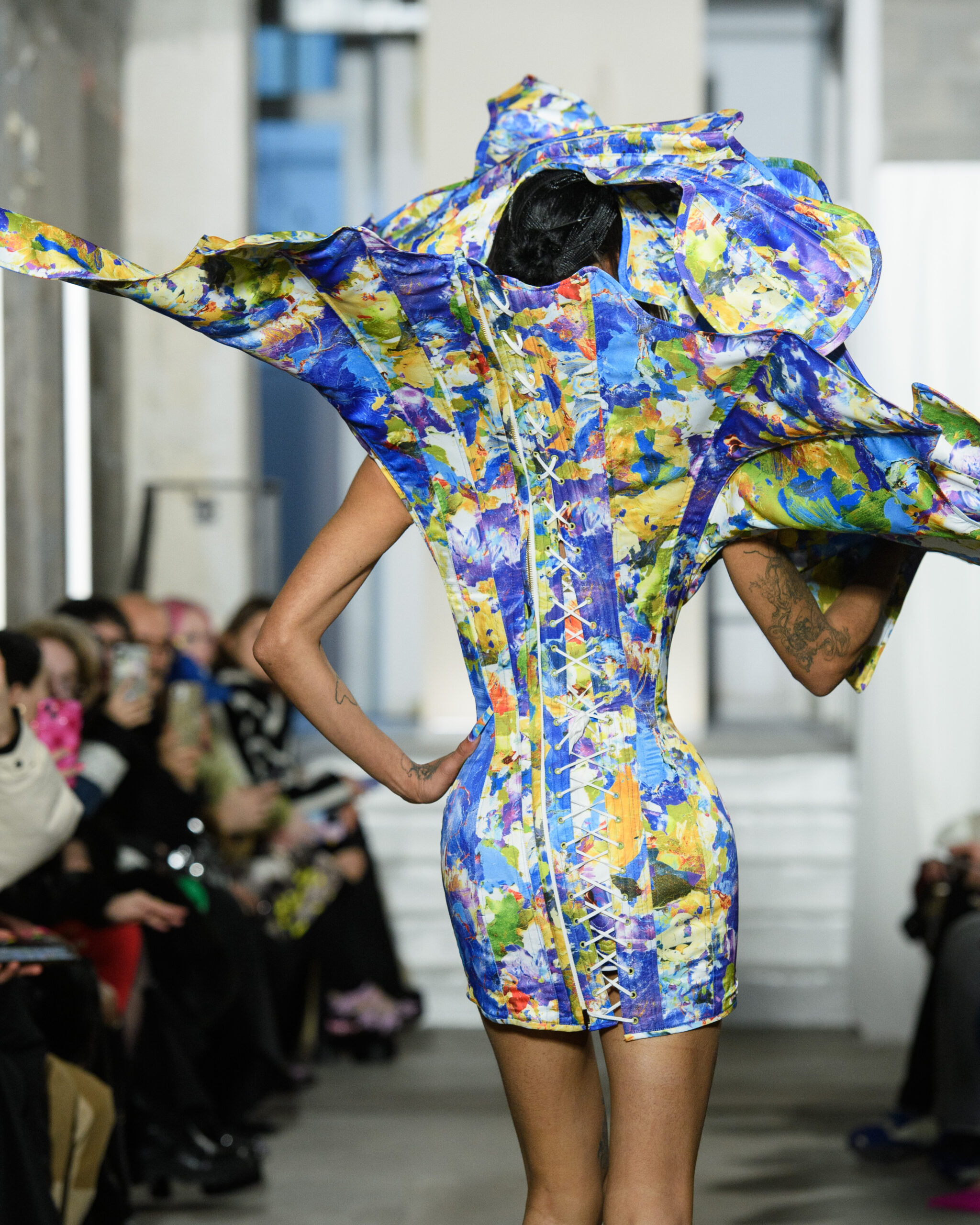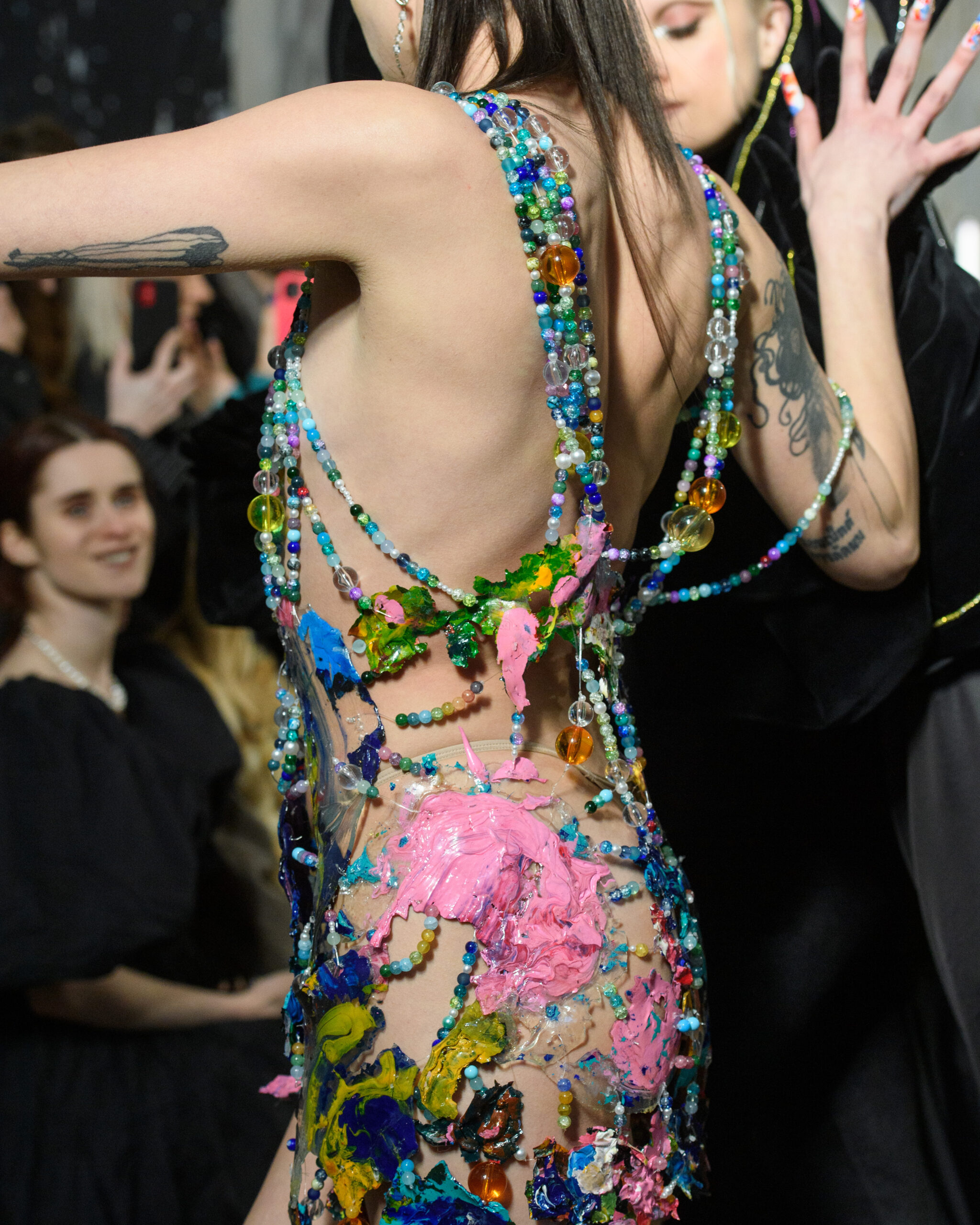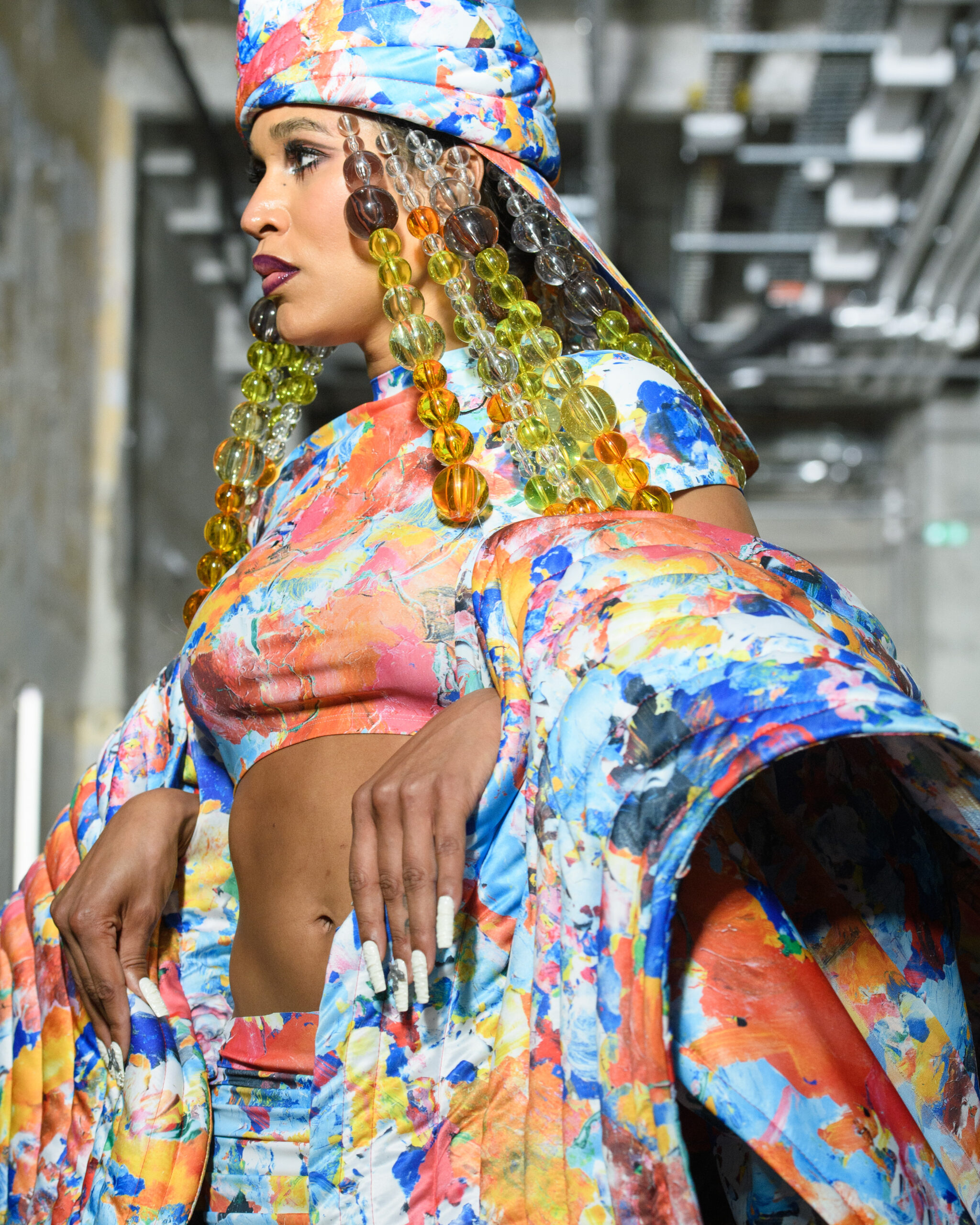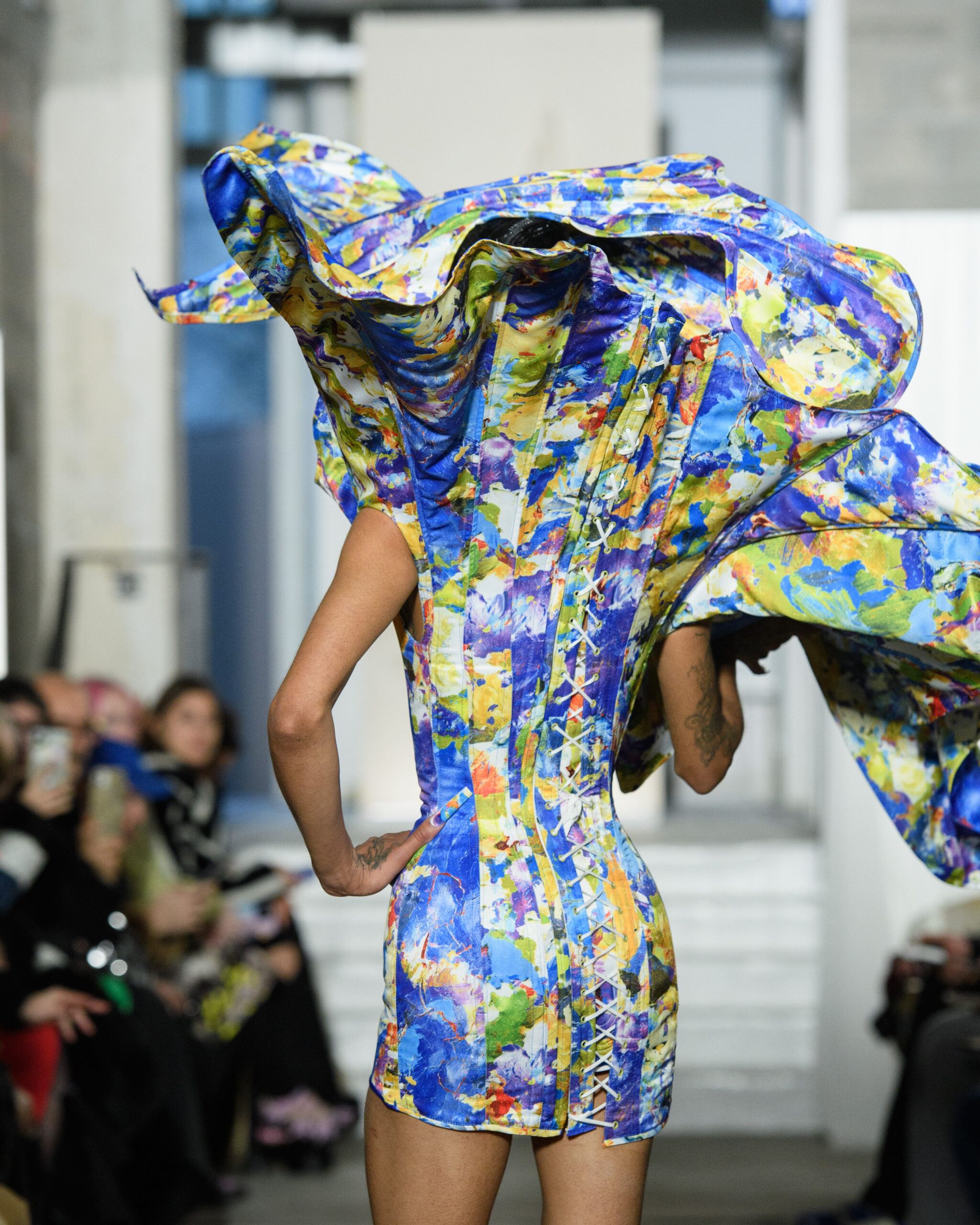 Plaçant toujours une grande importance sur le travail collaboratif avec son entourage, Weinsanto invite cette saison son ami de longue date, l’artiste Romain Eugene Campens, à créer un imprimé. Une peinture abstraite multicolore d’expressionnisme abstrait, représentant l’accumulation des choses dans une vie, est utilisée pour les pièces les plus simples jusqu’à la couture hautement élaborée. Une pièce de couture a été créée en utilisant une technique où l’artiste a épluché les premières couches de ses nombreuses palettes de peinture, et chacune de ces couches a été utilisée comme des fragments constituant une robe, puis en ajoutant de la peinture fraîche pour la texture.