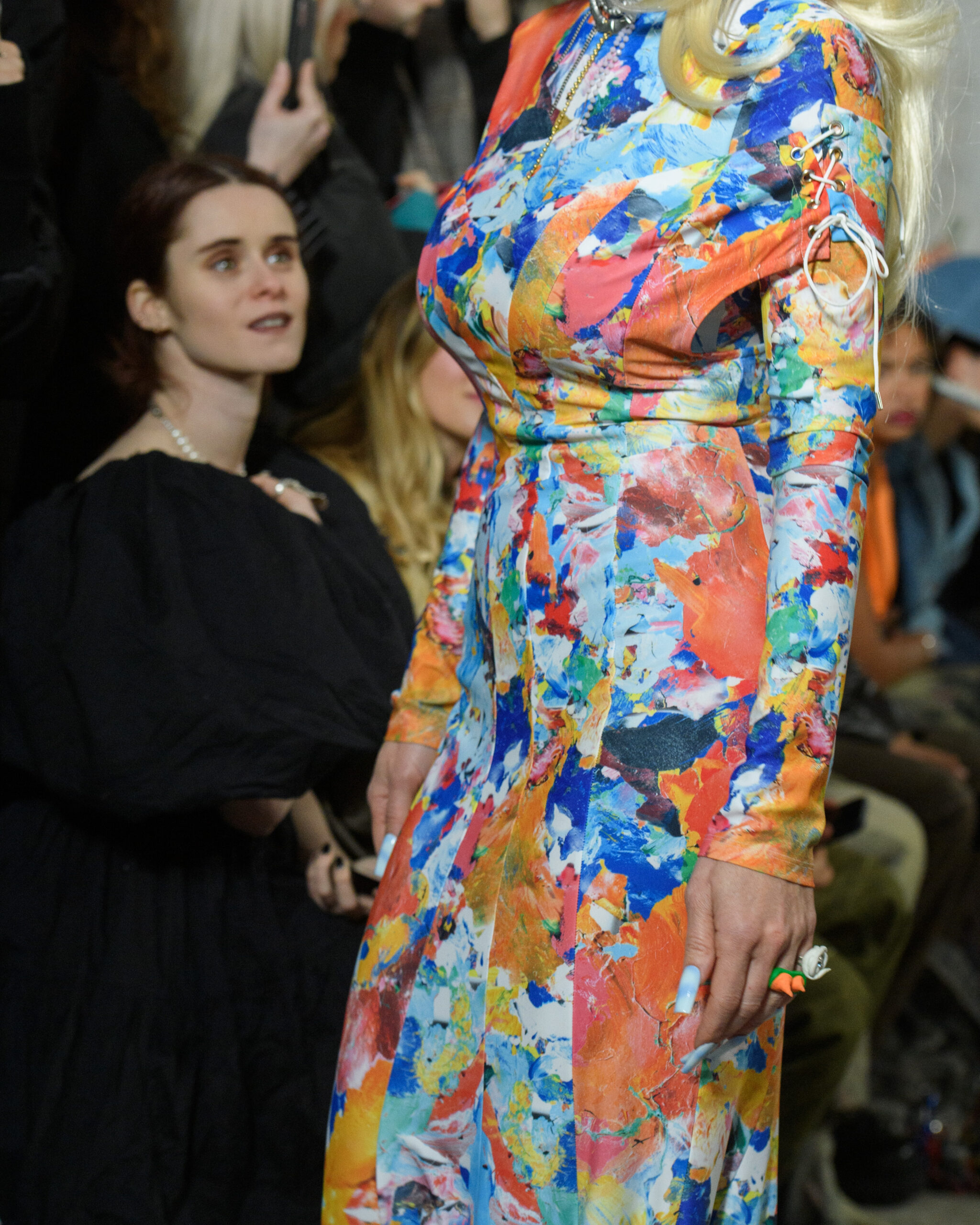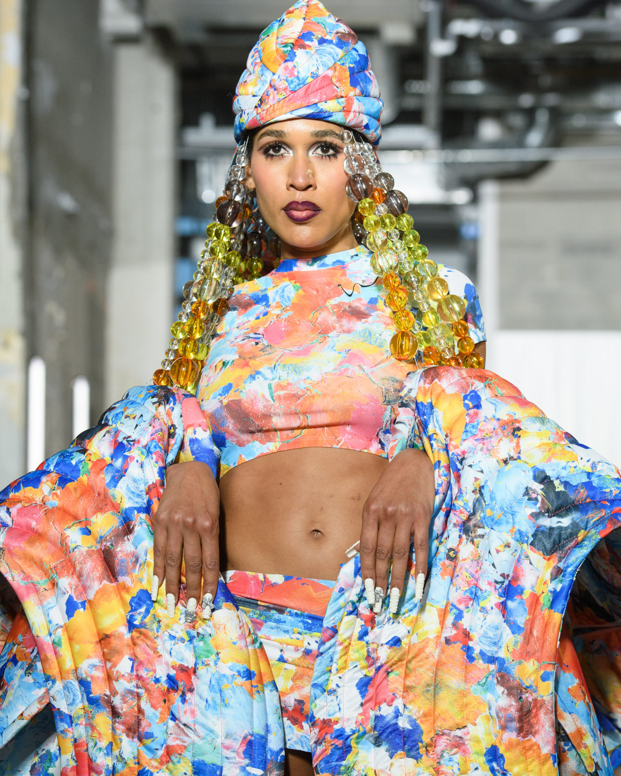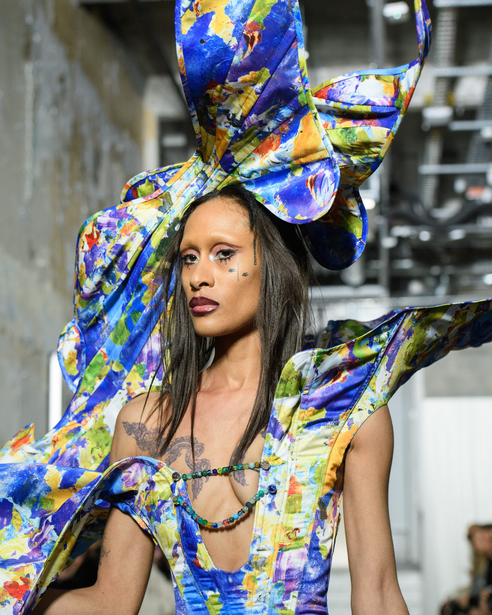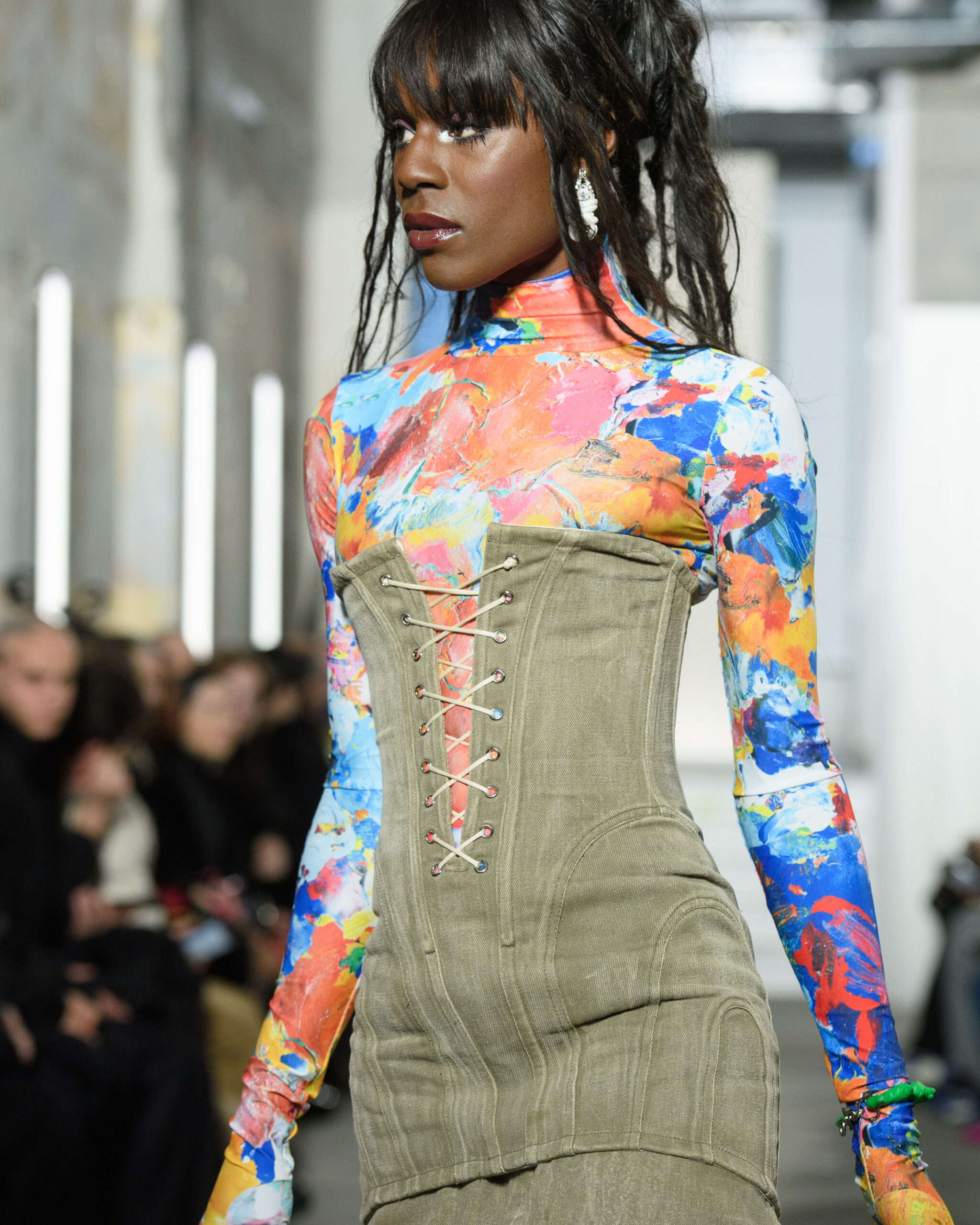 Plaçant toujours une grande importance sur le travail collaboratif avec son entourage, Weinsanto invite cette saison son ami de longue date, l’artiste Romain Eugene Campens, à créer un imprimé. Une peinture abstraite multicolore d’expressionnisme abstrait, représentant l’accumulation des choses dans une vie, est utilisée pour les pièces les plus simples jusqu’à la couture hautement élaborée. Une pièce de couture a été créée en utilisant une technique où l’artiste a épluché les premières couches de ses nombreuses palettes de peinture, et chacune de ces couches a été utilisée comme des fragments constituant une robe, puis en ajoutant de la peinture fraîche pour la texture.