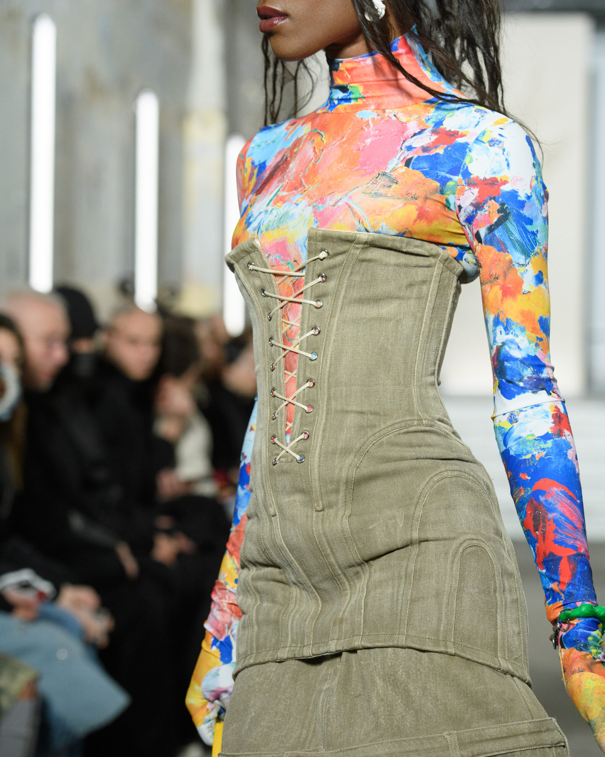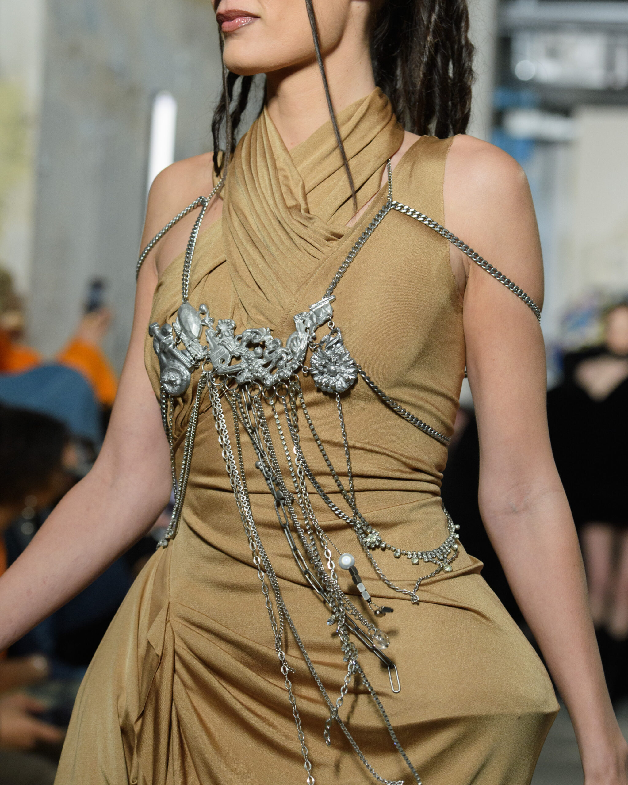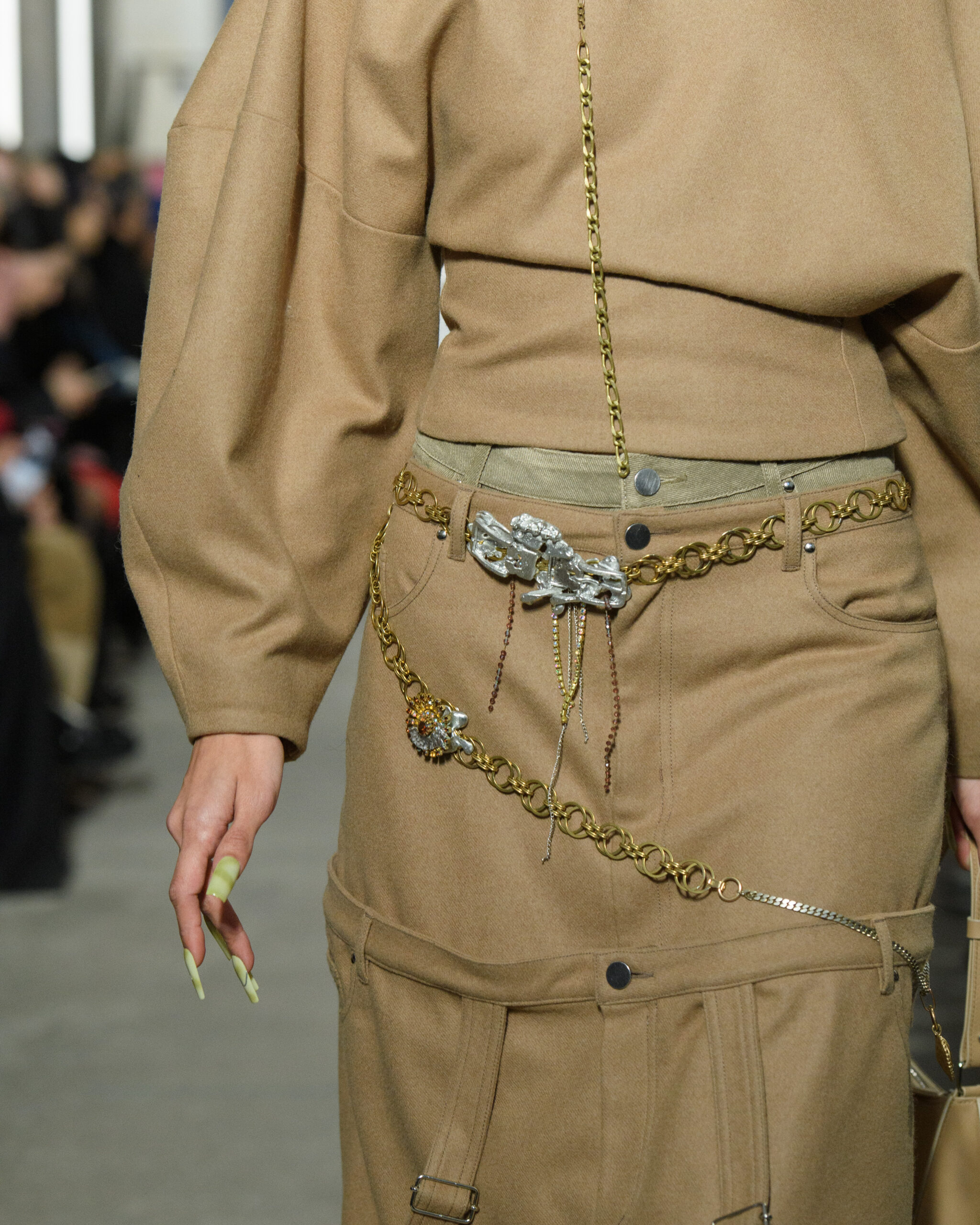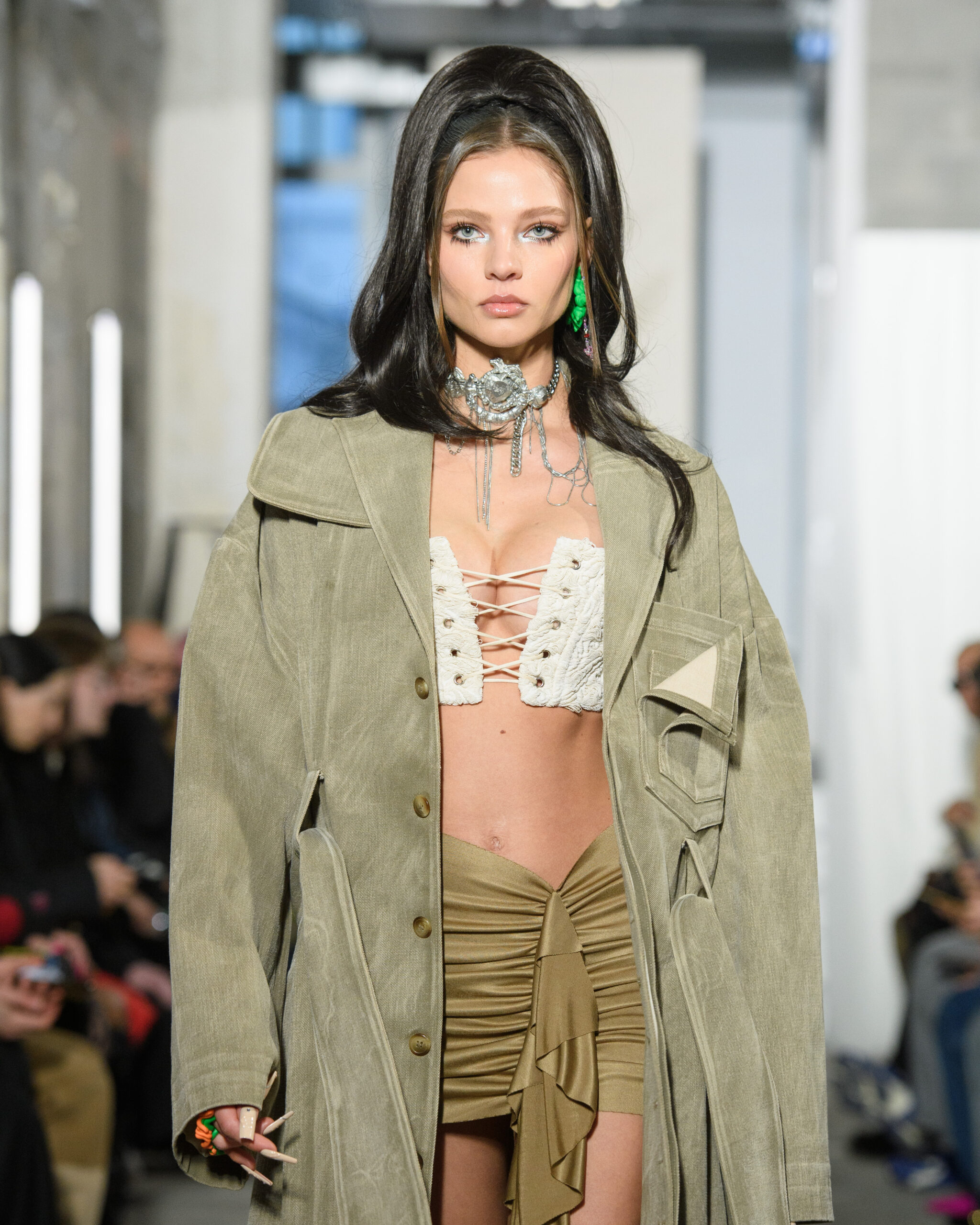 Une trouvaille textile inhabituelle a été un appliqué de fil beige mince et spaghetti-like qui a été utilisé pour une mini-jupe, une robe et un haut. L’aspect vintage de ce matériau donne aux pièces une allure rétro.
