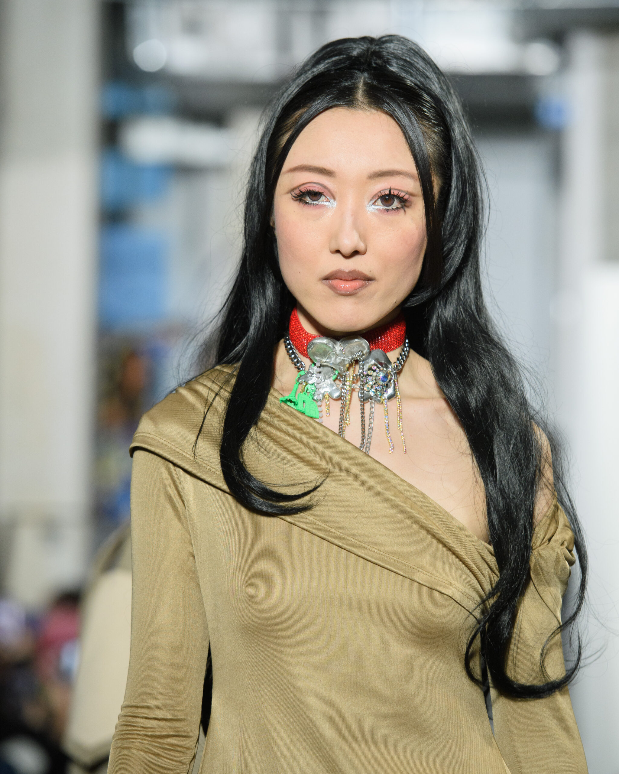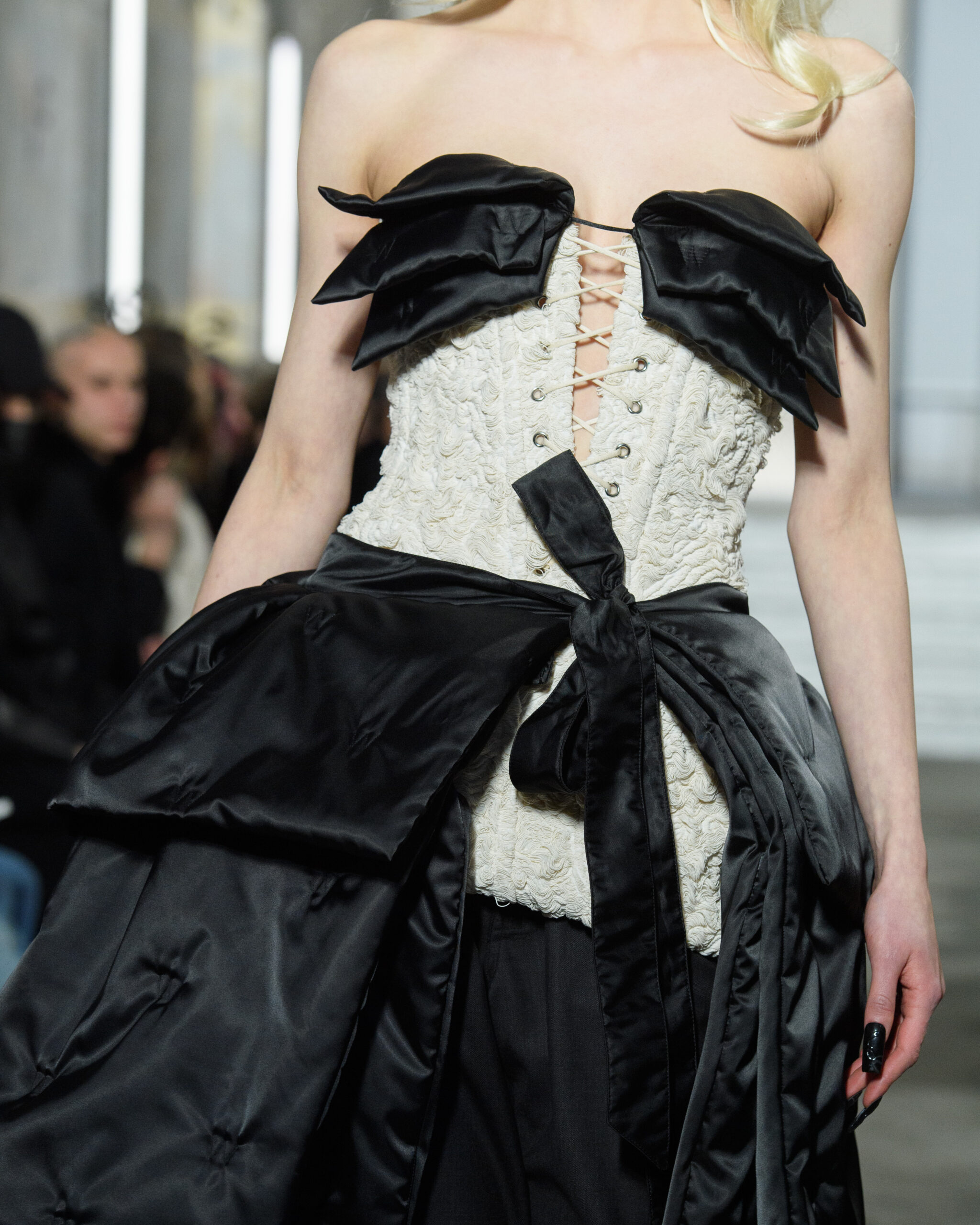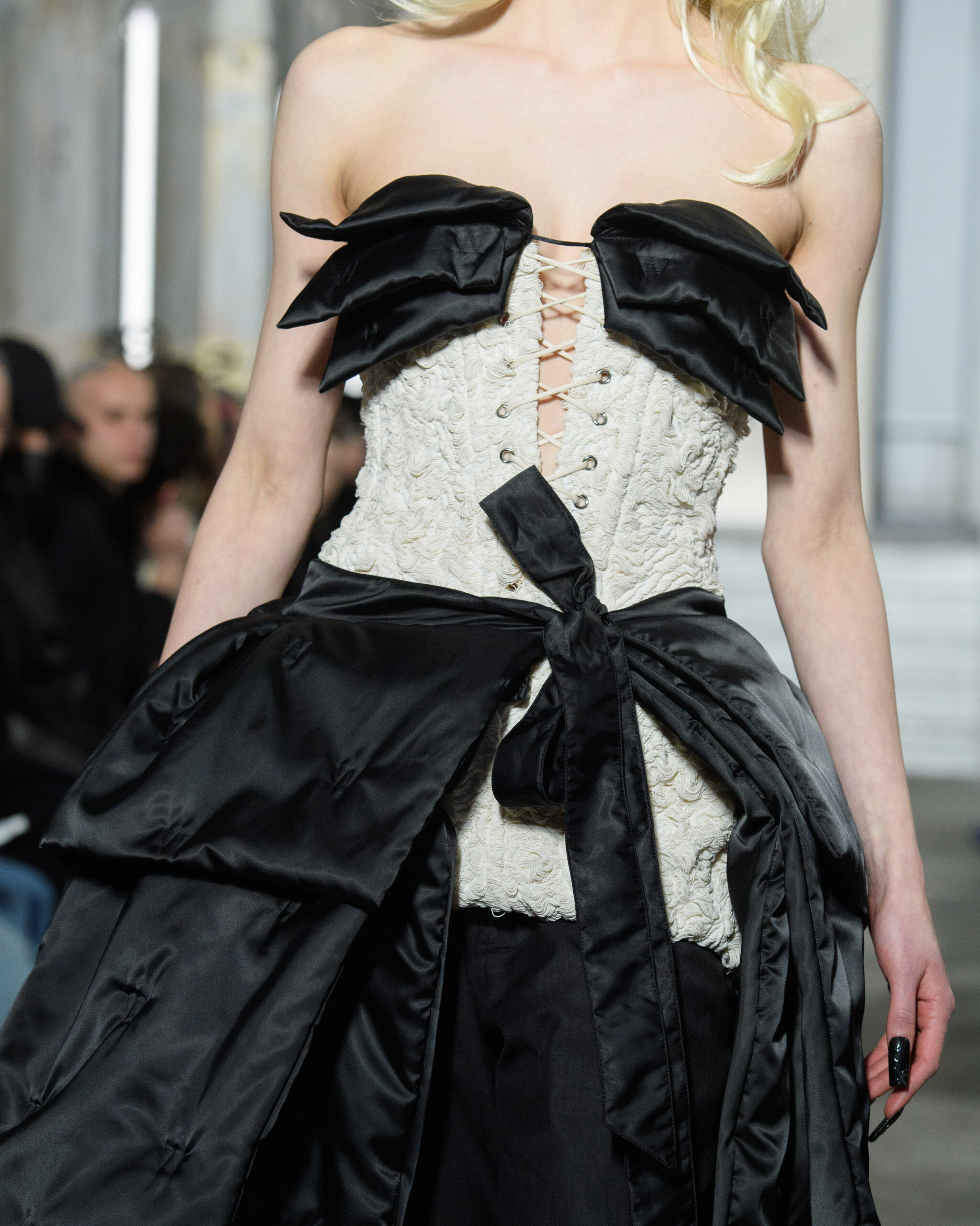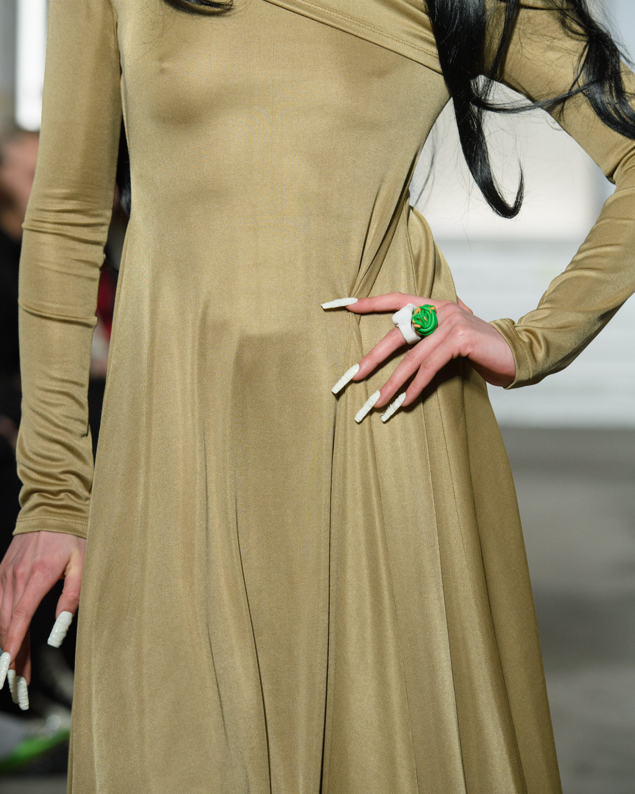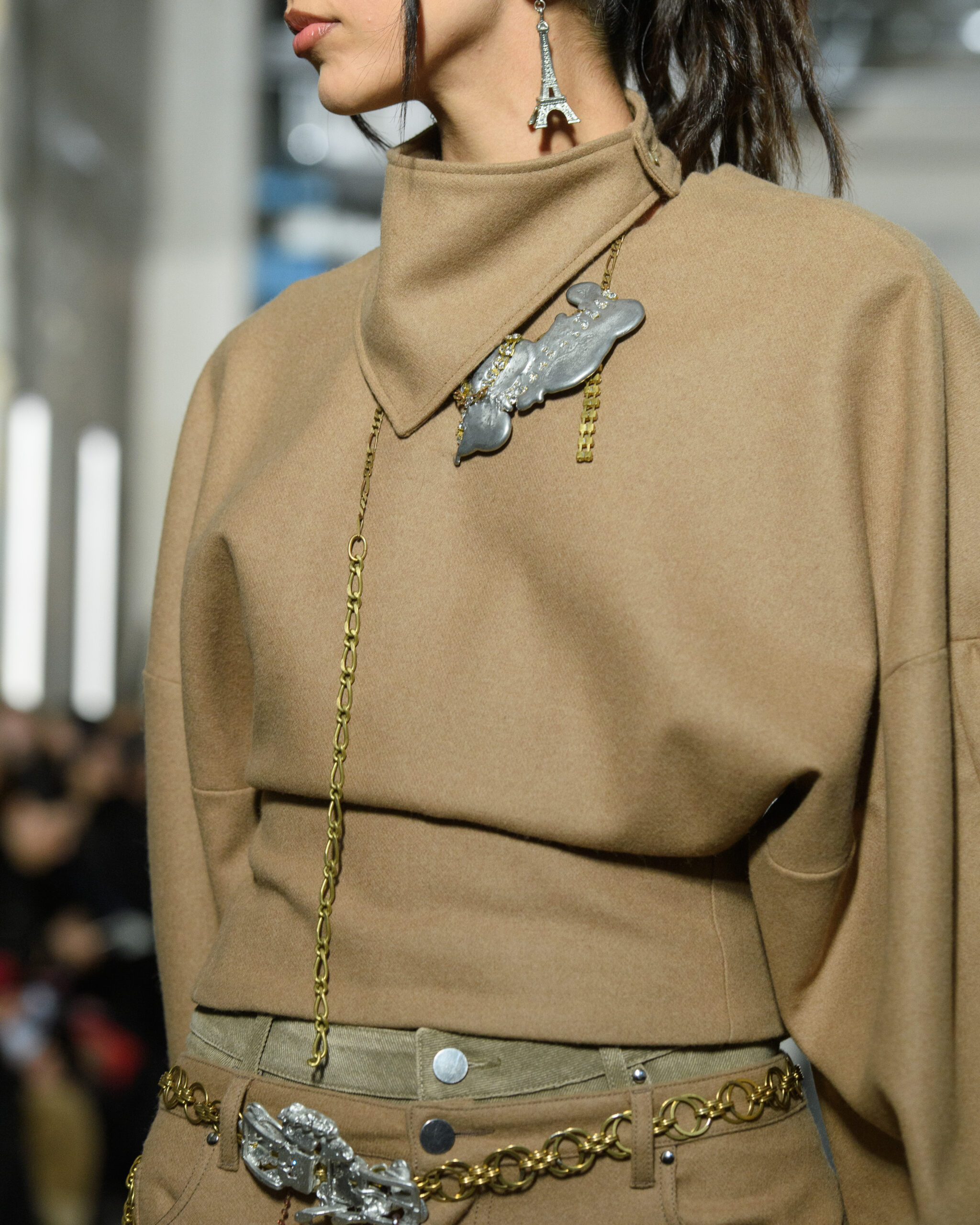 Une trouvaille textile inhabituelle a été un appliqué de fil beige mince et spaghetti-like qui a été utilisé pour une mini-jupe, une robe et un haut. L’aspect vintage de ce matériau donne aux pièces une allure rétro.
