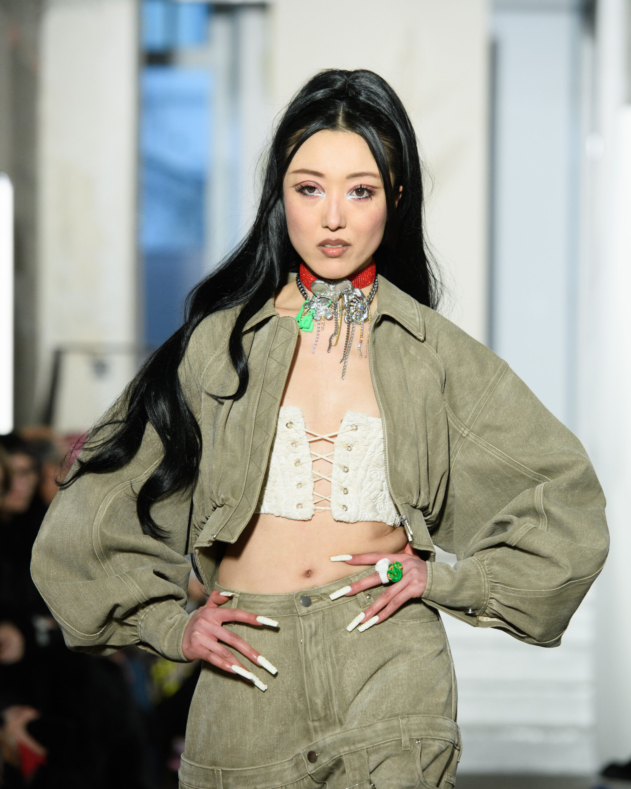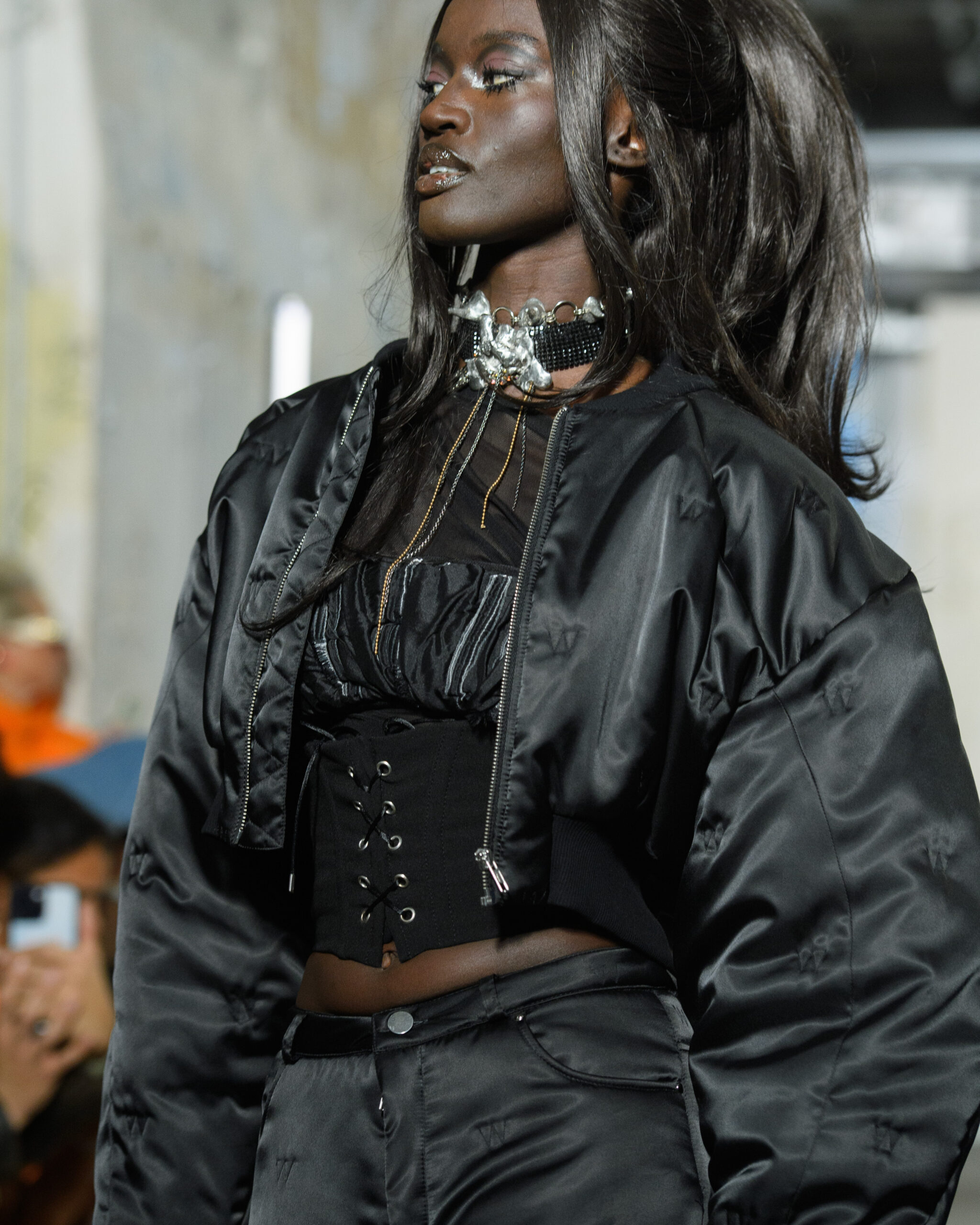 Le denim de cette saison, un élément de base de Weinsanto, est lavé en stonewash kaki. Les hauts incluent des chemises oversize, des tops brassière associés à des pièces boyish surdimensionnées comme un pantalon ample et des corsets bodycon, des « Baby Tops », des t-shirts mi-ventre avec le nouvel emblème W en swoosh et des sweats en jersey.