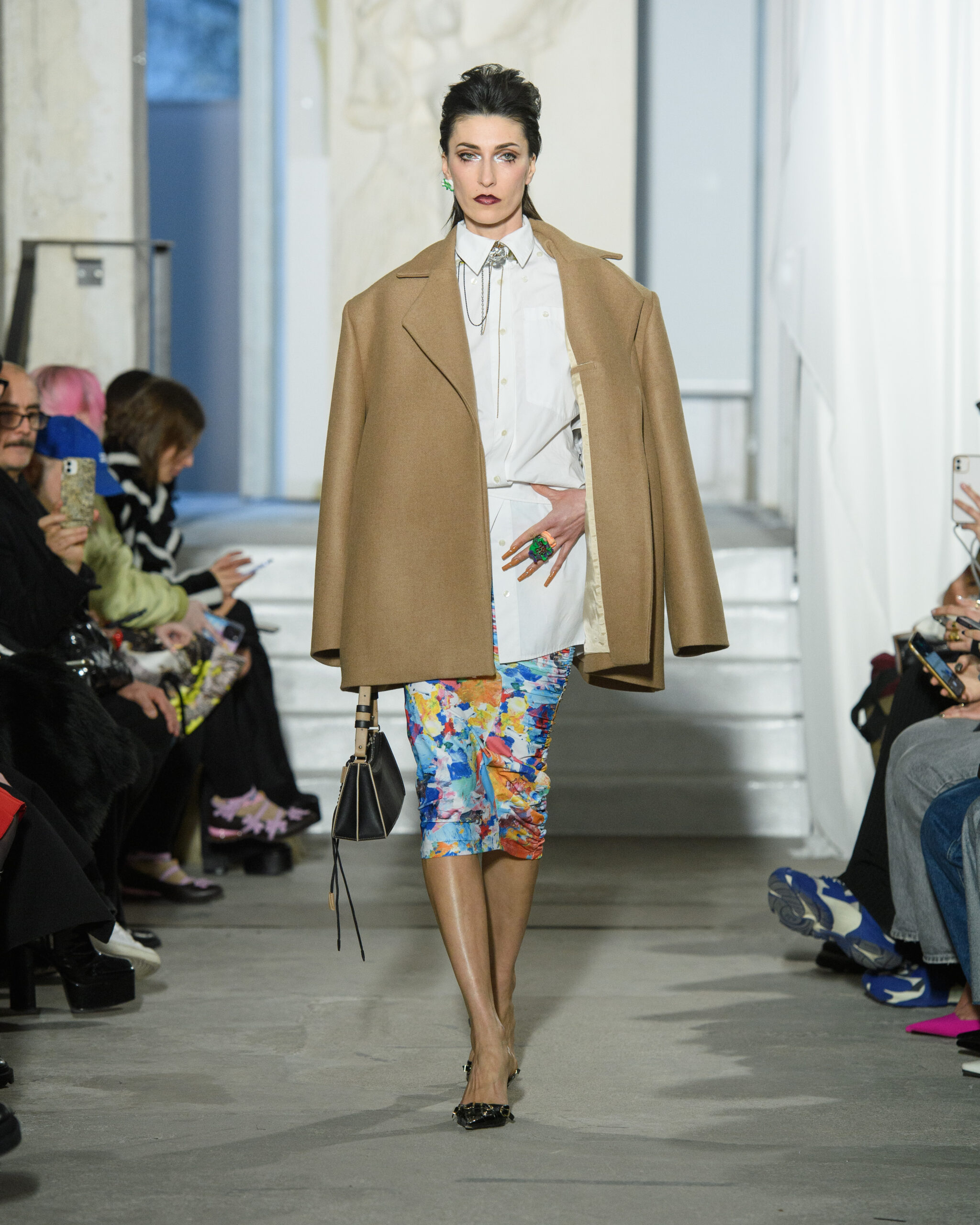 Toujours conscient de l’environnement, Weinsanto continue de sourcer les stocks morts avec la source NONA de LVMH, dont il est ambassadeur. Un mélange de laine de chameau est utilisé pour les tenues monochromes, le coton pour les chemises et les t-shirts, et le nylon pour un look sportswear/activewear avec des vestes matelassées et des pantalons de ski chics.