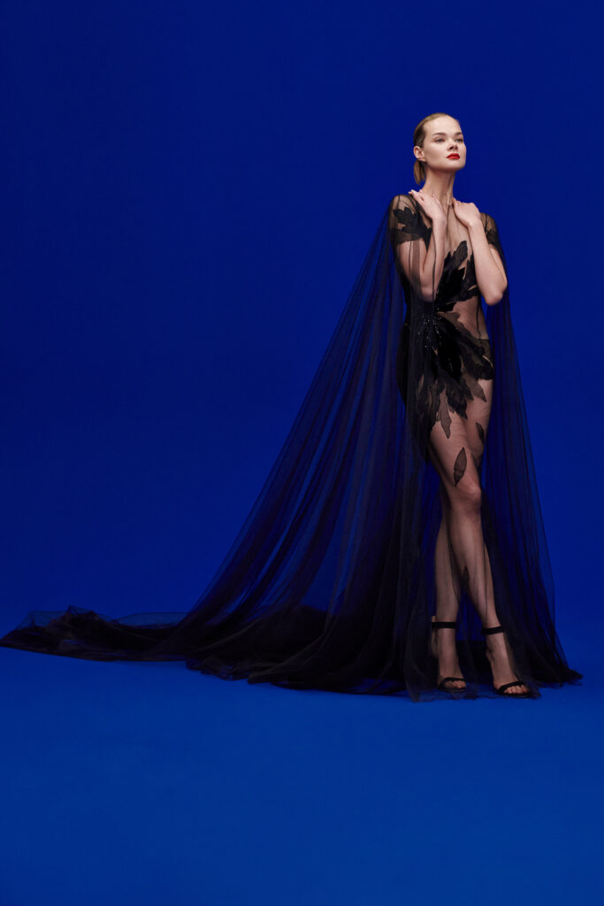 Les tissus et les décorations pour YANINA Couture Printemps/Été 2023 comprennent des satins brillants, des velours de soie luxueux, des crêpes doubles aristocratiques, des voiles et des chiffons légers avec des broderies à la main, des paillettes scintillantes et des brillants.