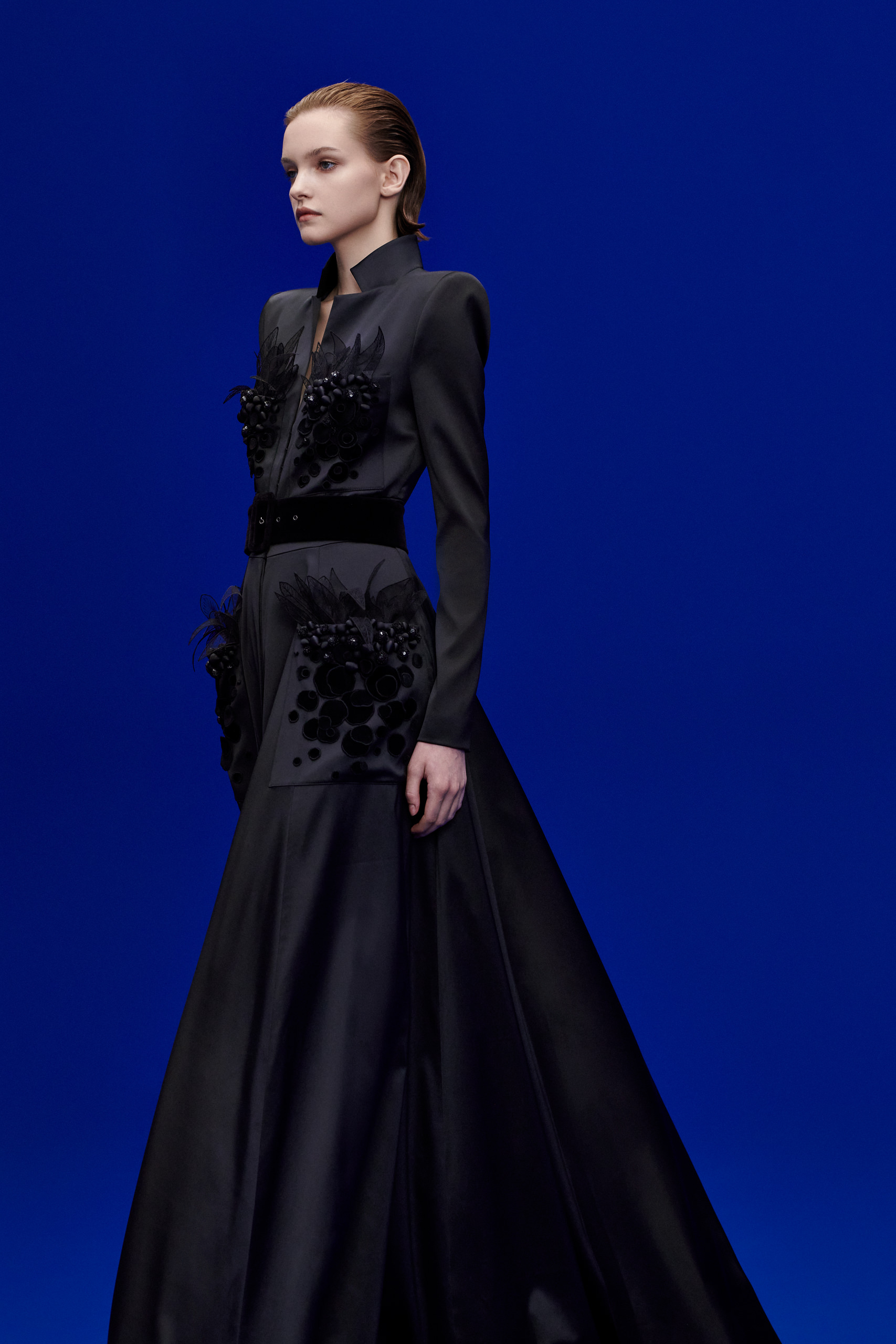 Les tissus et les décorations pour YANINA Couture Printemps/Été 2023 comprennent des satins brillants, des velours de soie luxueux, des crêpes doubles aristocratiques, des voiles et des chiffons légers avec des broderies à la main, des paillettes scintillantes et des brillants.