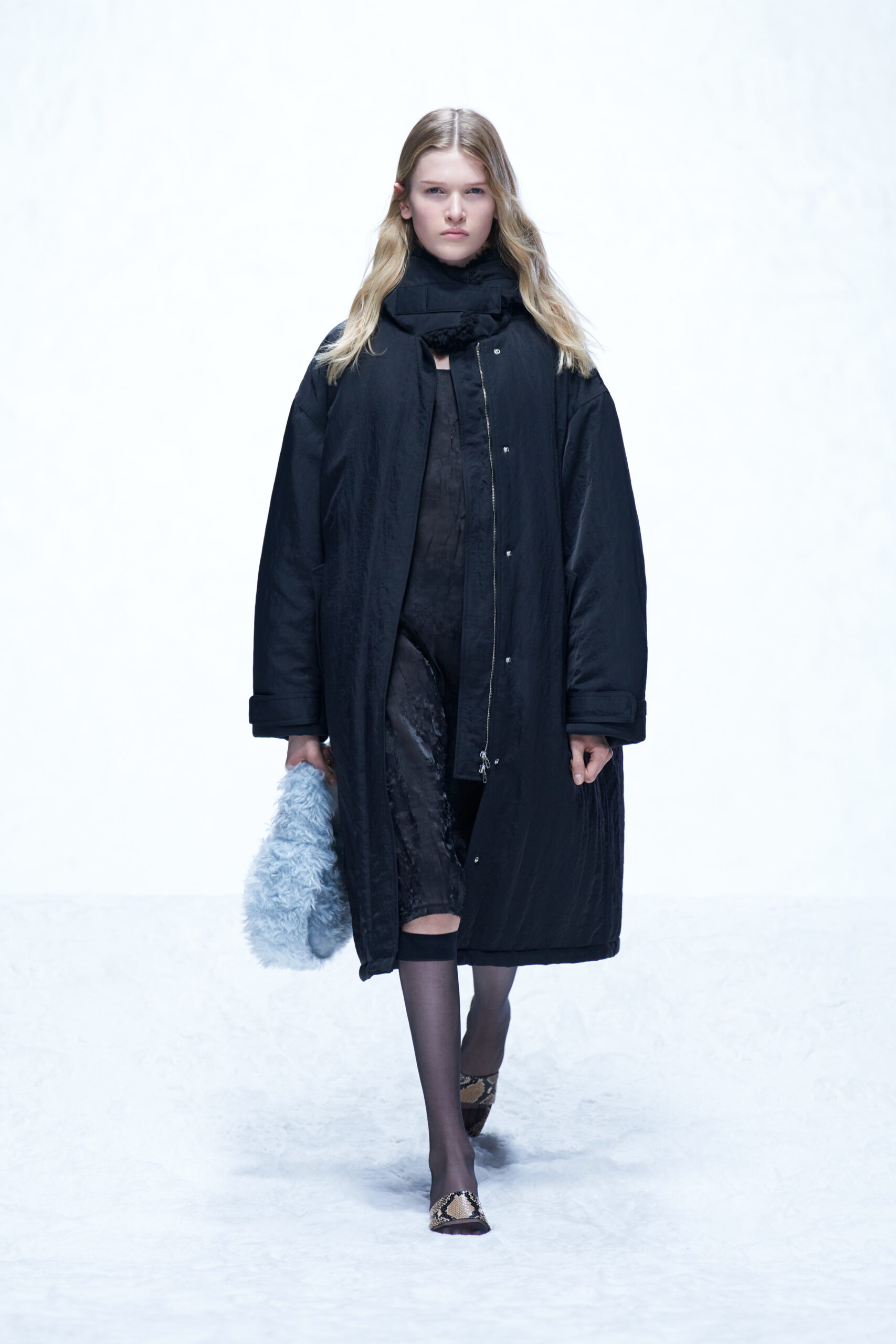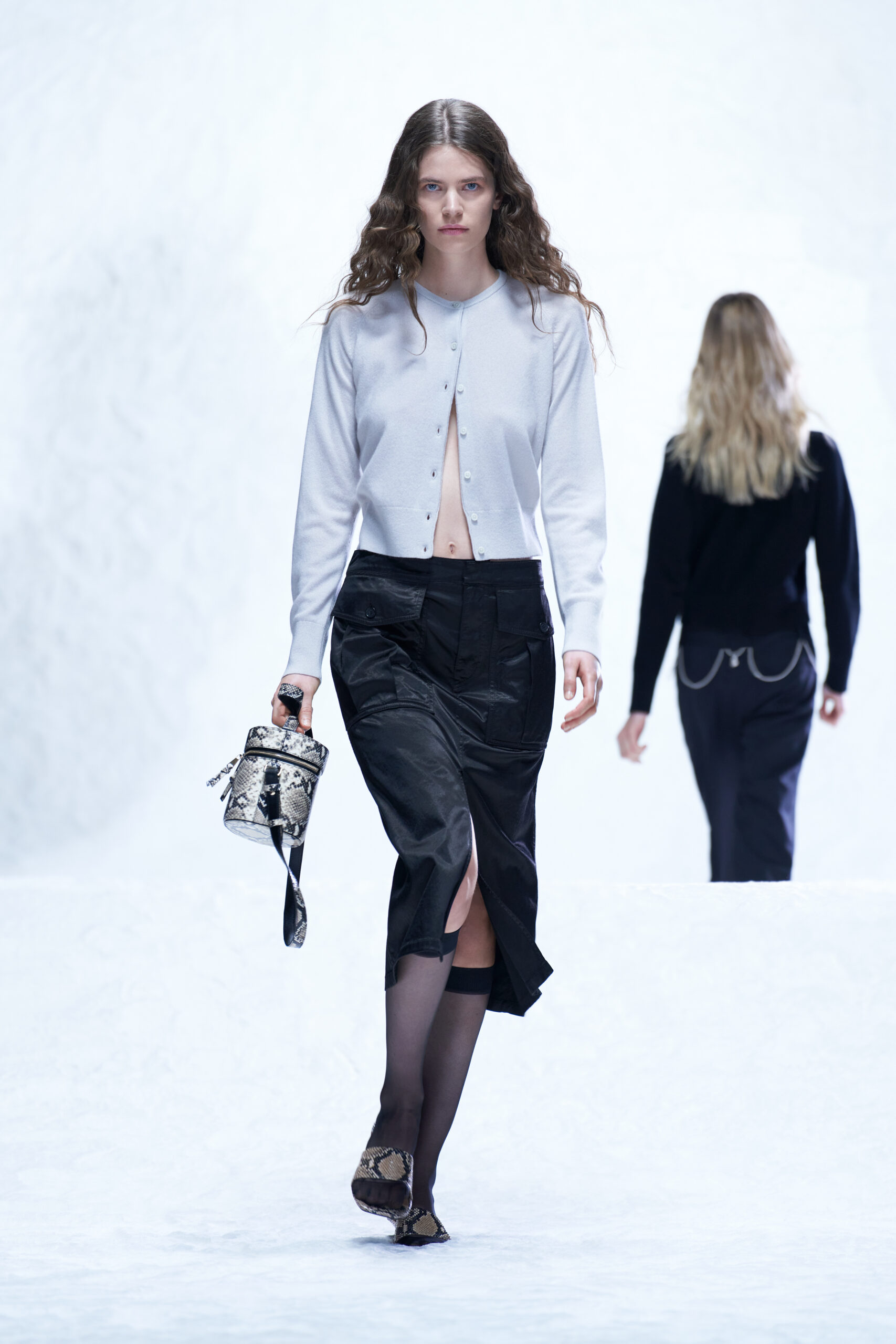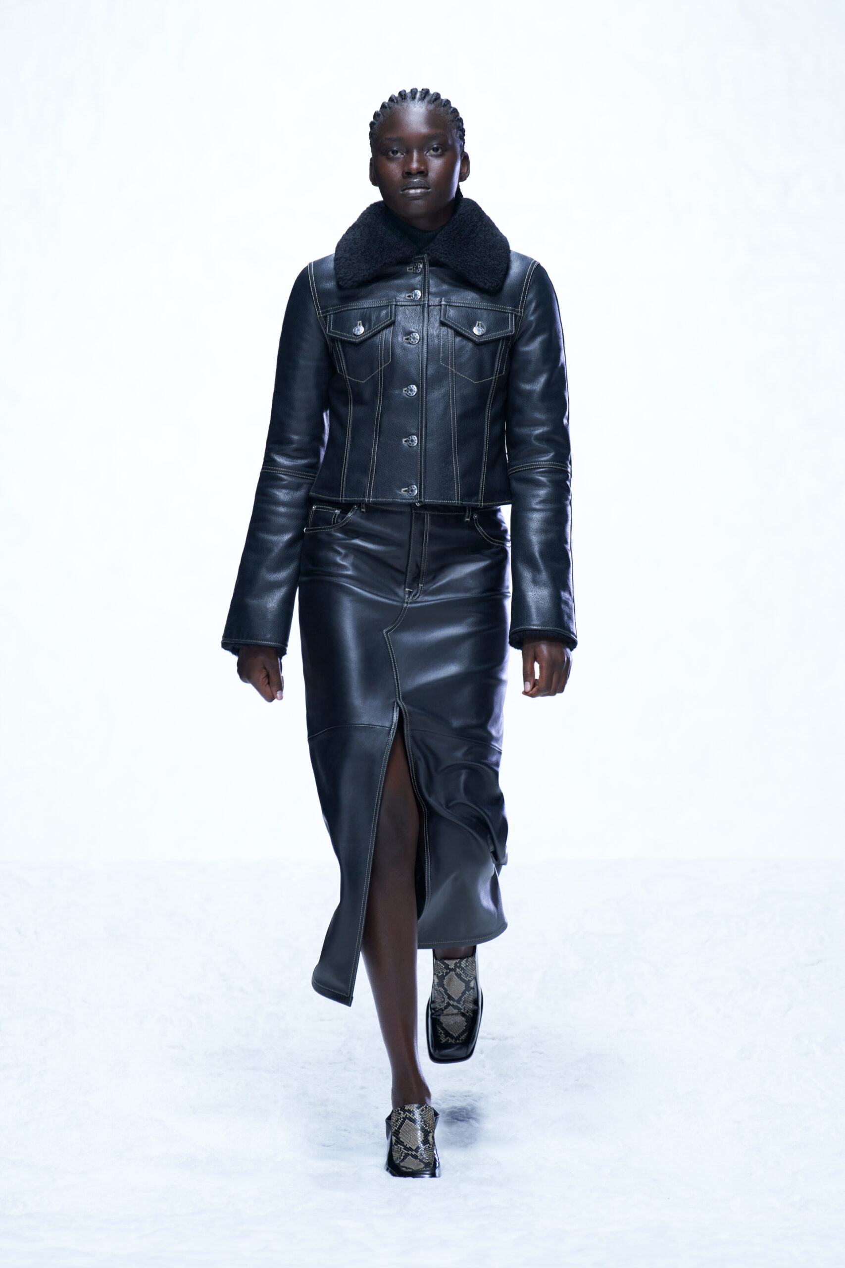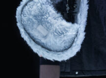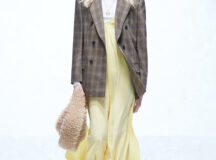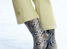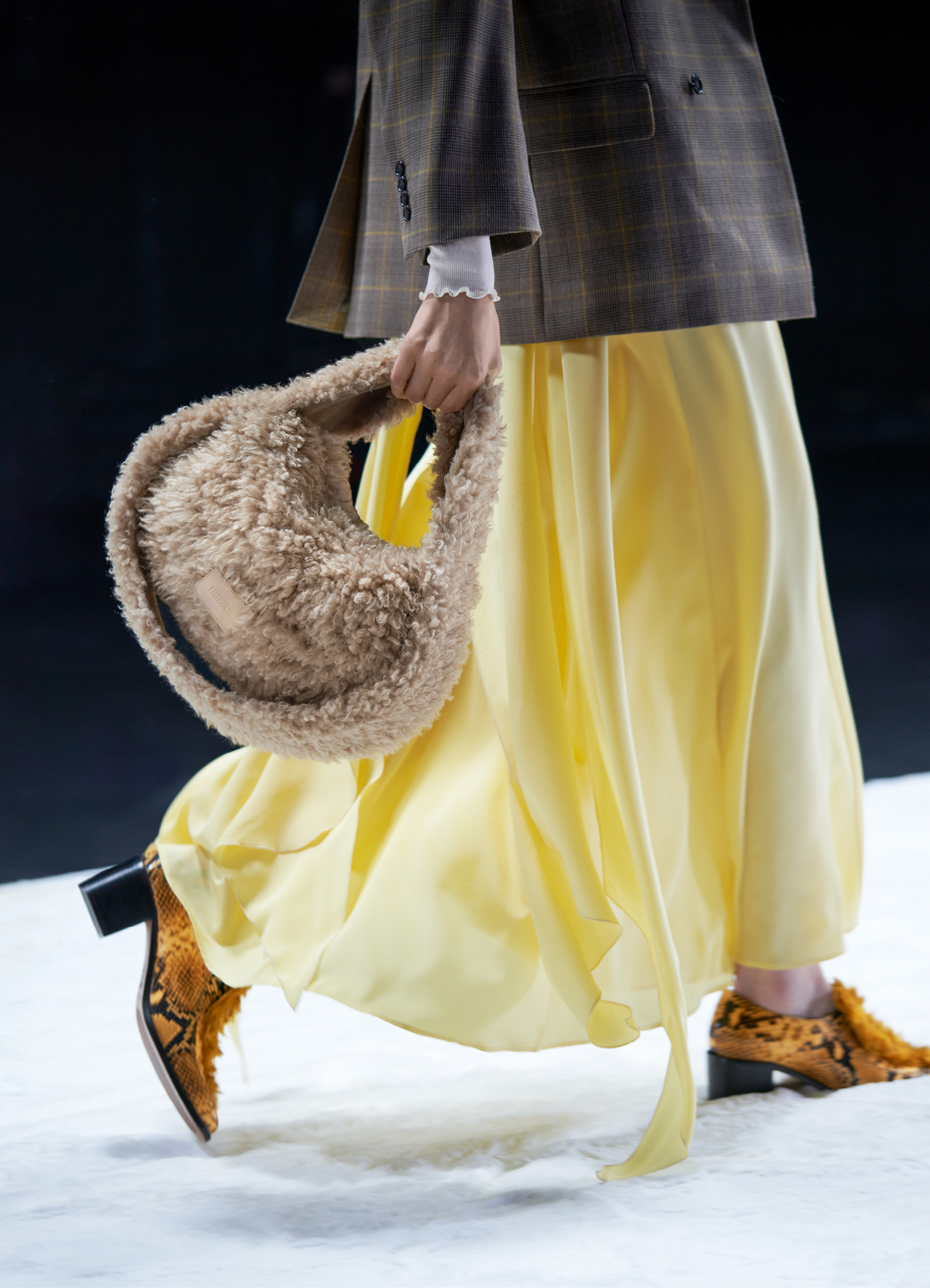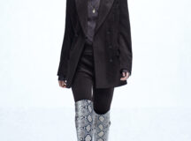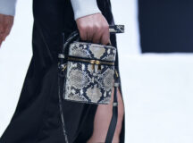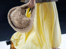 Des bottes, des mocassins et des escarpins en cuir sont ornés d’imprimés en peau de serpent, de même qu’une paire de sandales à lacets à talon. Les imprimés apparaissent également sur un sac à bandoulière structuré et un petit sac cylindrique croisé, ainsi que sur des sacs en cuir noir et en nylon. Les textures pelucheuses des années 1970 prennent forme dans le sac rond en fausse fourrure Mysa, aux côtés d’écharpes, de bonnets et de tours de cou en laine bouclée et en alpaga structuré en chevrons.