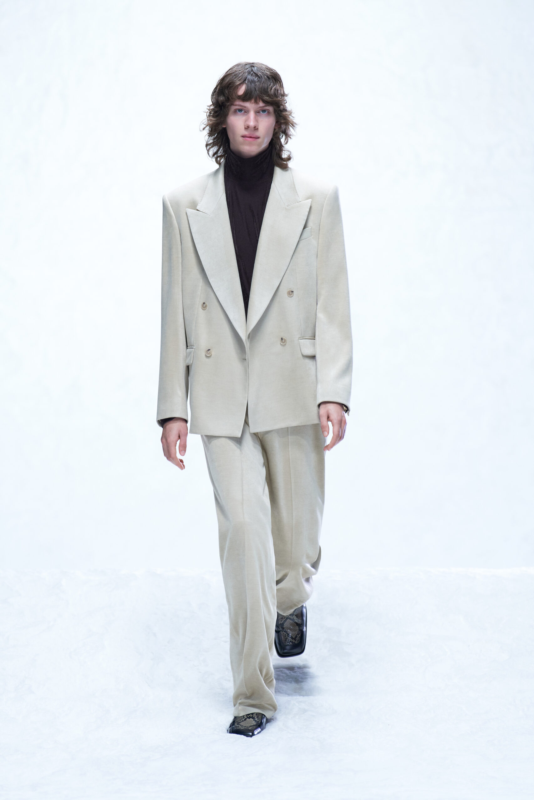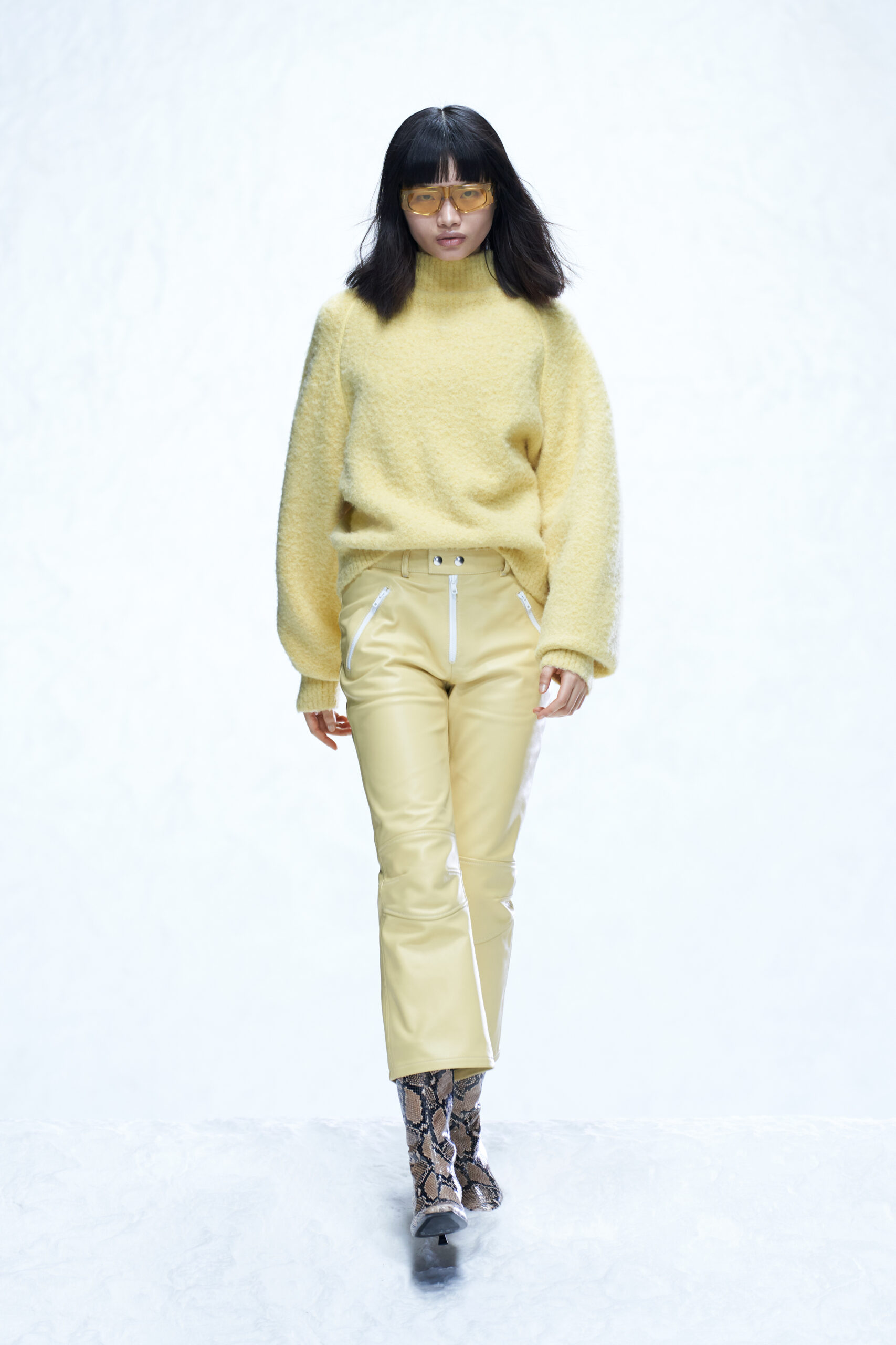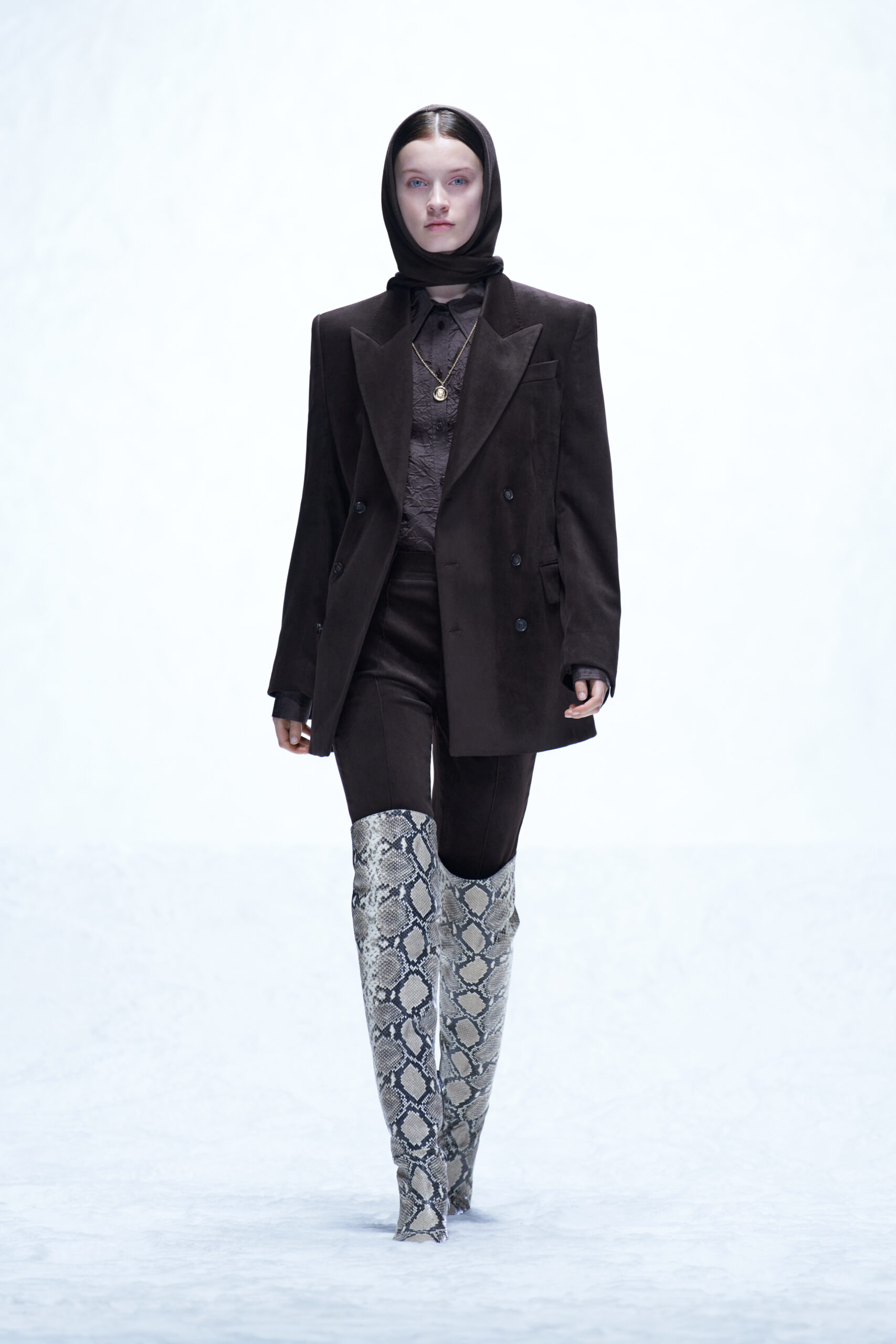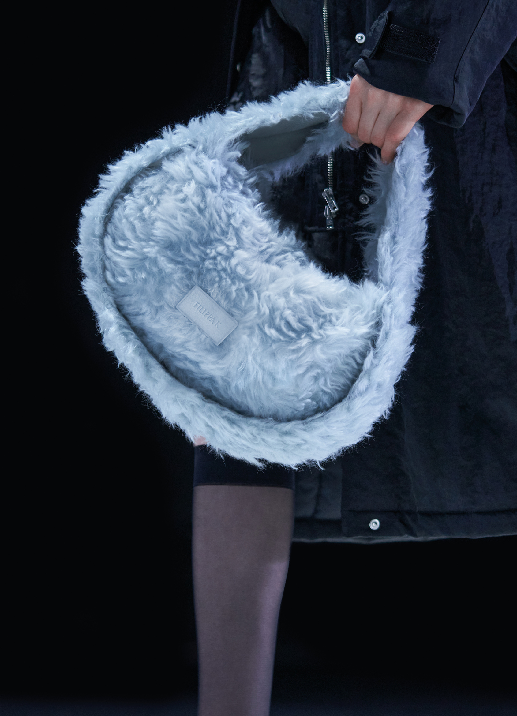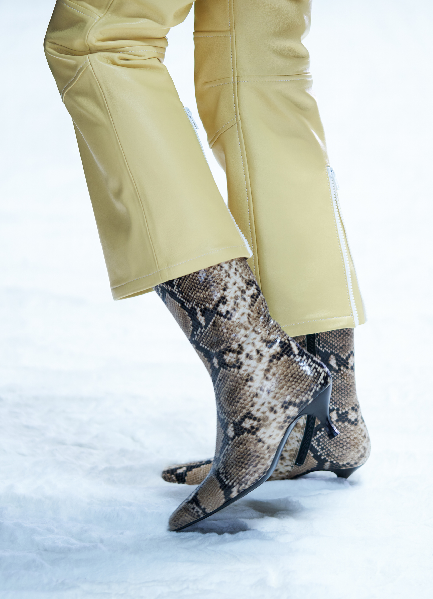 Des bottes, des mocassins et des escarpins en cuir sont ornés d’imprimés en peau de serpent, de même qu’une paire de sandales à lacets à talon. Les imprimés apparaissent également sur un sac à bandoulière structuré et un petit sac cylindrique croisé, ainsi que sur des sacs en cuir noir et en nylon. Les textures pelucheuses des années 1970 prennent forme dans le sac rond en fausse fourrure Mysa, aux côtés d’écharpes, de bonnets et de tours de cou en laine bouclée et en alpaga structuré en chevrons.