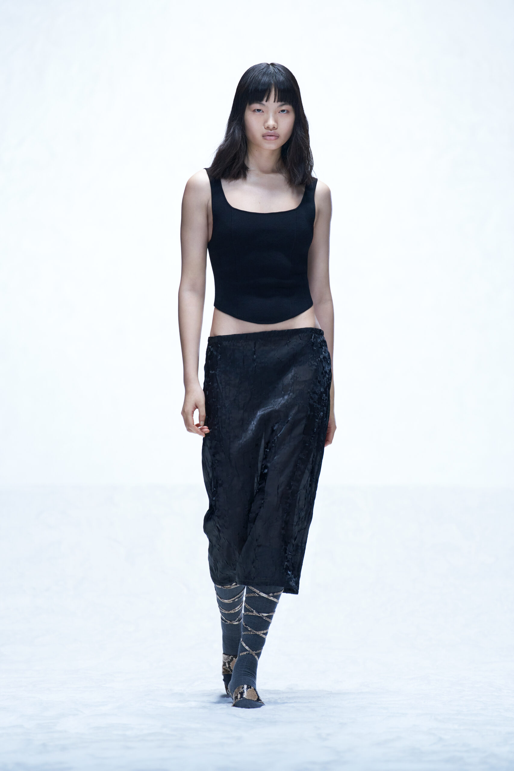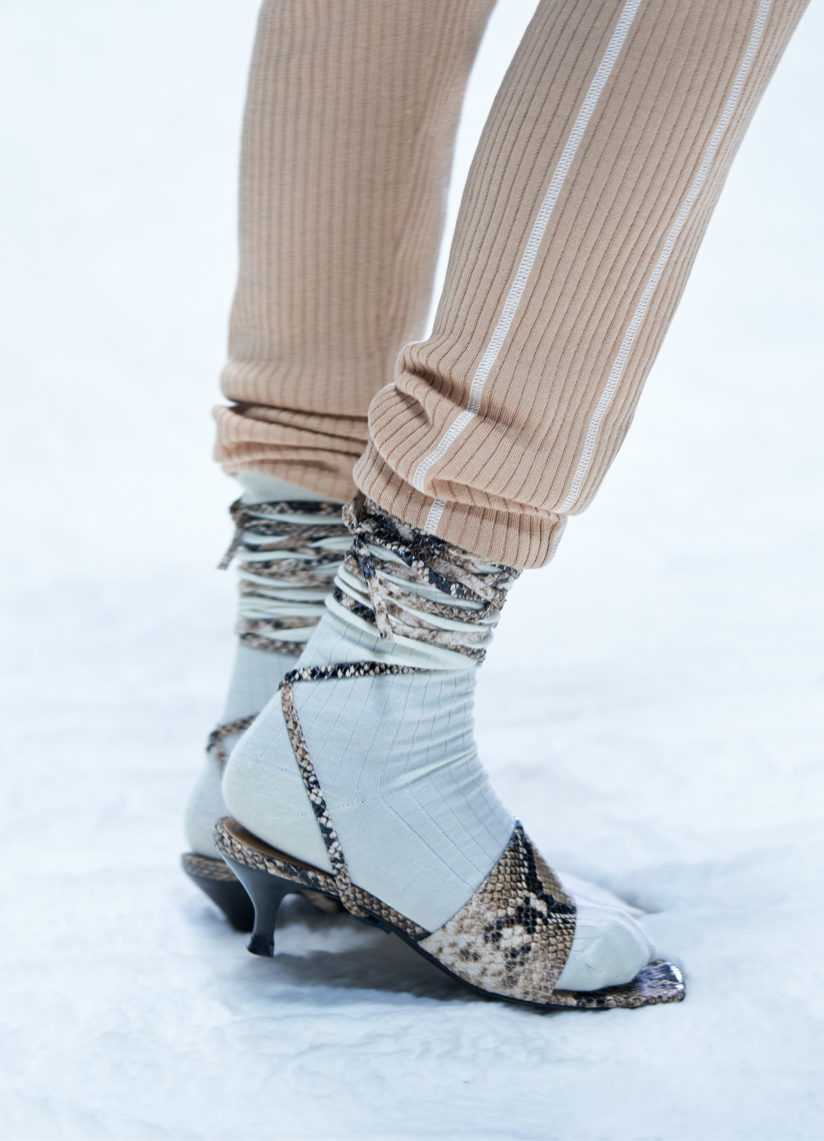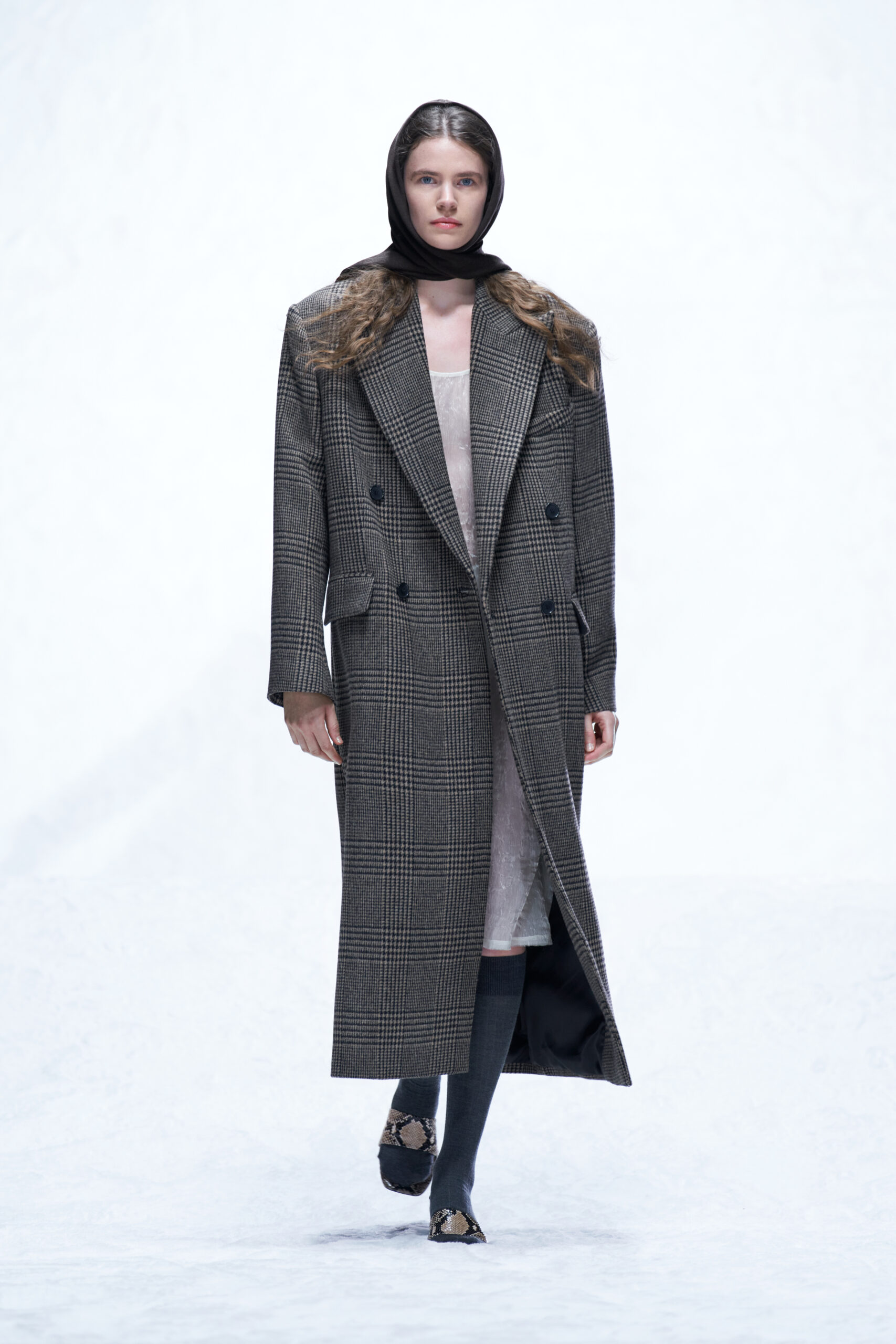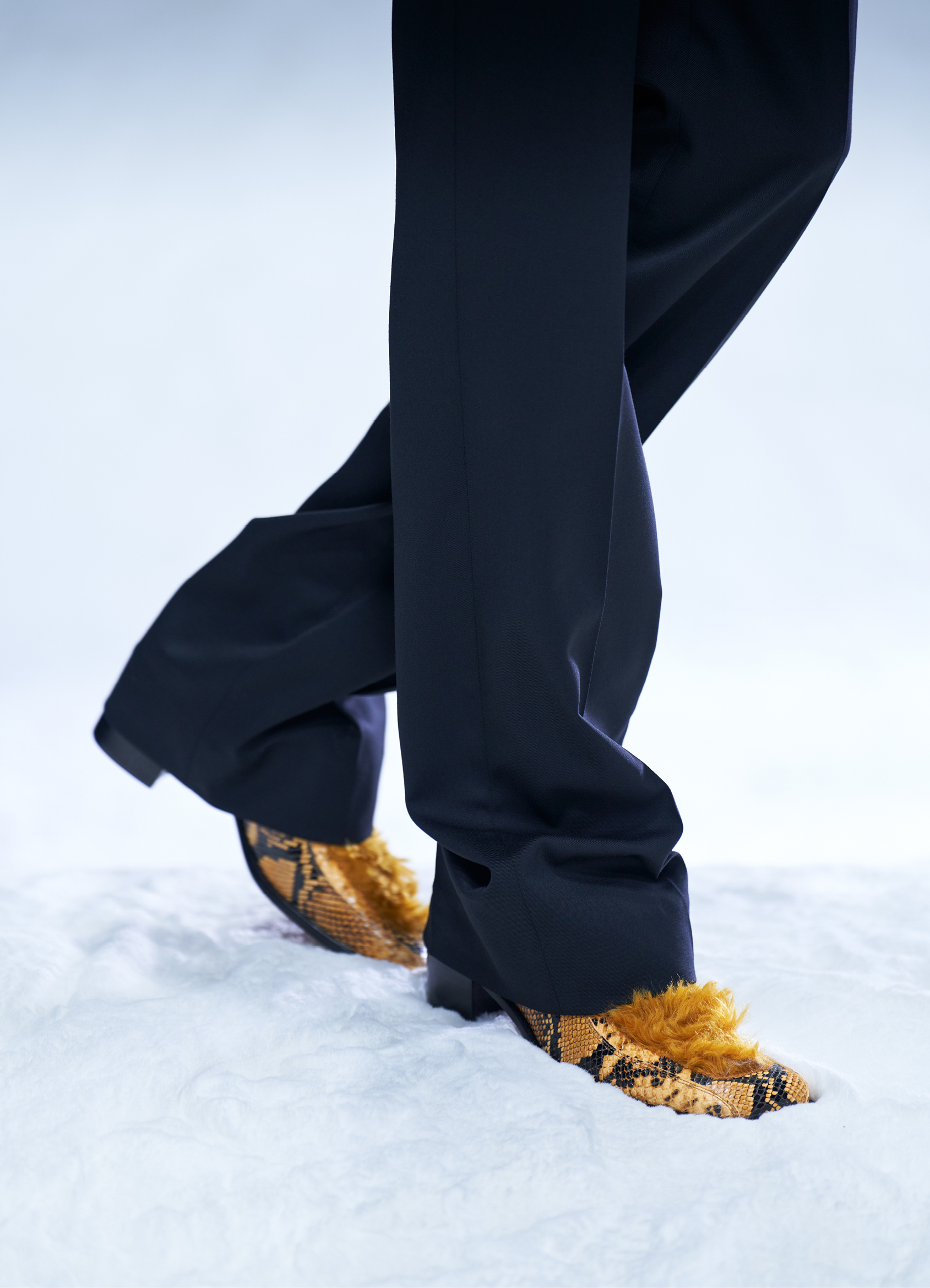 Des bottes, des mocassins et des escarpins en cuir sont ornés d’imprimés en peau de serpent, de même qu’une paire de sandales à lacets à talon. Les imprimés apparaissent également sur un sac à bandoulière structuré et un petit sac cylindrique croisé, ainsi que sur des sacs en cuir noir et en nylon. Les textures pelucheuses des années 1970 prennent forme dans le sac rond en fausse fourrure Mysa, aux côtés d’écharpes, de bonnets et de tours de cou en laine bouclée et en alpaga structuré en chevrons.