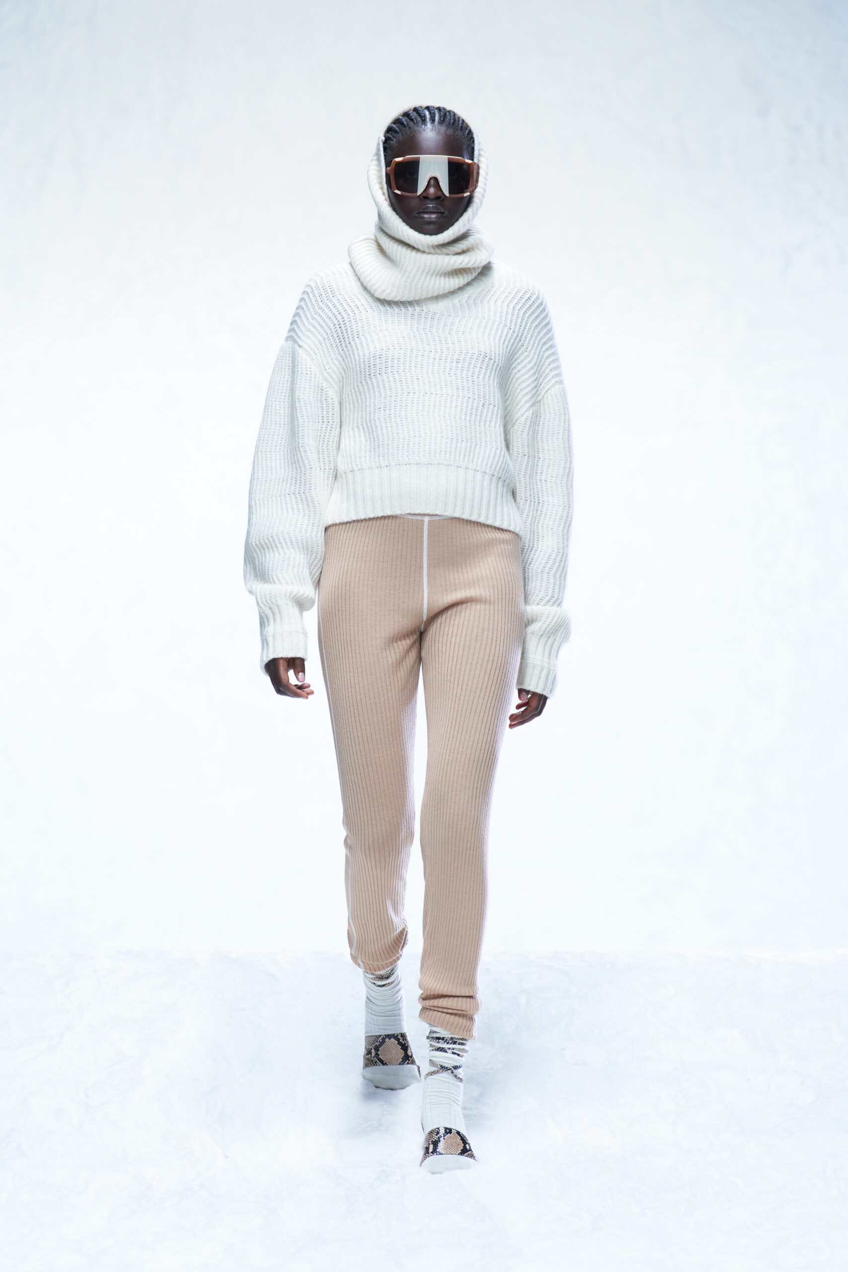 La silhouette maigre et singulière de Steiner dans les airs sert également d’inspiration esthétique à la collection, à travers des looks aux silhouettes monochromes qui s’inspirent des combinaisons de saut à ski des années 1970. Il en va de même pour les lunettes de ski techniques créées en collaboration avec la marque suédoise POC Sports, tandis que les tricots en mérinos gazeux et le jersey technique collé offrent une touche tactile.