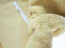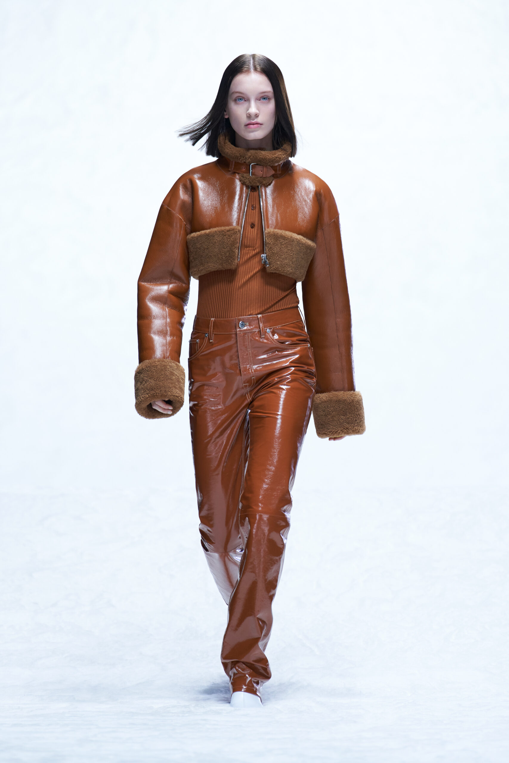 Cette perspective ne se limite pas aux tissus, les vêtements d’extérieur s’inspirent d’une veste de costume suédoise traditionnelle originaire de la région de Dalarna, rendue sous la forme d’un shearling vinyle cropped. Les fausses fourrures durables et les tricots duveteux ajoutent encore à la sensation de chaleur qui se dégage de la collection.
