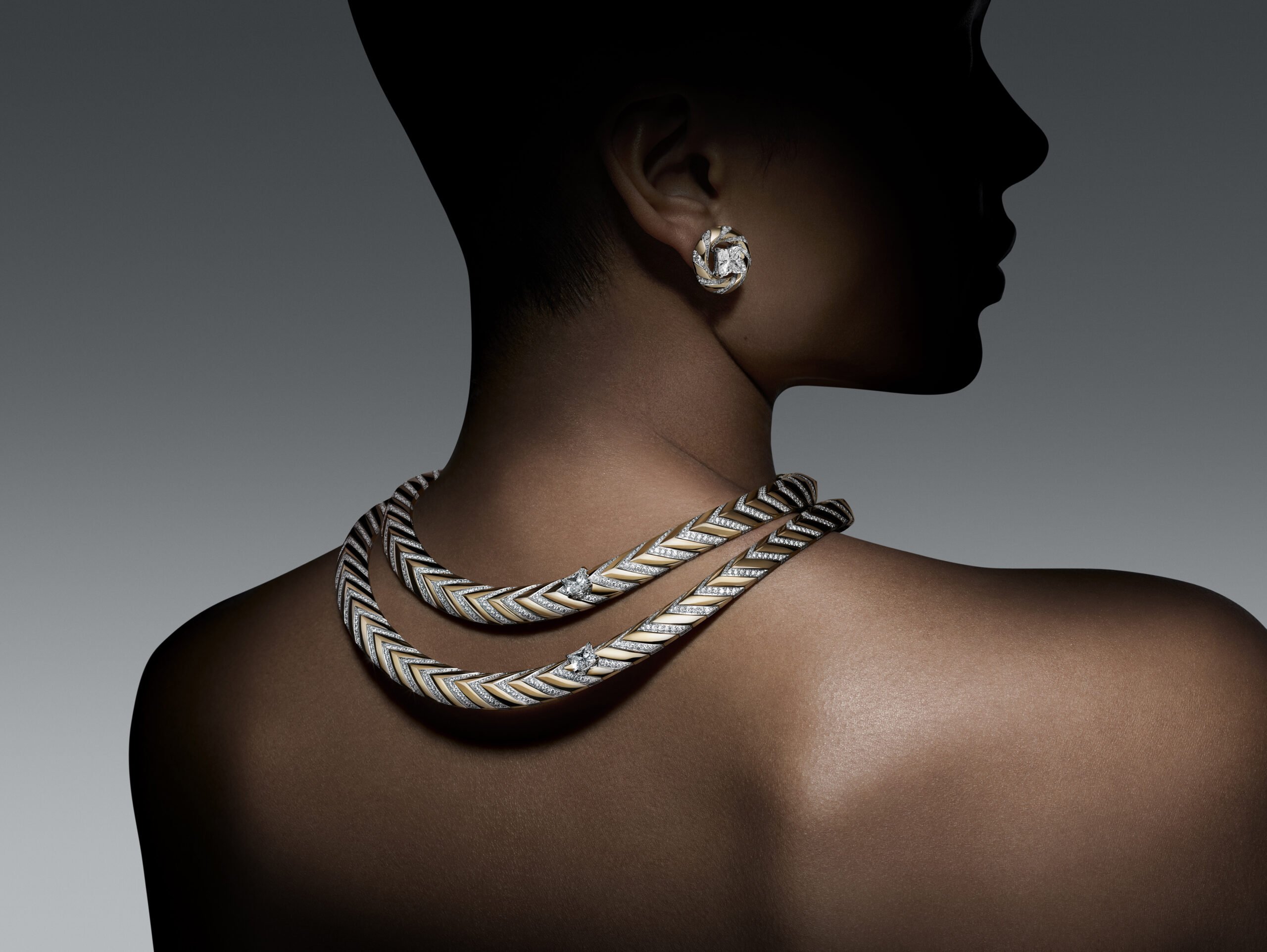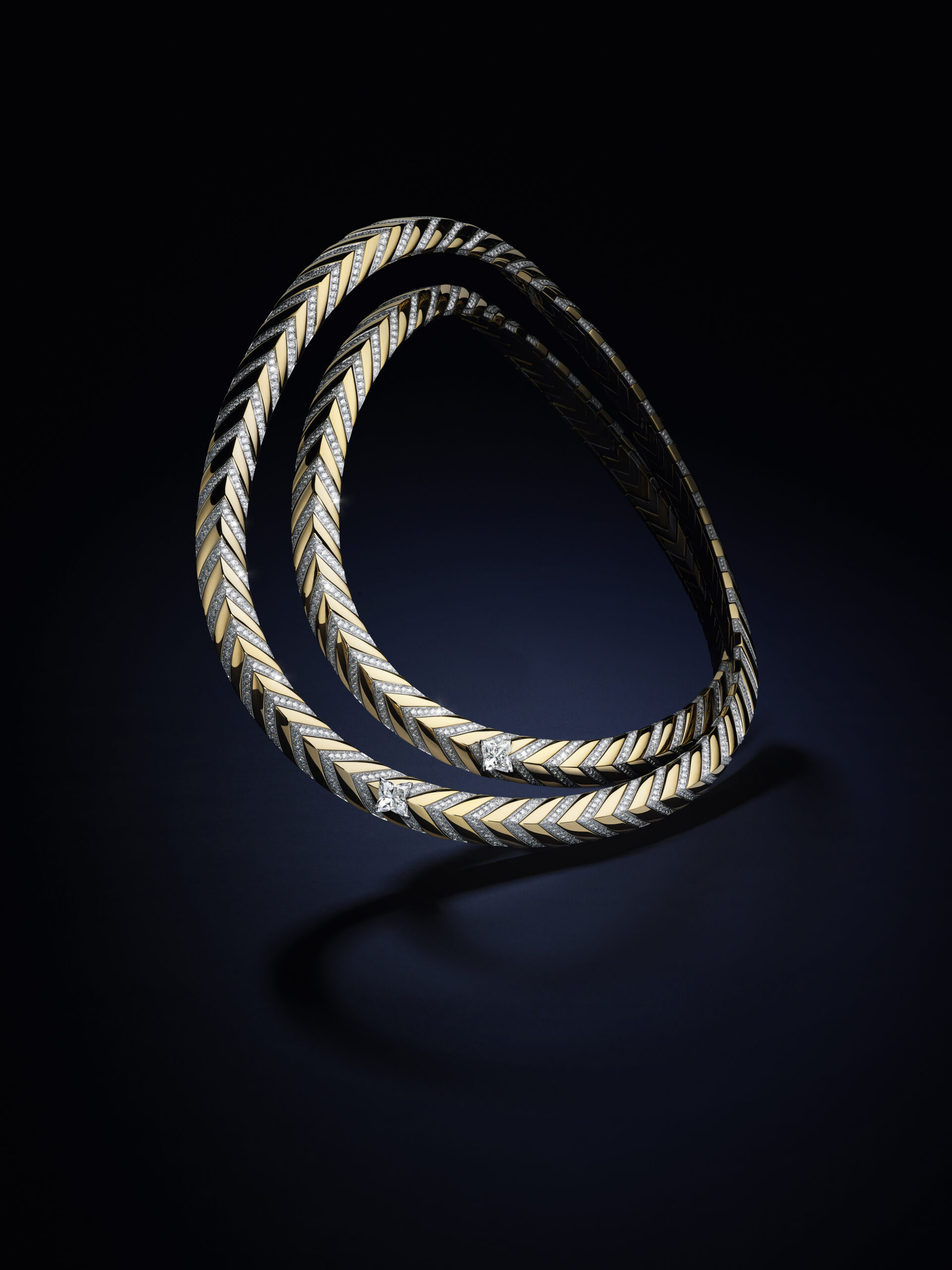 Fantasy incarne l’imaginaire de Louis Vuitton et évoque l’esprit pionnier du fondateur de la Maison. Le motif chevron est magnifié par un enchevêtrement de V lumineux en or jaune et d’étincelants diamants pavés qui convergent en un motif de flèche. Les textures bicolores donnent naissance à des joyaux exubérants au langage esthétique à la fois intense, graphique et envoûtant. Le design hypnotique du collier à deux rangs s’anime tout en souplesse d’un entrelacs de V et de chevrons d’une incroyable fluidité.