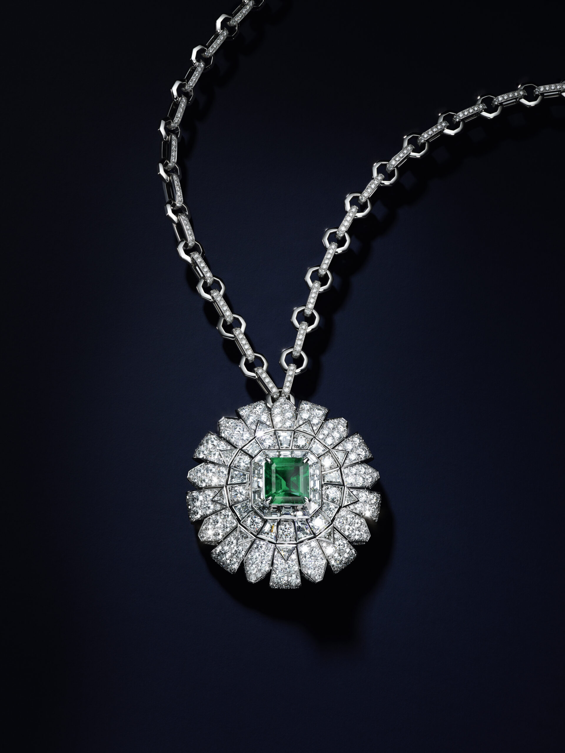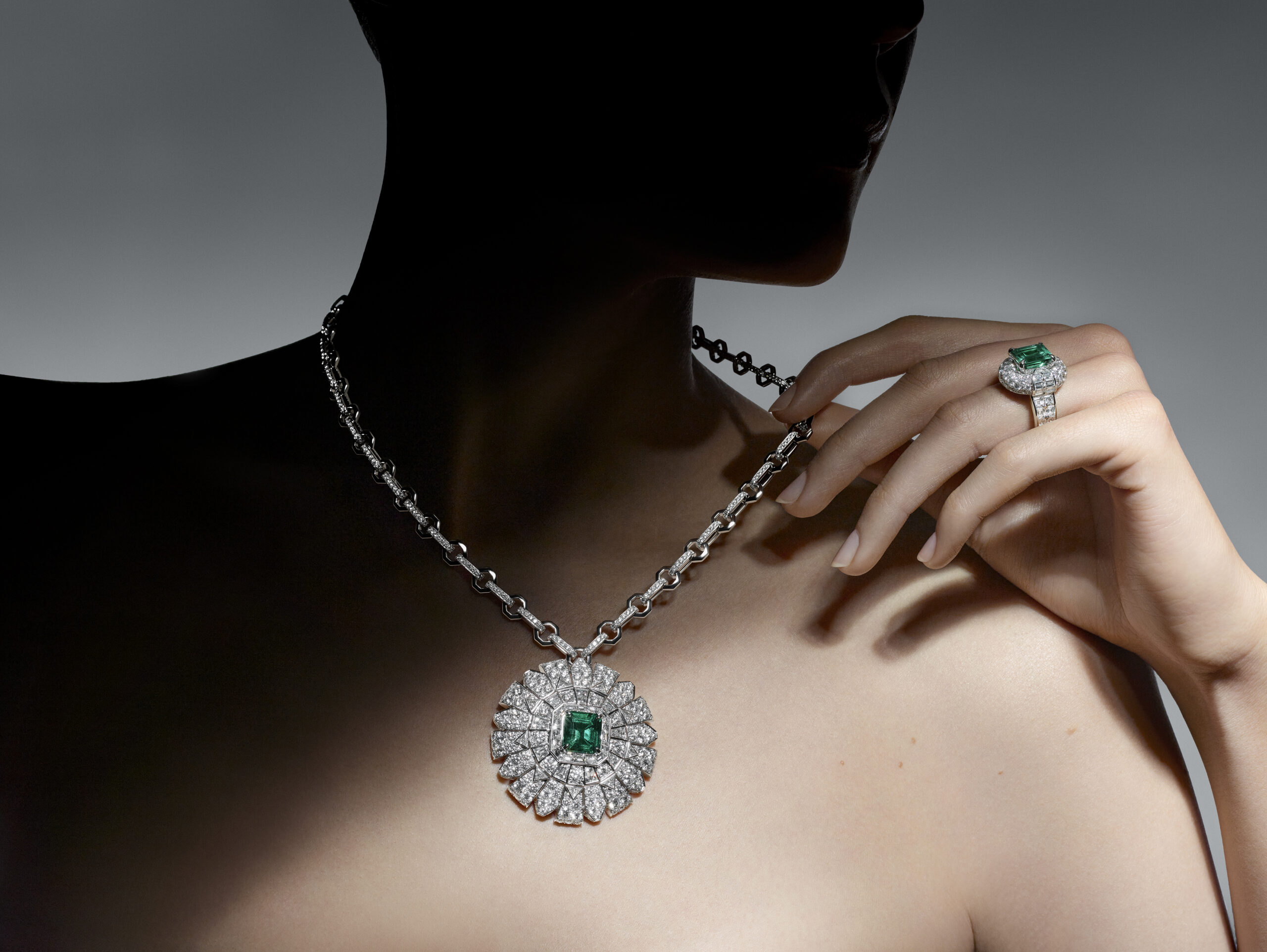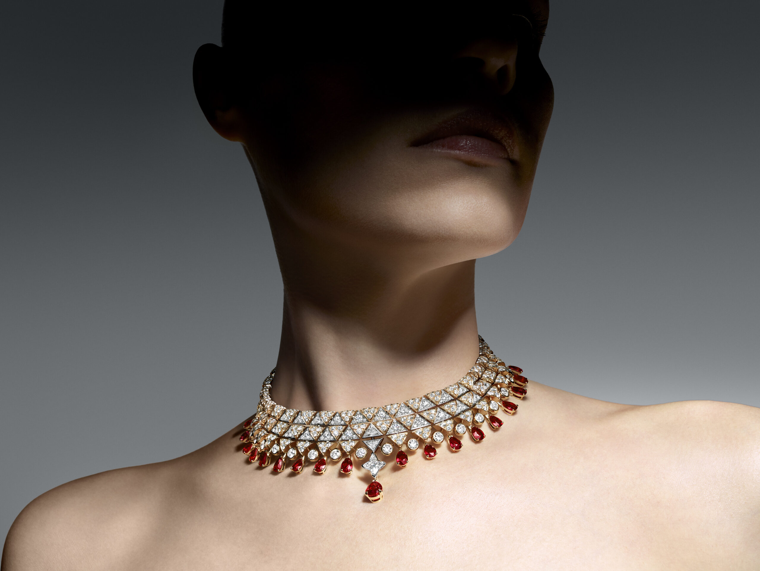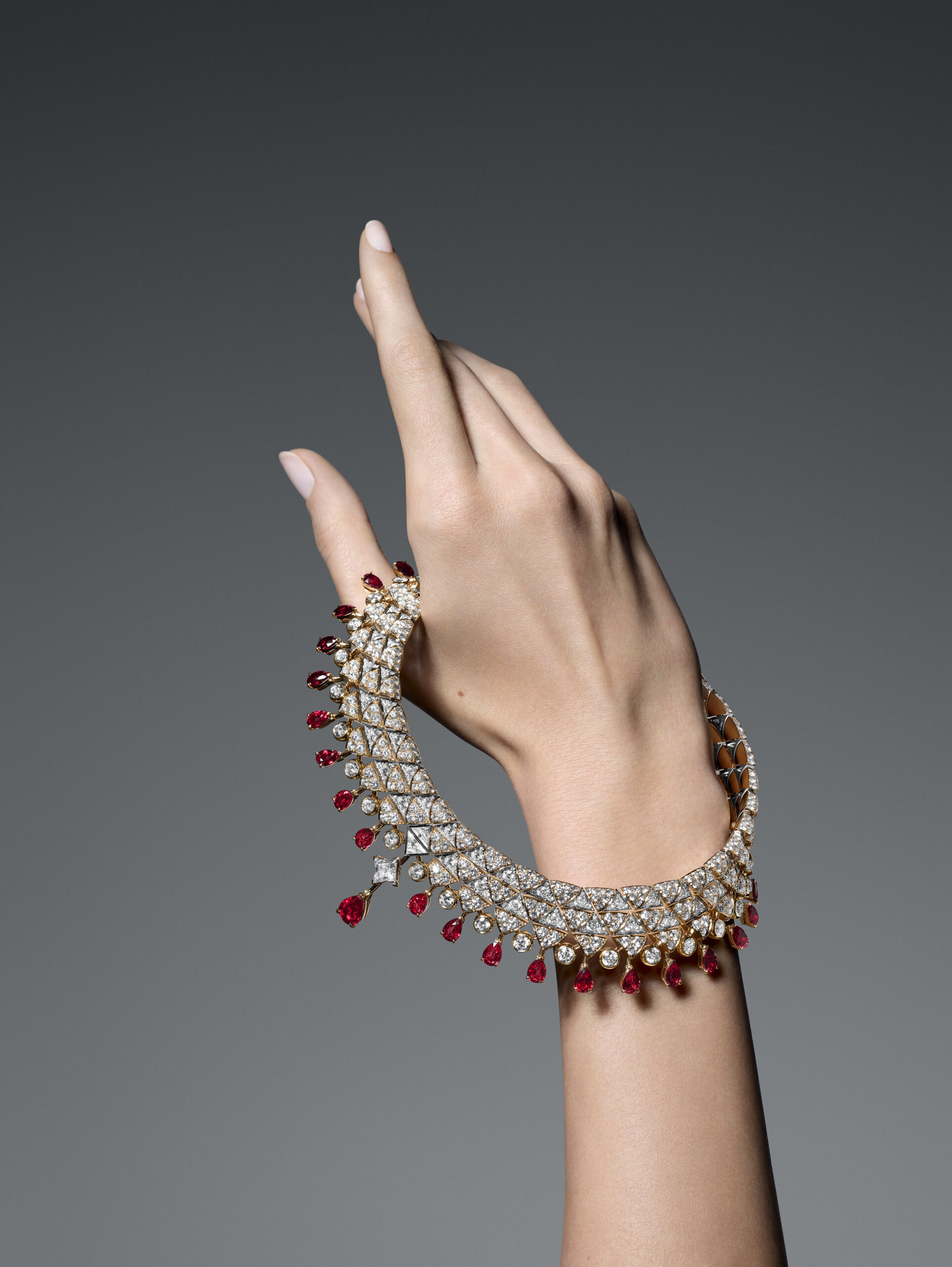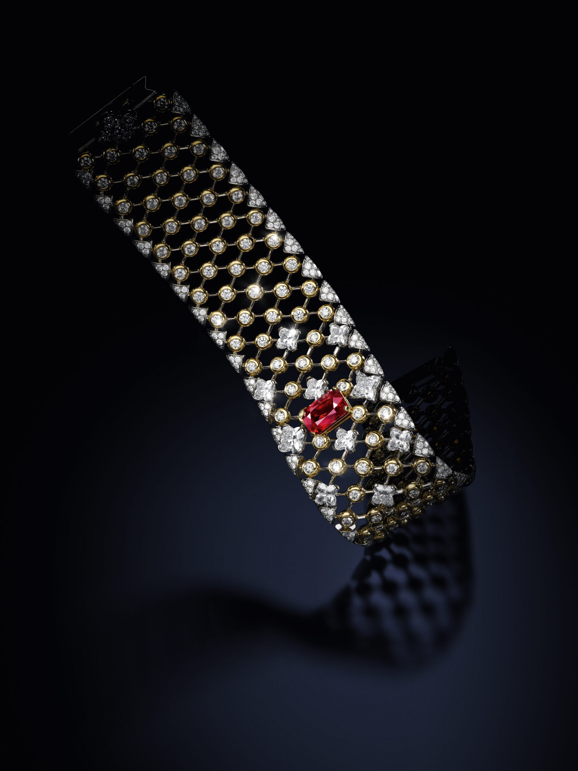 Destiny est une constellation de 10 pièces caractérisées par un rouge d’une luminosité et d’une perfection absolues. Chaque gemme semble dégager un pouvoir unique. Le motif puissant du V, qui rend hommage au dynamisme de la Maison, est mis en avant dans cette collection. La composition de chaque pièce est ornée de V et de triangles ornés de V de tailles différentes. Un rubis « pigeon blood » taille poire de 3,13 carats arrimé à un diamant LV Monogram cut est le point culminant du splendide collier de cette parure.