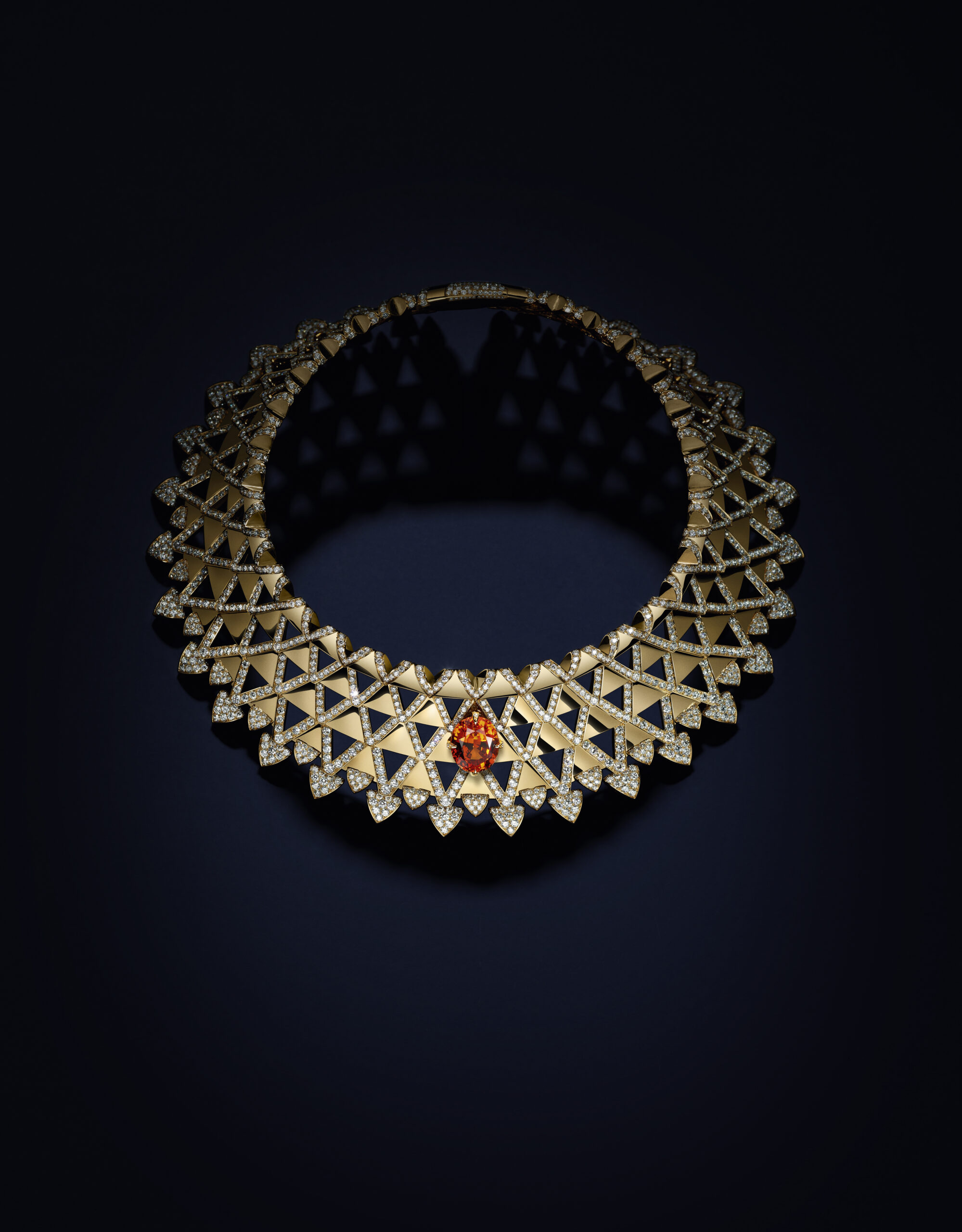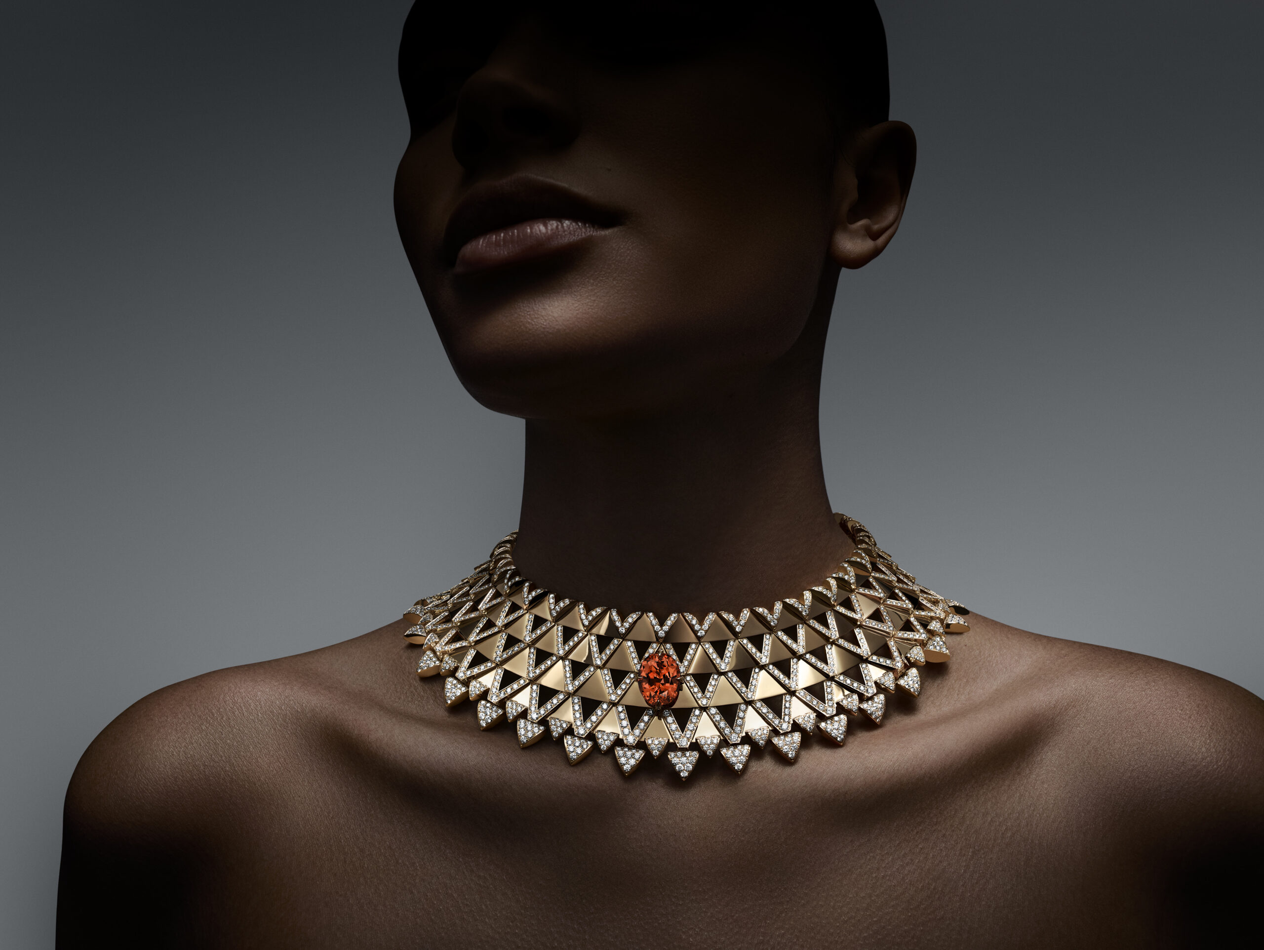Radiance exhale une énergie audacieuse soulignée par des triangles d’or jaune miroir qui mettent en scène une géométrie de pyramides et de V pavés de diamants. Le design affirmé du collier est souligné par un chaleureux et sensuel grenat mandarin spessartite de 17,48 carats.