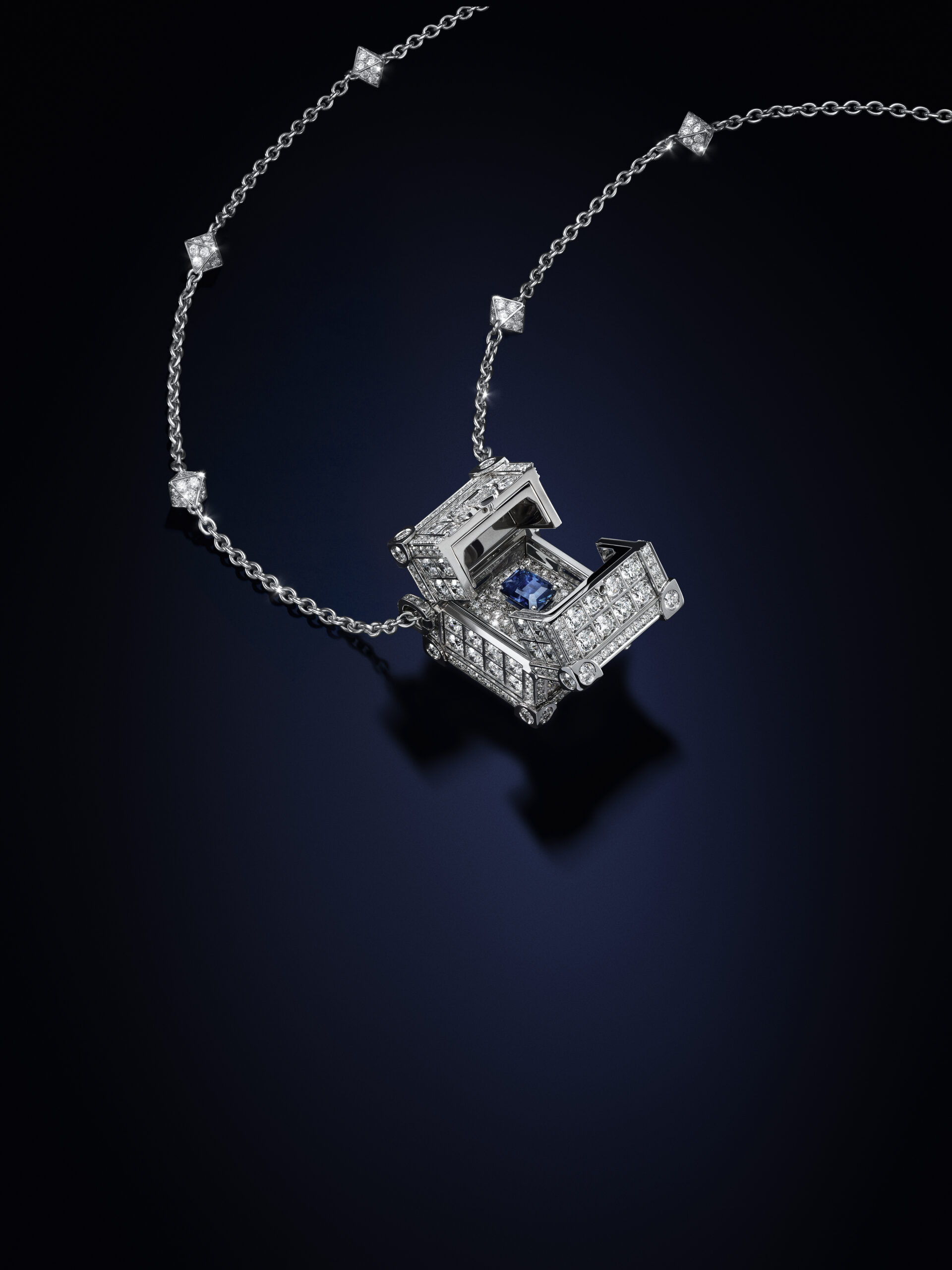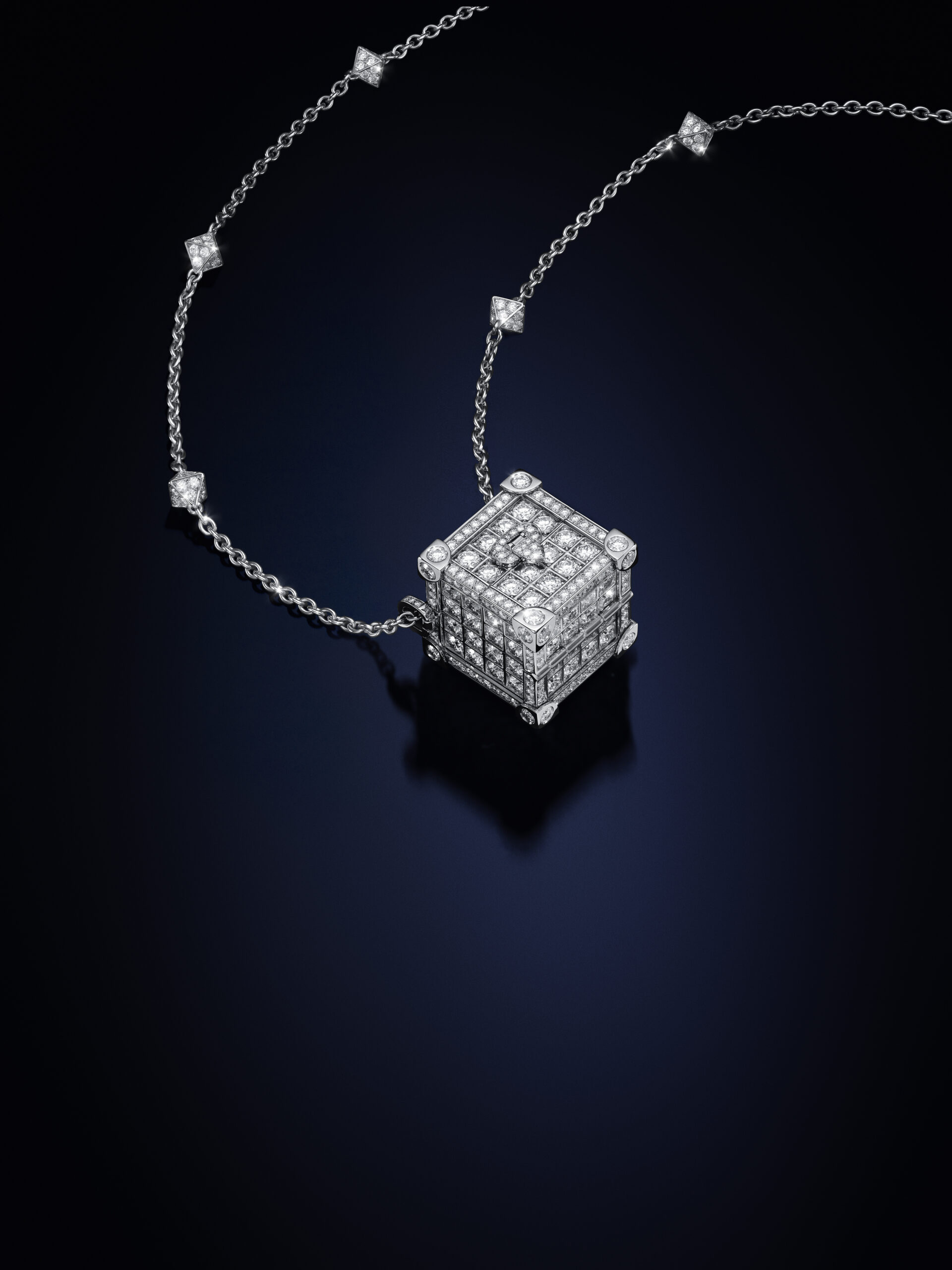 Liberty incarne le désir de liberté qui guide Louis Vuitton depuis toujours. Dans cet univers, une mosaïque de diamants taillés sur œuvre et de diamants LV Monogram cut donne naissance à une vision unique et un langage esthétique reconnaissable entre tous. Le Damier se dessine sous la forme d’un entrelacs de plus de 195 diamants taillés sur œuvre sur un éblouissant plastron qui réunit tous les codes signature de la Maison. Plus de 1 300 heures d’ouvrage ont été nécessaires à sa réalisation.