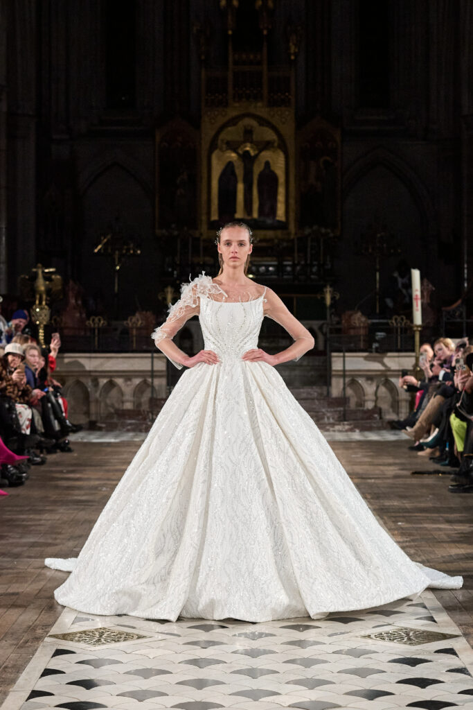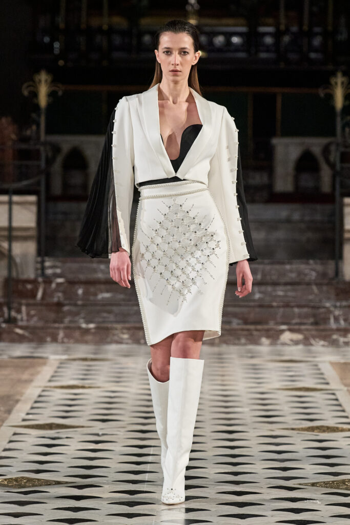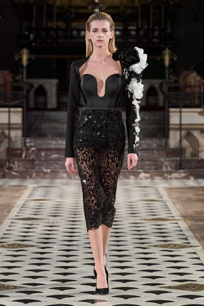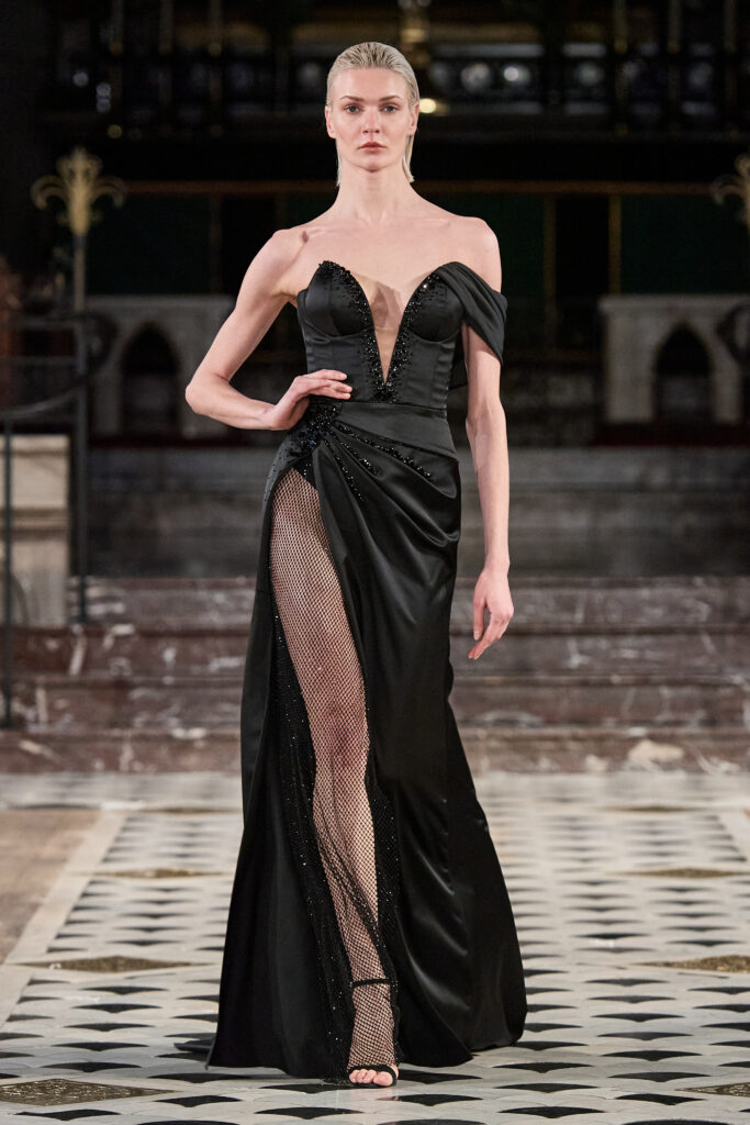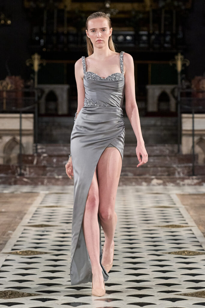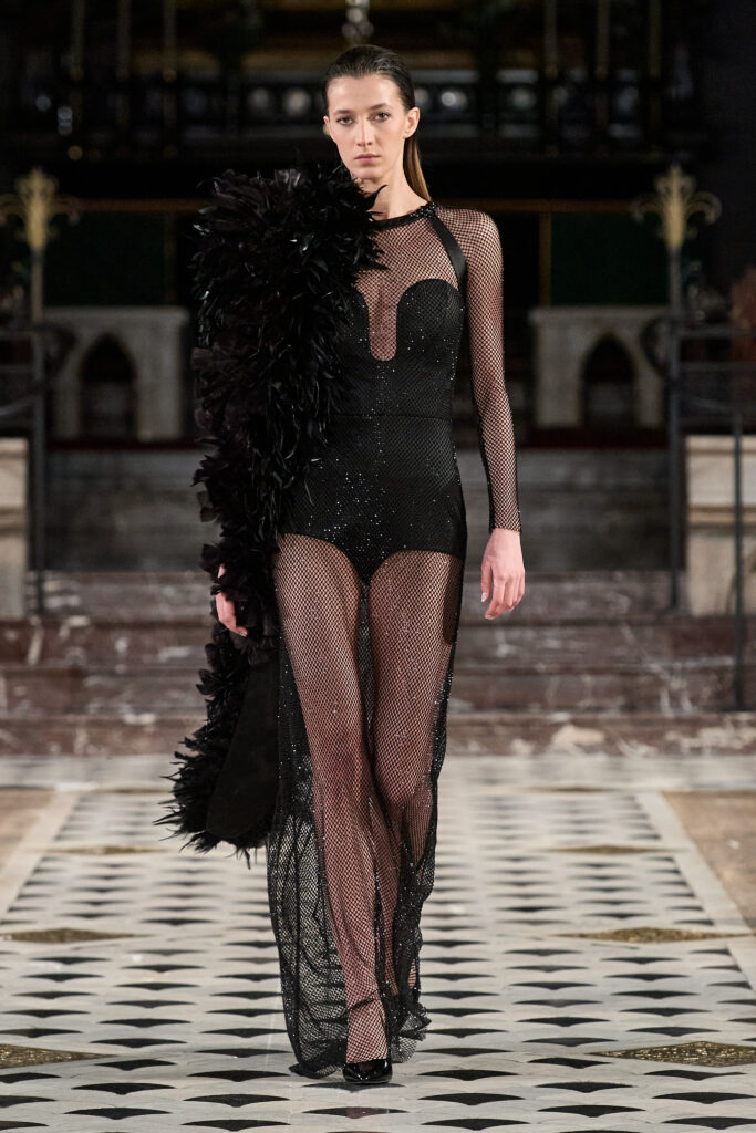 La collection commence par des modèles noirs et blancs qui sont complétés par des fleurs en organza faites à la main, des motifs perlés cousus à la main et des plumes d’autruche et de cygne. Ensuite, des robes grises et cristallines sont présentées avec des applications florales en plumes et en organza. Des sacs à main en plumes sont également inclus dans la collection, complétés par des pierres.