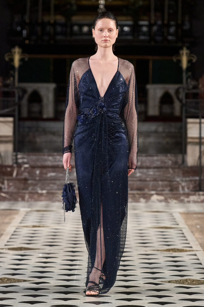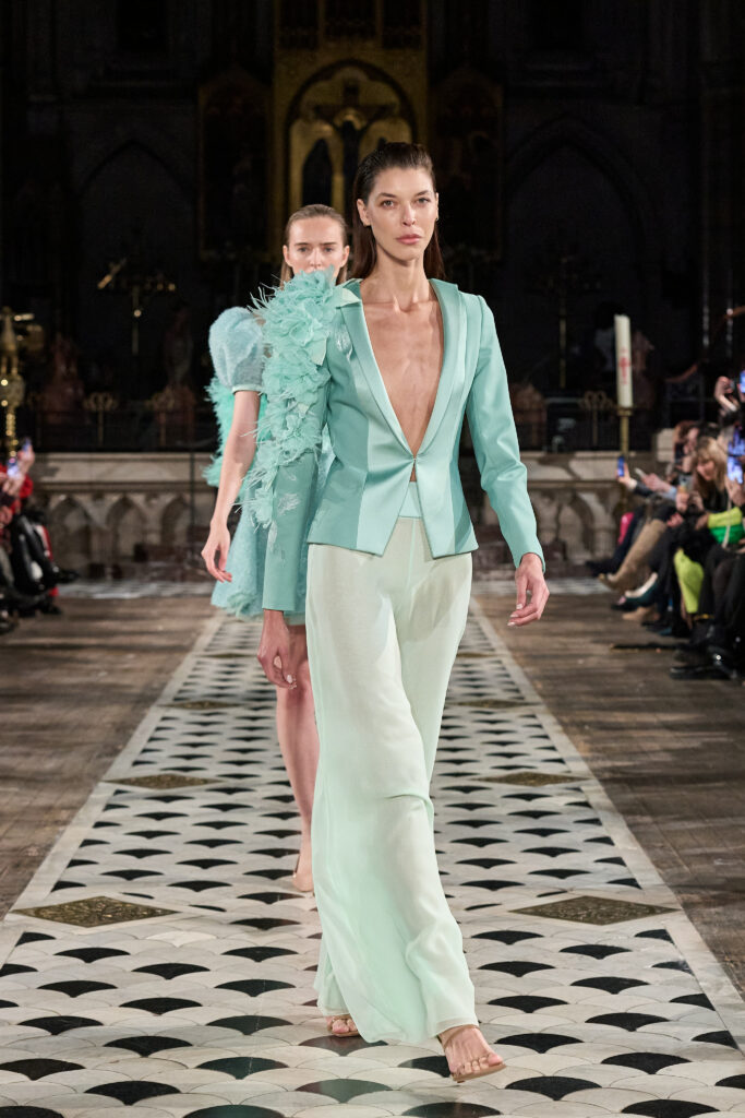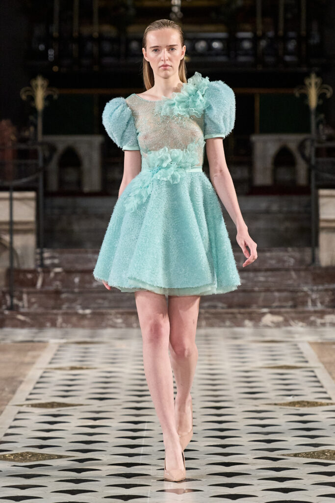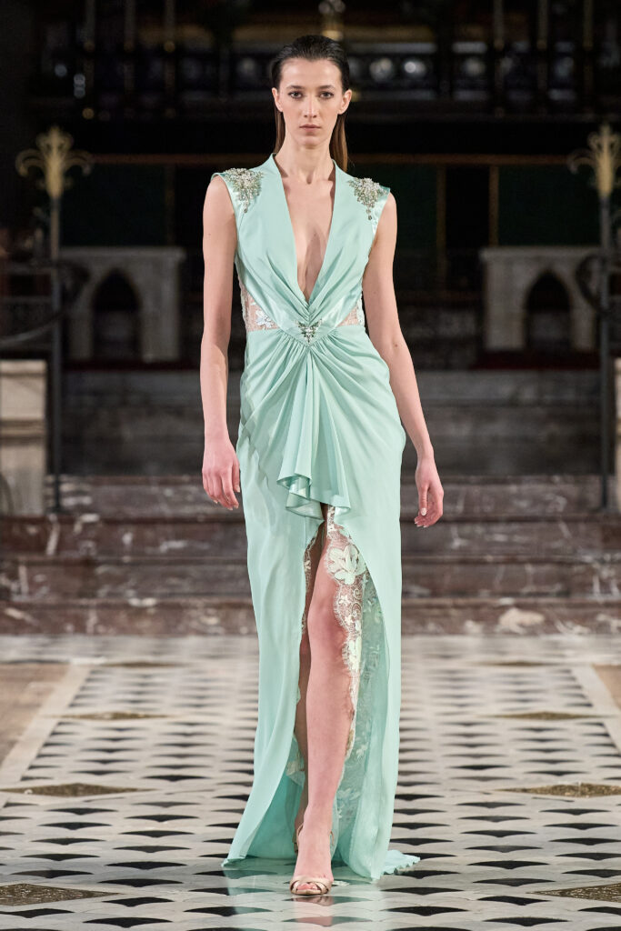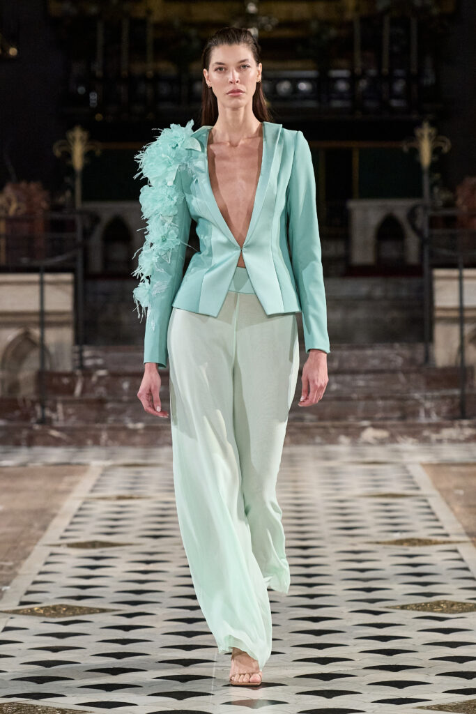 La collection se poursuit avec des nuances de bleu marine étincelant dans un tailleur pantalon en mousseline de soie complété par des applications florales. Des nuances de vert menthe sont également présentes dans la collection, avec des manches d’autruche et des applications 3D faites à la main dans des formes florales et de l’or champagne.